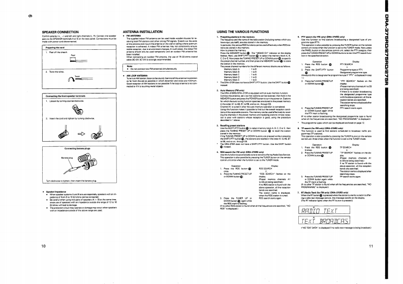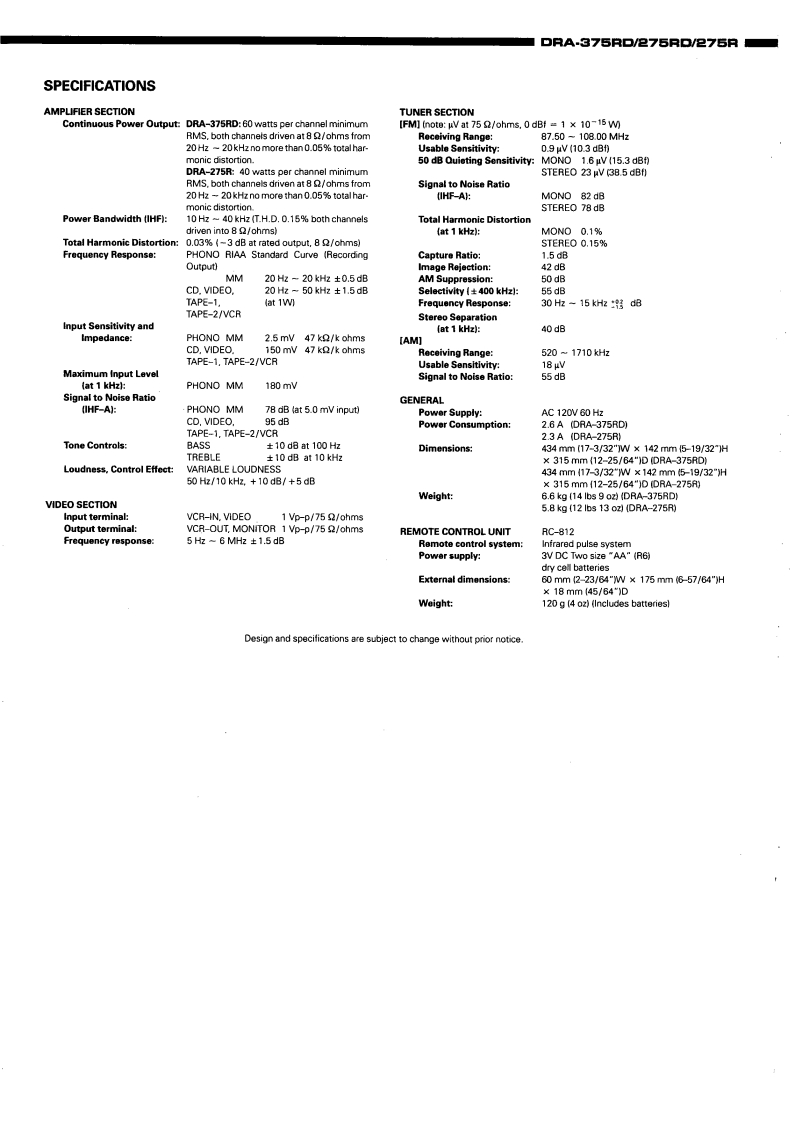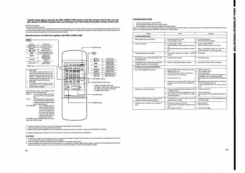 DENONHi-Fi AM-FM Stereo ReceiverSERVICE MANUALMODEL DRA-375RDMODEL DRA-275RD/275RAM-FM STEREO RECEIVERinmmiiinn石66名等0时δDRA-375RD/275RDwHNiinfni石66B6白白δδδDRA-275R-TABLE OF CONTENTS-OPERATING INSTRUCTIONS.3DISASSEMBLYWIRE ARRANGEMENT11METHOD OF ADJUSTMENT..BLOCK LEVEL DIAGRAM.SEMICONDUCTORS.15-20PRINTED WIRING BOARD PATTERNS....MAIN UNIT.21-231DISPLAY UNIT22TUNER UNIT.3NOTE FOR PARTS LIST.........24PRINTED WIRING BOARD PATTERNSEXPLODED VIEW OF CHASSIS AND CABINET......25.30PARTS LIST OF EXPLODED VIEW...WIRING DIAGRAM.....2SCHEMATIC DIAGRAM....…33,34.Some illustration using in this service manual is slightly different from the actual set.NIPPON COLUMBIA CO.LTD.