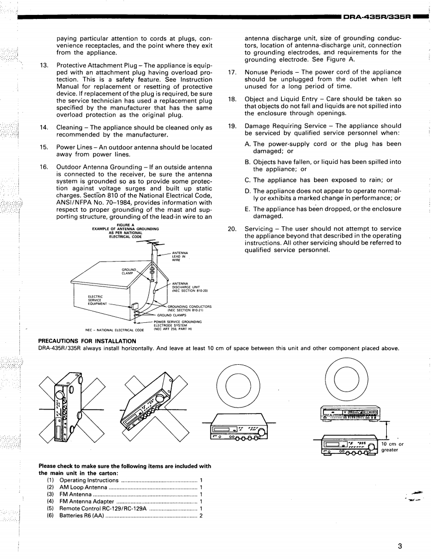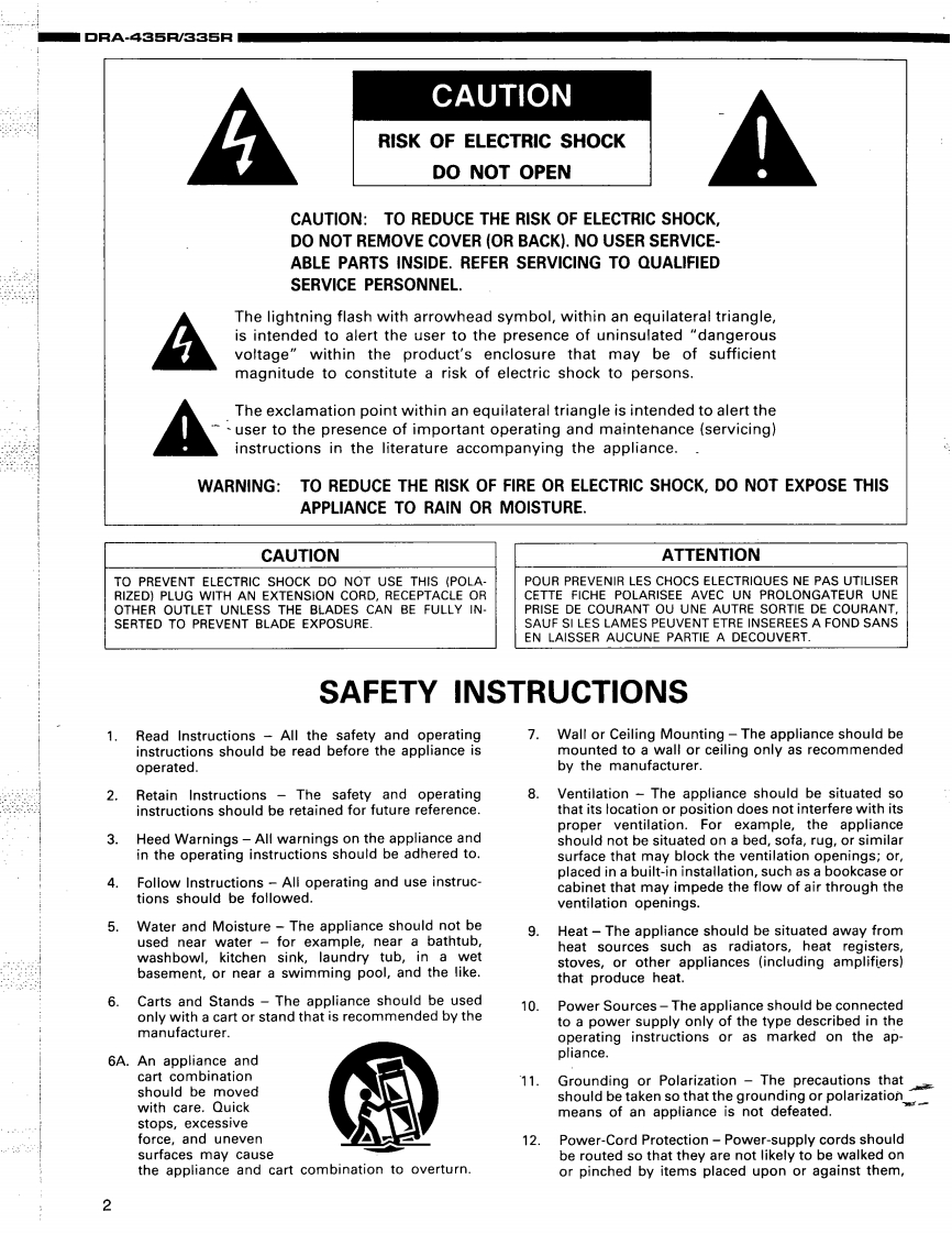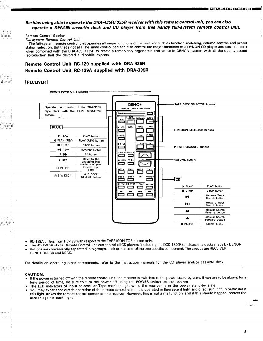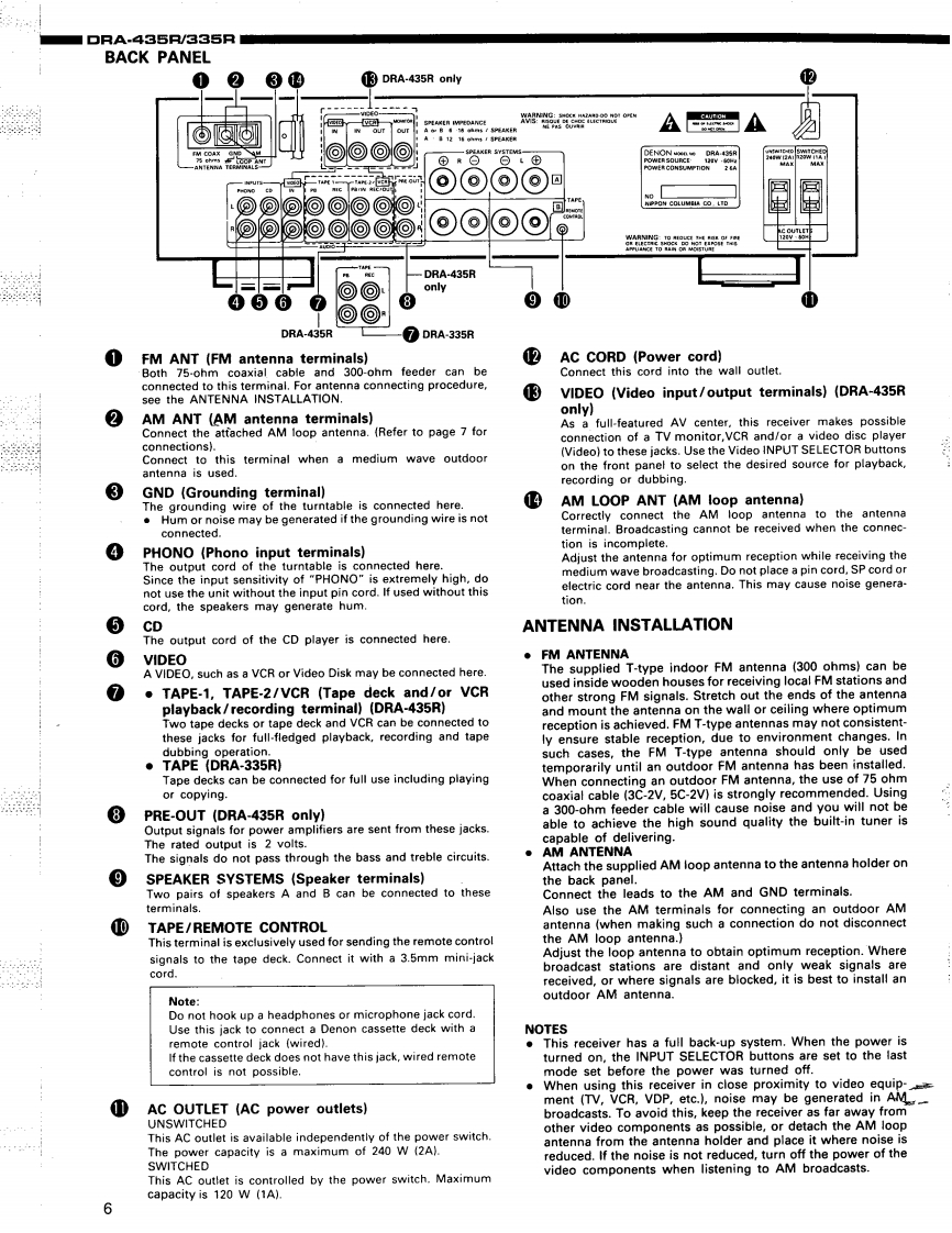 DENONHi-Fi AM-FM Stereo ReceiverSERVICE MANUALFor U.S.A.ModelODEL DRA·435RSerial No.25551 and afterMODEL DRA·335RSerial No.38551 and afterAM-FM STEREO RECEIVERDRA-435RRC-129DRA-335RRC-129ATABLE OF CONTENTSOPERATING INSTRUCTIONS.............................................2-11REMOVALOF EACH SECTION ...........................................12,13METHOD OF ADJUSTMENTS.............................................14,15CONNECTION DIAGRAM OF MEASURING INSTRUMENTS16BLOCK/LEVEL DIAGRAM(DRA-435R)BLOCK/LEVEL DIAGRAM(DRA-335R)1PARTS LIST OF EXPLODED VIEW18EXPLODED VIEW OF CHASSIS AND CABINET19NOTE ON PARTS LIST…20PRINTED WIRING BOARD PARTS LIST20-24PRINTED WIRING BOARD PATTERNS25-271U-2345A MAIN UNIT (DRA-435R)251U-2344A MAIN UNIT (DRA-335R)21U-2346AMl-COM UNIT(DRA-435R/335)....:........271U-2347A TUNER UNIT(DRA-435R/335R)21U-2348A VIDEO UNIT(DRA-435R)27SEMICONDUCTORS28,WIRING DIAGRAM..…30SCHEMATIC DIAGRAM (for DRA-435R)3SCHEMATIC DIAGRAM (for DRA-335R)NIPPON COLUMBIA CO.,LTD.