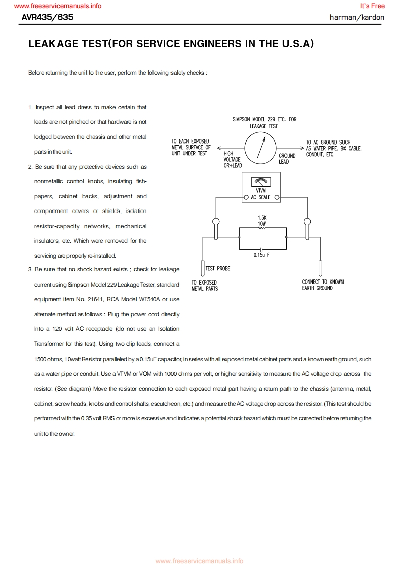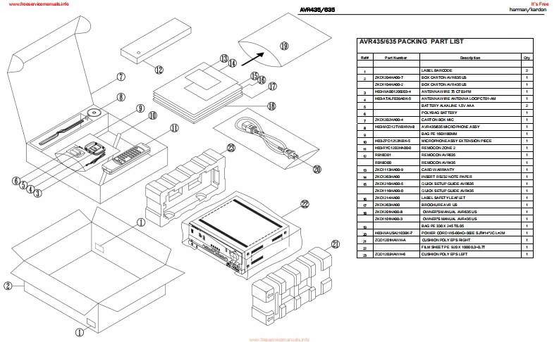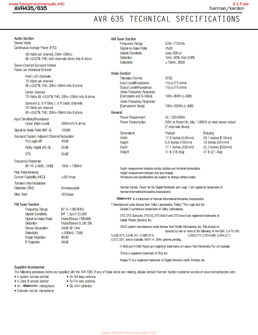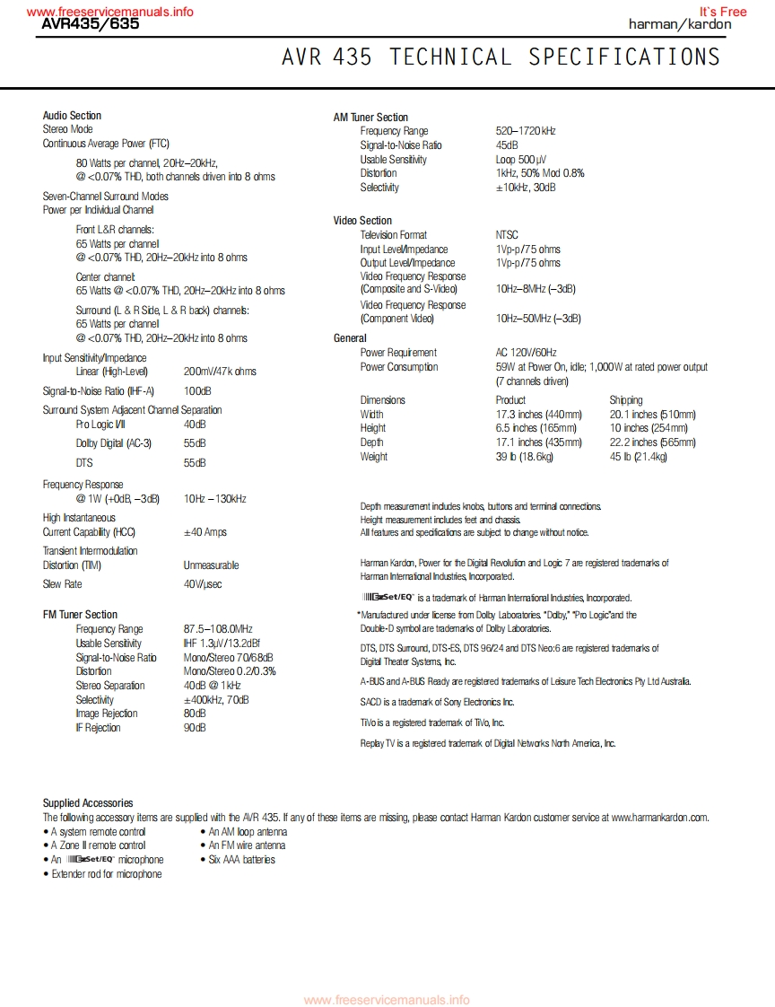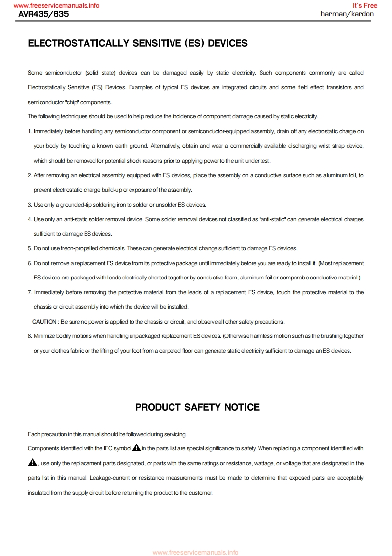 www.freeservicemanuals.infoIt's Freeharman/kardonAVR4357 X 65W 7.1 CHANNEL A/V RECEIVERAVR6357 X 75W 7.1 CHANNEL A/RECEIVERSERVICE MANUALn图超DUD/CORX1m四mDOLBY D EX器需写harman kardon国红DUD/C0AX1田"密D0 LBY D E×=D图G西harman kardonCONTENTSPACKINGEXPLODED VIEW..27ESD WARNING..3MECHANICAL PARTS LIST..28LEAKAGE TESTING.............4TECH TIP HKTT2003-01......30AVR435 BASIC SPECIFICATIONS........5IDLE ADJUSTMENT PROCEDURES.......31AVR635 BASIC SPECIFICATIONS.6BLOCK DIAGRAMS...........................33FRONT PANEL CONTROLS...7AVR435 PARTS LISTS.....................35REAR PANEL CONNECTIONS..............10AVR635 PARTS LISTS..........................54REMOTE CONTROL FUNCTIONS...........13SEMICONDUCTOR PINOUTS...............75INSTALLATION/CONNECTIONS............17PCB DRAWINGS..........................117OPERATION......20SCHEMATICS................128TROUBLESHOOTING GUIDE.................26WIRING DIAGRAM.........................142PROCESSOR RESET............26haman/kardon,Inc.250 Crossways Park Dr.Woodbury,New York 11797Rev16/2004www.freeservicemanuals.info