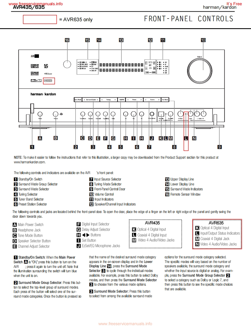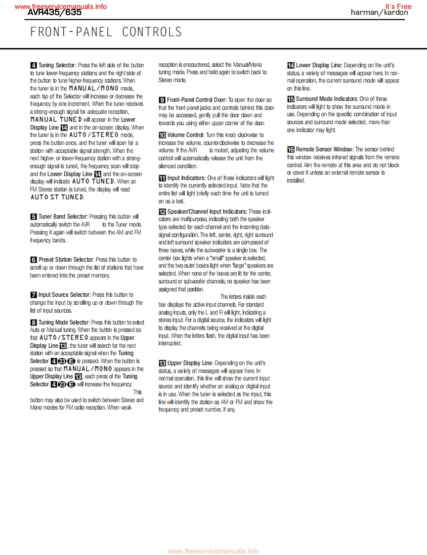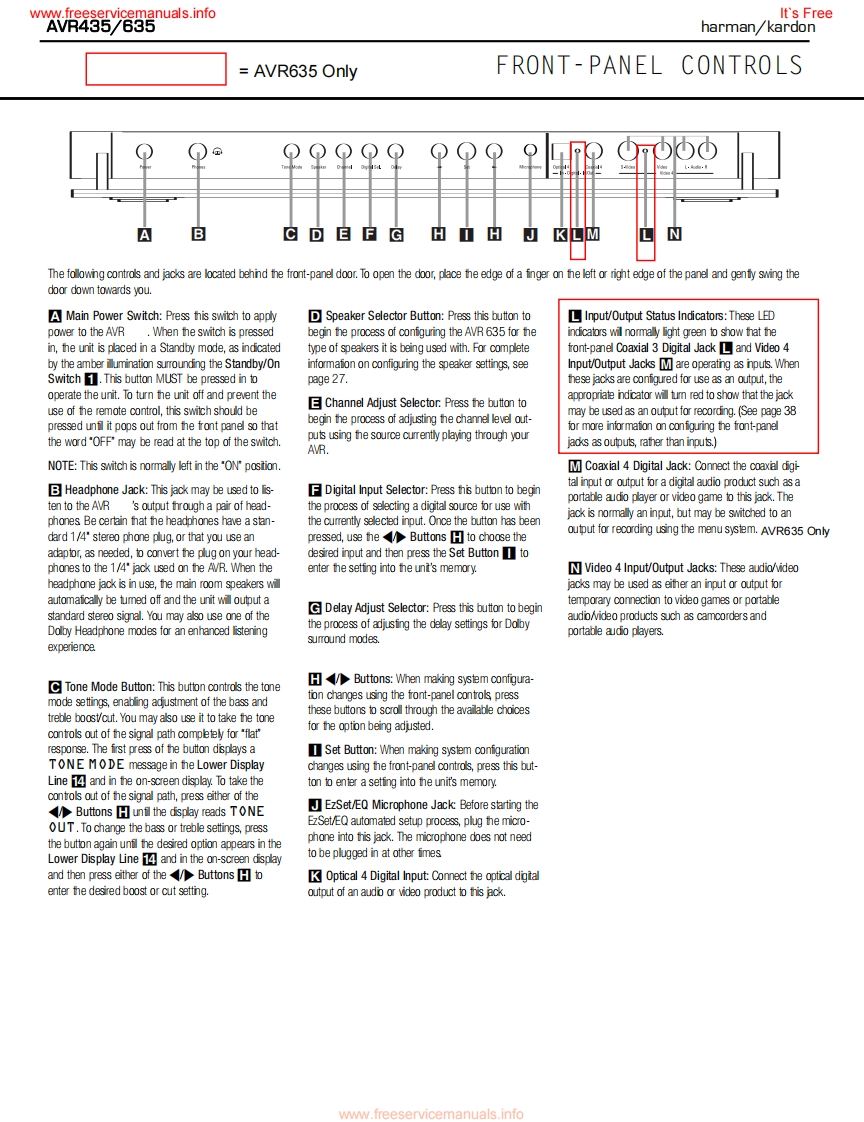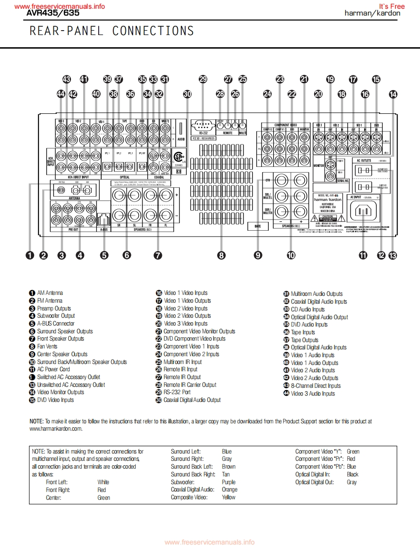 www.freeservicemanuals.infoIt's Freeharman/kardonAVR4357 X 65W 7.1 CHANNEL A/V RECEIVERAVR6357 X 75W 7.1 CHANNEL A/RECEIVERSERVICE MANUALn图超DUD/CORX1m四mDOLBY D EX器需写harman kardon国红DUD/C0AX1田"密D0 LBY D E×=D图G西harman kardonCONTENTSPACKINGEXPLODED VIEW..27ESD WARNING..3MECHANICAL PARTS LIST..28LEAKAGE TESTING.............4TECH TIP HKTT2003-01......30AVR435 BASIC SPECIFICATIONS........5IDLE ADJUSTMENT PROCEDURES.......31AVR635 BASIC SPECIFICATIONS.6BLOCK DIAGRAMS...........................33FRONT PANEL CONTROLS...7AVR435 PARTS LISTS.....................35REAR PANEL CONNECTIONS..............10AVR635 PARTS LISTS..........................54REMOTE CONTROL FUNCTIONS...........13SEMICONDUCTOR PINOUTS...............75INSTALLATION/CONNECTIONS............17PCB DRAWINGS..........................117OPERATION......20SCHEMATICS................128TROUBLESHOOTING GUIDE.................26WIRING DIAGRAM.........................142PROCESSOR RESET............26haman/kardon,Inc.250 Crossways Park Dr.Woodbury,New York 11797Rev16/2004www.freeservicemanuals.info