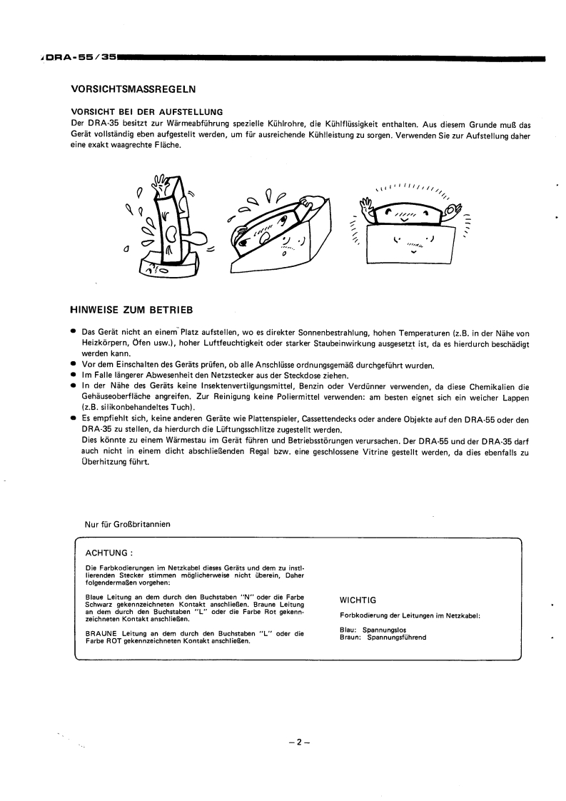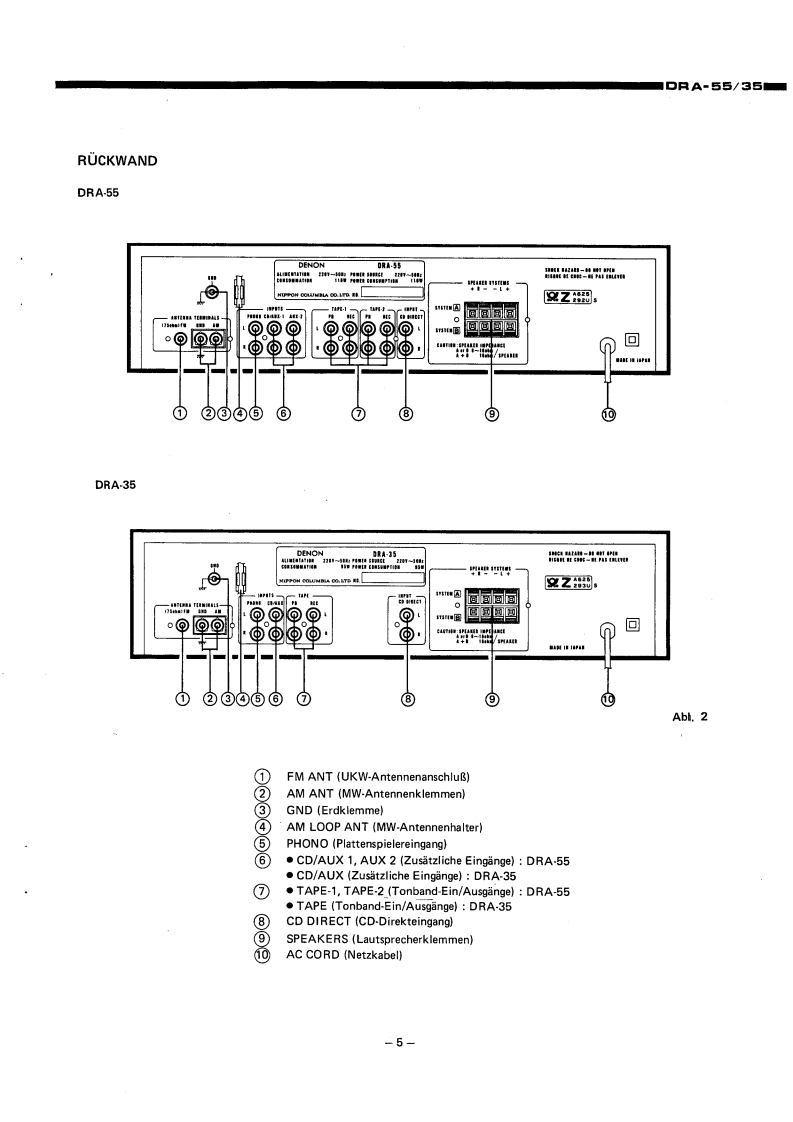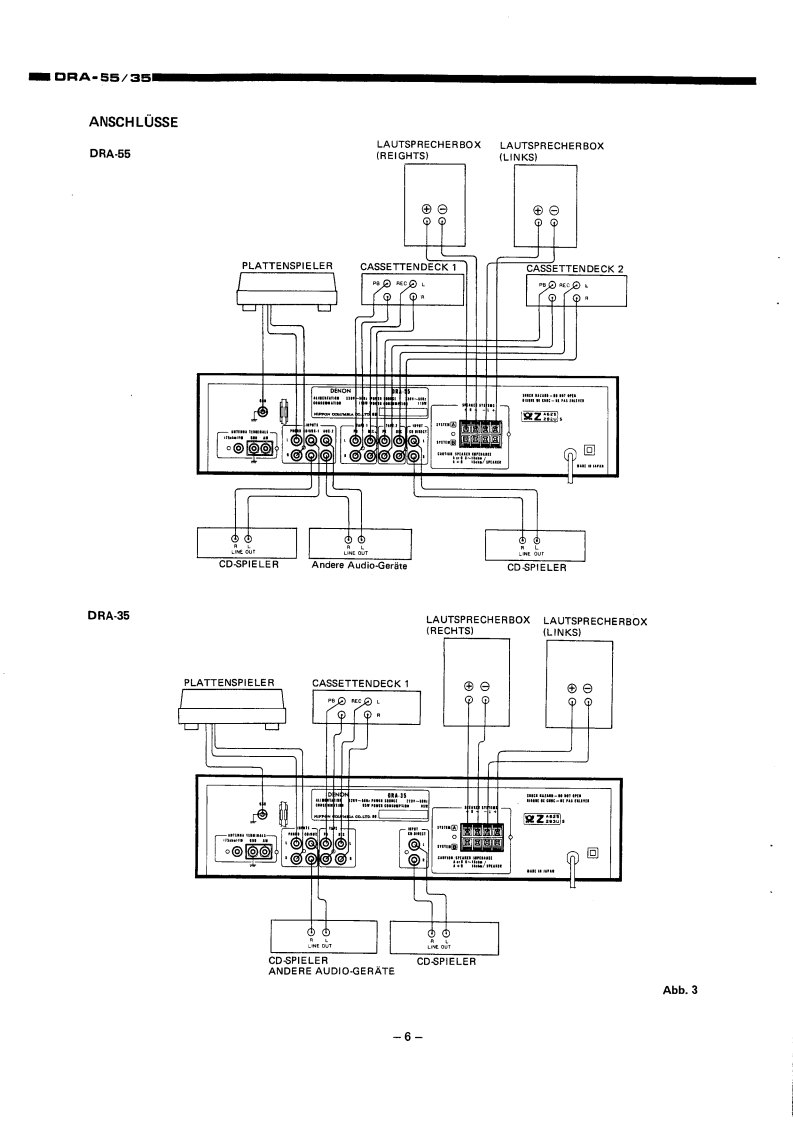 DENO-00005DENONHi-Fi-MW/UKW Stereo ReceivenWARTUNGSANLEITUNGTYP DRA-55/35MW/UKW-RECEIVERDRA-55DRA-35INHALTVORSICHTSMASSREGELN.,,,,,.,,:,···,2HINWEISE ZUM BETRIEB......TECHNISCHE DATEN..23BEZEICHNUNGEN UND FUNKTIONEN DER EINZELNEN TEILEFRONTPLATTE.......................................................4ROCKWANDANSCHLOSSE6ANTENNEN..·...ABNEHMEN DER GEHAUSEABDECKUNG.,,,,,,,.,,,,.....·..·····,.,,·,·,,,BL0 CKSCHALTBILD.,,·9JUSTIERUNG..10ANSCHLUSS DER MESSINSTRUMENTE.,,,·.,,...:··:············11HALBLEITER12,13PLATINEVERST.-UND TUNERBAUGRUPPE ETC9096,9096A...·...·..···.·,,,14.15SCHALTBAUGRUPPE ETC9097,ETC9097A··.·,.··.,,·.·,·.:···16RELAISBAUGRUPPE ETC9O98,ETC9O98A.,·,·16TEILELISTE DER VERST.-UND TUNERBAUGRUPPE.··.····,··:····,·,,,,·16~22ANSCHLUSSDIAGRAMM··,·23SCHALTPLANDRA-55..DRA-35.5EXPLOSIONSZEICHNUNG VON CHASSIS UND GEHAUSE(DRA-55/35)..·.·..··.·.,·.2NIPPON COLUMBIA CO.,LTD.