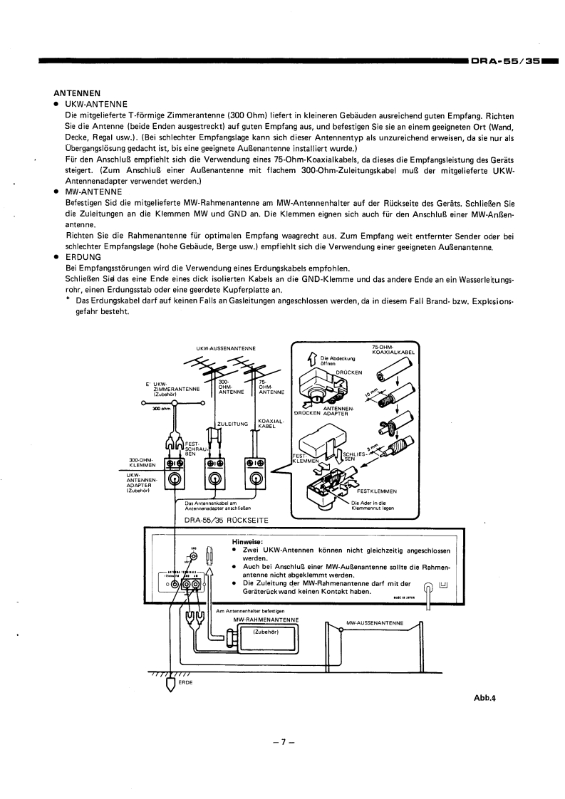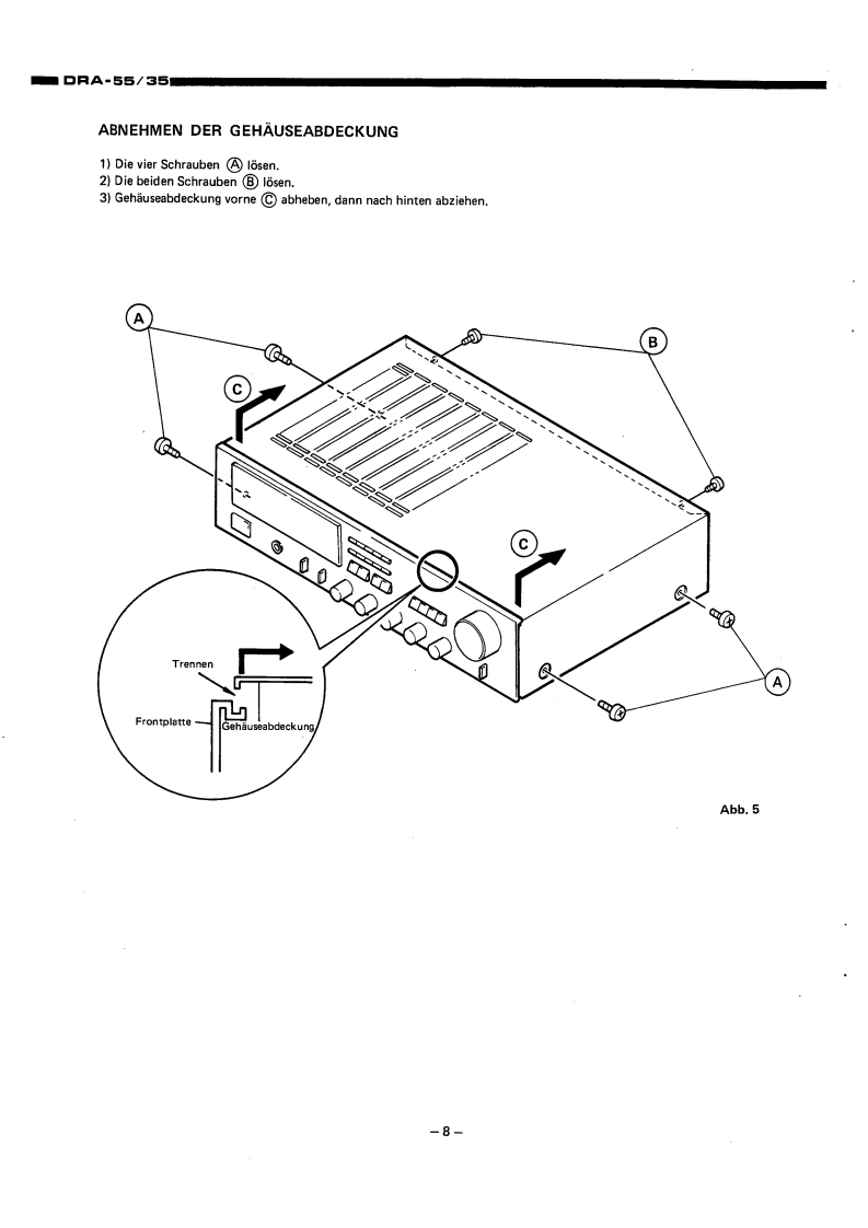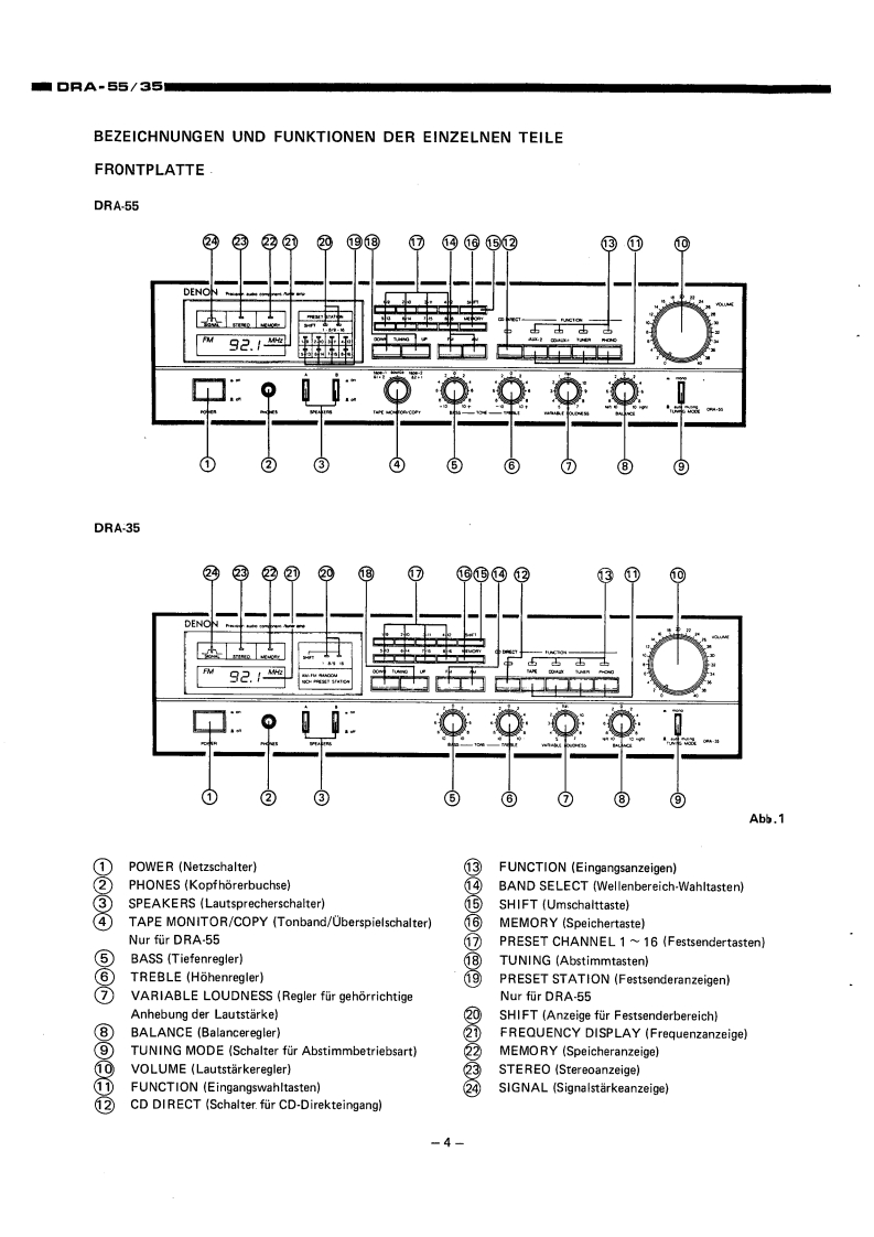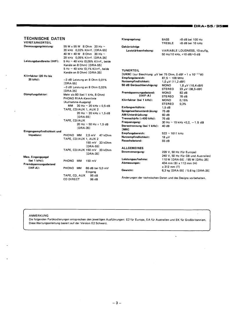 DENO-00005DENONHi-Fi-MW/UKW Stereo ReceivenWARTUNGSANLEITUNGTYP DRA-55/35MW/UKW-RECEIVERDRA-55DRA-35INHALTVORSICHTSMASSREGELN.,,,,,.,,:,···,2HINWEISE ZUM BETRIEB......TECHNISCHE DATEN..23BEZEICHNUNGEN UND FUNKTIONEN DER EINZELNEN TEILEFRONTPLATTE.......................................................4ROCKWANDANSCHLOSSE6ANTENNEN..·...ABNEHMEN DER GEHAUSEABDECKUNG.,,,,,,,.,,,,.....·..·····,.,,·,·,,,BL0 CKSCHALTBILD.,,·9JUSTIERUNG..10ANSCHLUSS DER MESSINSTRUMENTE.,,,·.,,...:··:············11HALBLEITER12,13PLATINEVERST.-UND TUNERBAUGRUPPE ETC9096,9096A...·...·..···.·,,,14.15SCHALTBAUGRUPPE ETC9097,ETC9097A··.·,.··.,,·.·,·.:···16RELAISBAUGRUPPE ETC9O98,ETC9O98A.,·,·16TEILELISTE DER VERST.-UND TUNERBAUGRUPPE.··.····,··:····,·,,,,·16~22ANSCHLUSSDIAGRAMM··,·23SCHALTPLANDRA-55..DRA-35.5EXPLOSIONSZEICHNUNG VON CHASSIS UND GEHAUSE(DRA-55/35)..·.·..··.·.,·.2NIPPON COLUMBIA CO.,LTD.