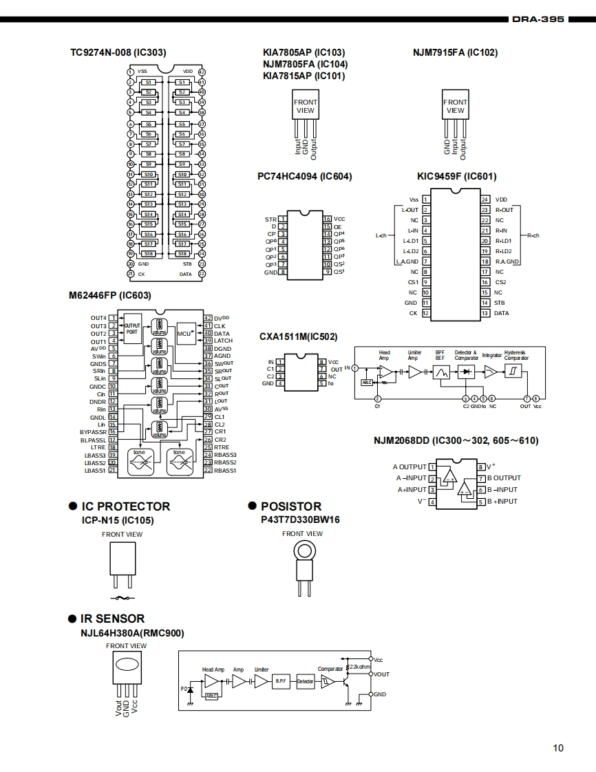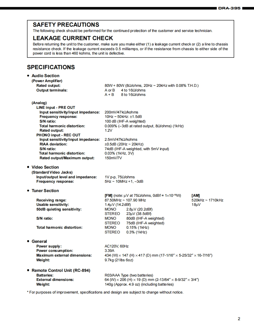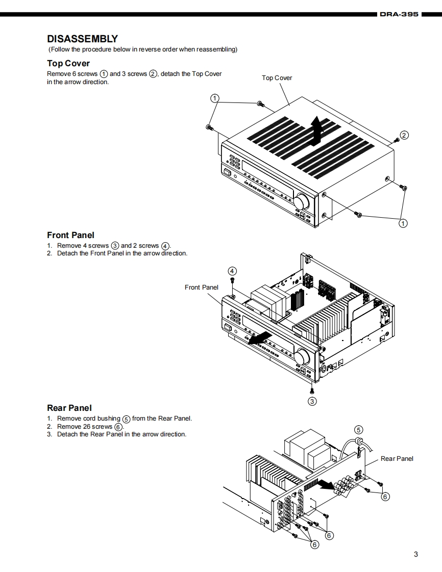 DENONFor U.S.A.Canada modelHi-Fi AM-FM Stereo ReceiverSERVICE MANUALMODEL DRA-395AM-FM STEREO RECEIVER6686888DENONMu RoomDUD8806马百马台白百台-TABLE OF CONTENTS-SAFETY PRECAUTIONS.2PARTS LIST OF PACKING ACCESSORIES ........27SPECIFICATIONS.2WRING DIAGRAM...........28DISASSEMBLY....3SCHEMATIC DIAGRAMS.29-34ADJUSTMENT......4.5(1/6)INPUT UNI......29BLOCK DIAGRAM6(2/6)VOLUME UNIT30LEVEL DIAGRAM...........7(3/6)MAIN UNIT.....31SEMICONDUCTORS.......8-12(4/6)MIDEO UNIT32PRINTED WIRING BOARDS..….1317CONNECTOR UNIT.32NOTEFOR PARTS LIST18(5/6)FRONT UNIT.33PARTS LIST OF P.W.B.UNIT ASS'Y...19-24SWITCH UNIT..........33EXPLODED VIEW............25POWER SWHP UNIT.33PARTS LIST OF EXPLODED VIEW6(6/6)TUNER UNIT......34PACKING VIEW27Some illustrations using in this service manual are slightly different from the actual set.NIPPON COLUMBIA CO,LTD.14-14.AKASAKA 4-CHOME.MINATO-KU.TOKYO 107-8011 JAPANTelephone:03(3584)8111X0118842N回0108
