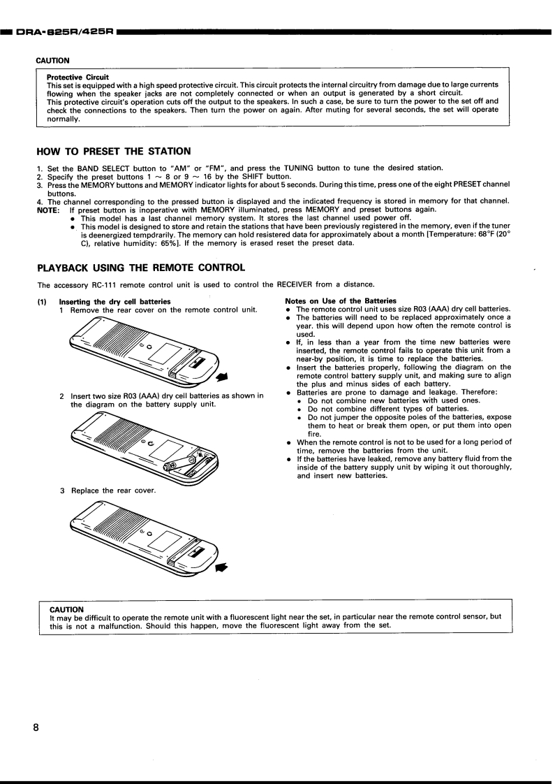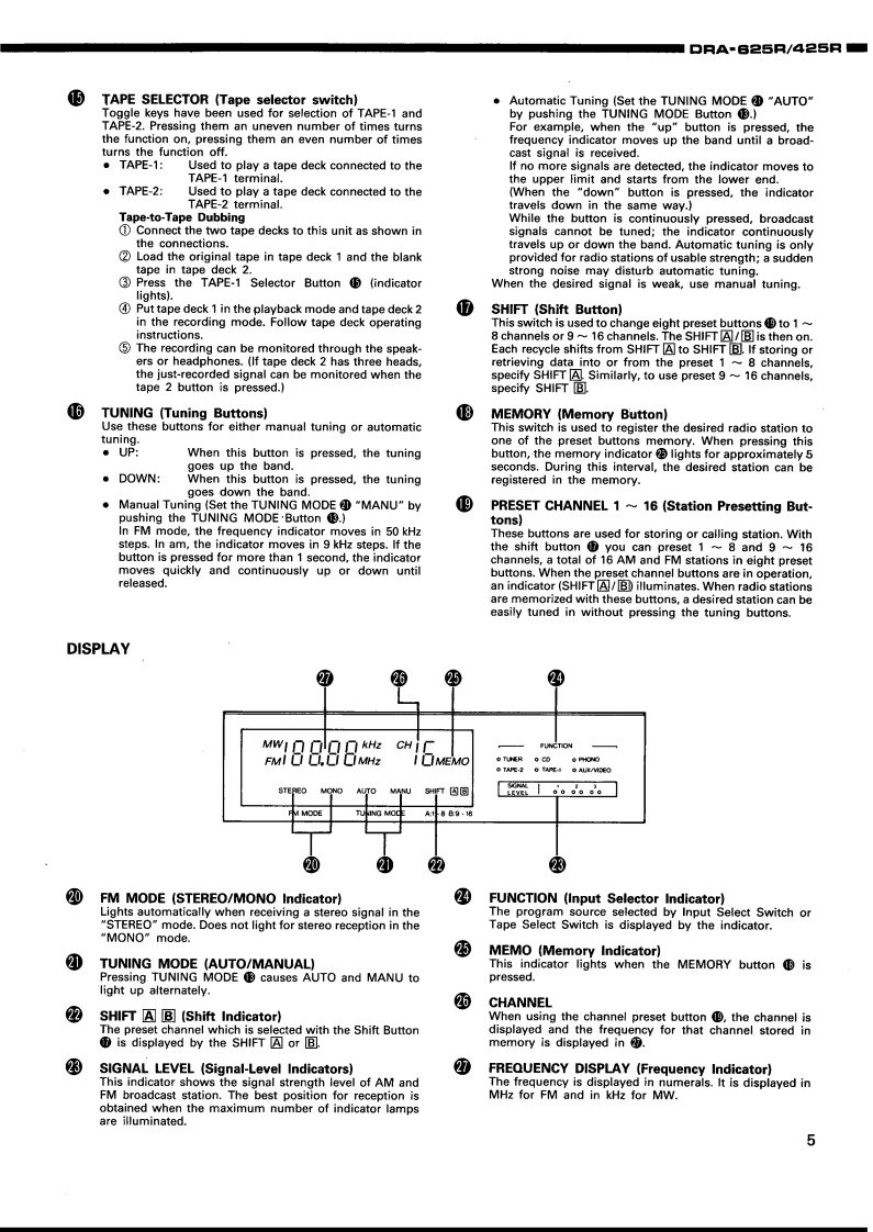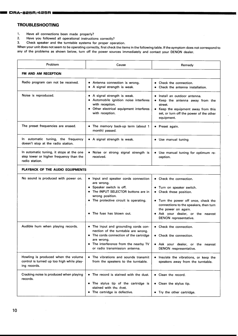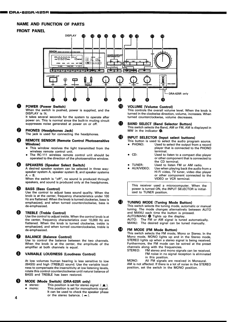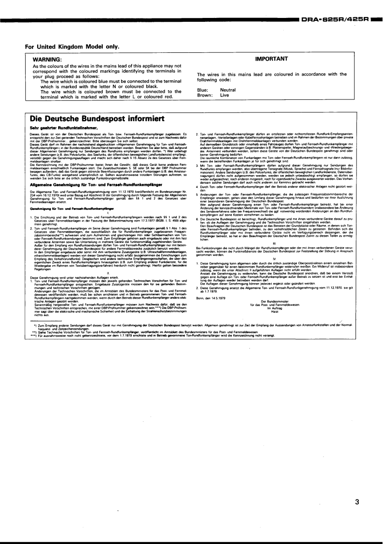 DENONHi-Fi AM-FM Stereo ReceiverSERVICE MANUALFor EUROPEAN,U.K.AND OTHER ModelsODEL DRA·625R/425RAM-FM STEREO RECEIVER罐DRA-625RDRA-425RTABLE OF CONTENTSOPERATING INSTRUCTIONS,,,,···2~11REMOVAL OF EACH SECTION....··.····12,13METHOD OF ADJUSTMENTS.........................14,15CONNECTION DIAGRAM OF MEASURING INSTRUMENTS.15SEMICONDUCT0RS.,,,··········1619PRINTED WIRING BOARD PATTERNS AND PARTS LIST1U-1596S MAIN UNIT P.W.BOARD (DRA-625R).......................201U-1606S MAIN UNIT P.W.BOARD (DRA-425R)........211U-1597S(DRA-625R),1U-1597S (DRA-425R)DISPLAY UNIT P.W.BOARD221U-1742 CONTROL UNIT P.W.BOARD (DRA-625R/425R)...........................221U-1596 S MAIN UNIT PARTS LIST(DRA-625R)....·.:.·.··..····23,241U-1606S MAIN UNIT PARTS LIST (DRA-425R).................241U-1597S (DRA-625R),1U-1597S(DRA-425R)DISPLAY UNIT PARTS LIST251U-1742C0 NTROL UNIT PARTS LIST(DRA-625R/425R).,..·.·...·····25EXPLODED VIEW OF CHASSIS AND CABINET &PARTS LISTPARTS LIST OF EXPLODED VIEW (DRA-625R/425R Europe Black Version)..............PARTS LIST OF EXPLODED VIEW(DRA-625R/425R Europe Gold Version)..............2EXPLODED VIEW OF CHASSIS AND CABINET(DRA625R/425R)......····27WIRING DIAGRAM(DRA625R/425R).,.·.........,...·......SCHEMATIC DIAGRAM(DRA-625R)....,··.....·.··..29SCHEMAT1 C DIAGRAM(DRA425R),·.·.·.·.·...·......30BLOCK DIAGRAM(DRA625R/425R).....,.,·,·,···NIPPON COLUMBIA CO..LTD.