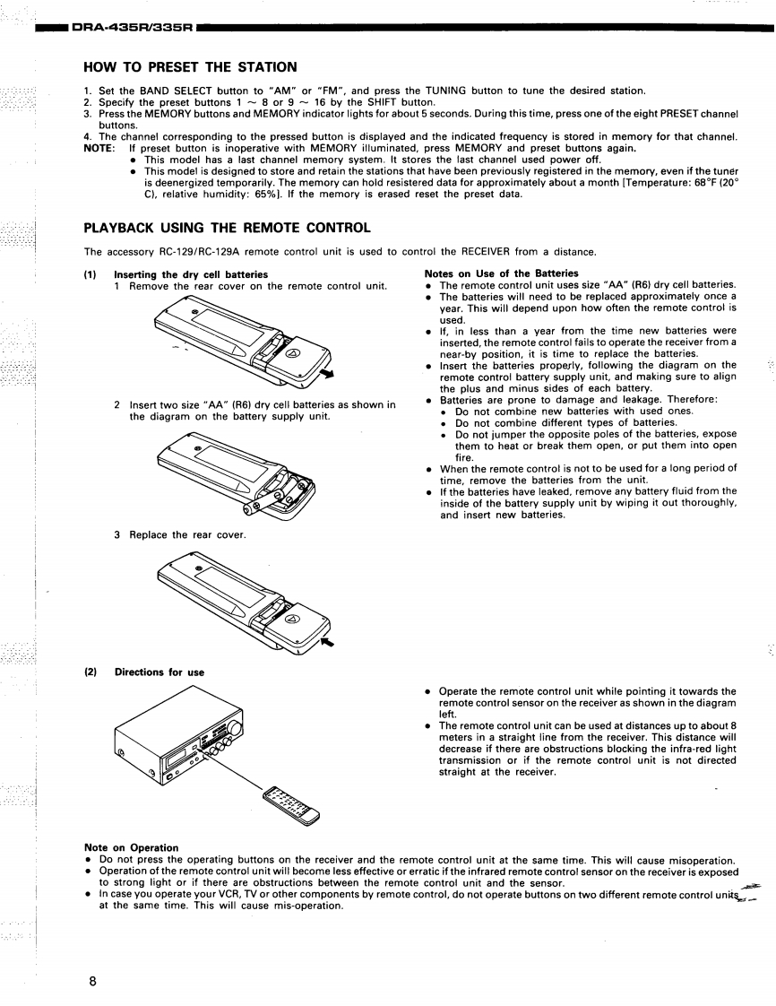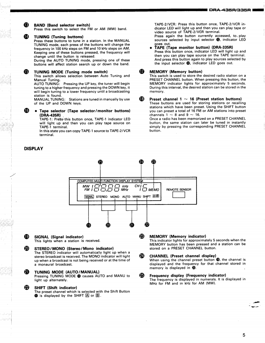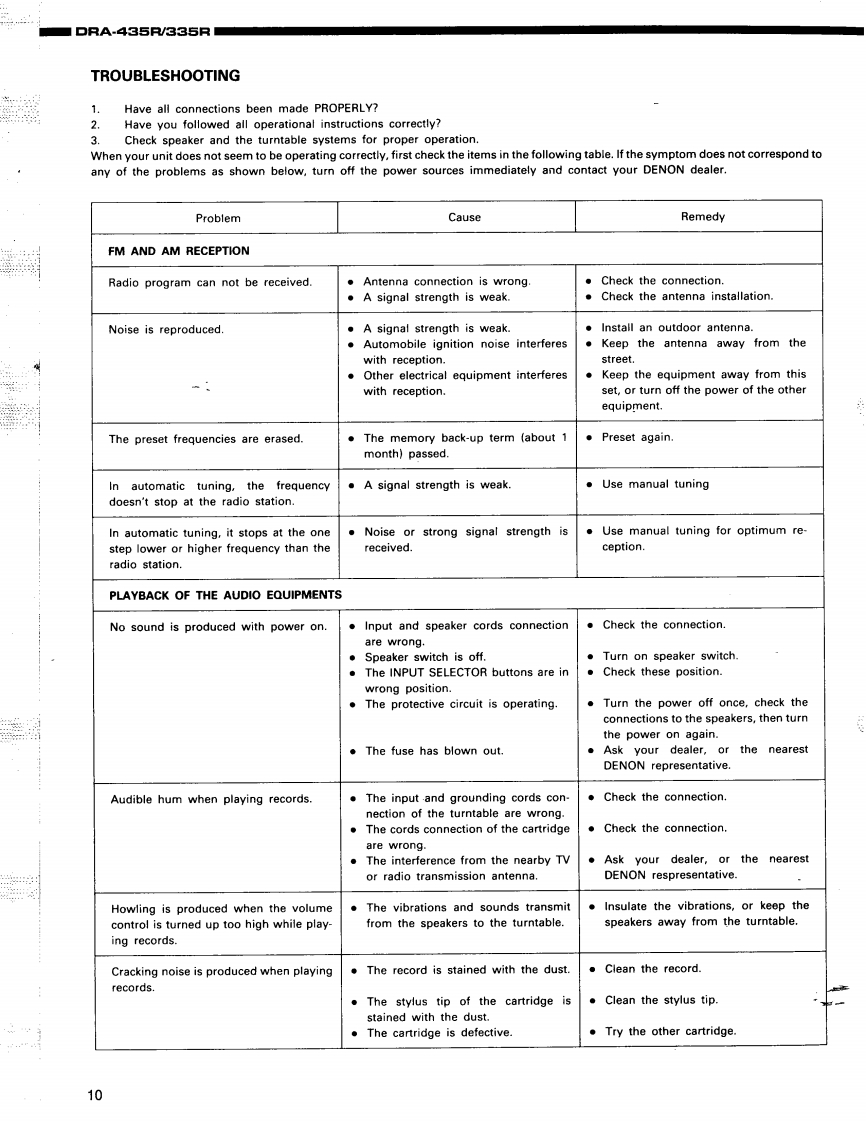 1DENONHi-Fi AM-FM Stereo ReceiverSERVICE MANUALFor U.S.A.ModelODEL DRA·435RSerial No.25551 and afterODEL DRA·335RSerial No.38551 and afterAM-FM STEREO RECEIVERDRA-435RRC-129DRA-335RRC-129ATABLE OF CONTENTSOPERATING INSTRUCTIONS2-11REMOVALOF EACH SECTION............................................12,13METHOD OF ADJUSTMENTS14,15CONNECTION DIAGRAM OF MEASURING INSTRUMENTS......................16BLOCK/LEVELDIAGRAM(DRA-435R).........................................17BLOCK/LEVEL DIAGRAM(DRA-335R)17PARTS LIST OF EXPLODED VIEW ...........................................EXPLODED VIEW OF CHASSIS AND CABINETNOTE ON PARTS LIST.,,,,,,··20PRINTED WIRING BOARD PARTS LIST20-2PRINTED WIRING BOARD PATTERNS25271U-2345A MAIN UNIT (DRA-435R)21U-2344A MAIN UNIT (DRA-335R)261U-2346A MI-COM UNIT (DRA-435R/335R)21U-2347A TUNER UNIT(DRA-435R/335R)71U-2348A VIDEO UNIT (DRA-435R)27SEMICONDUCTORS....................................................28,NIRING DIAGRAM·.·SCHEMATIC DIAGRAM(for DRA-435R)1SCHEMATIC DIAGRAM (for DRA-335R)32NIPPON COLUMBIA CO..LTD.