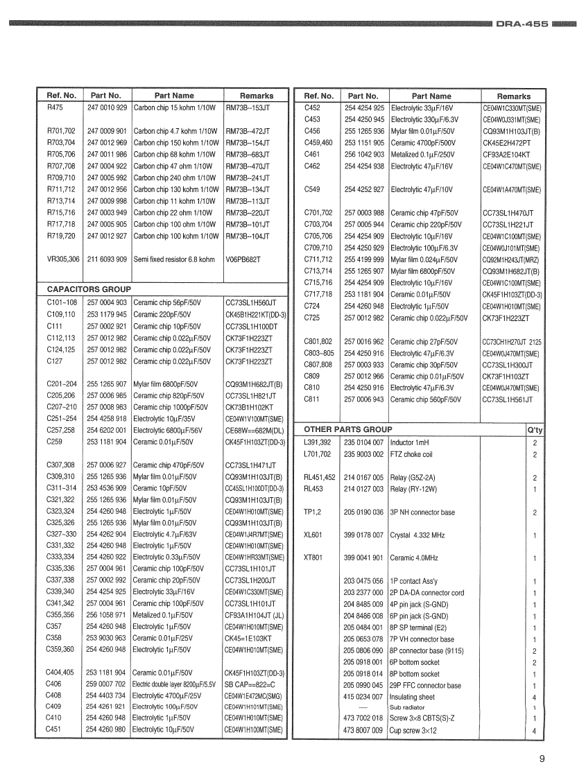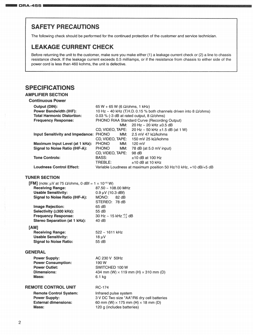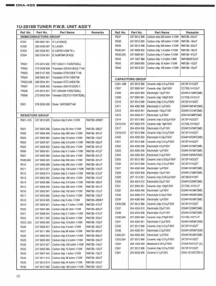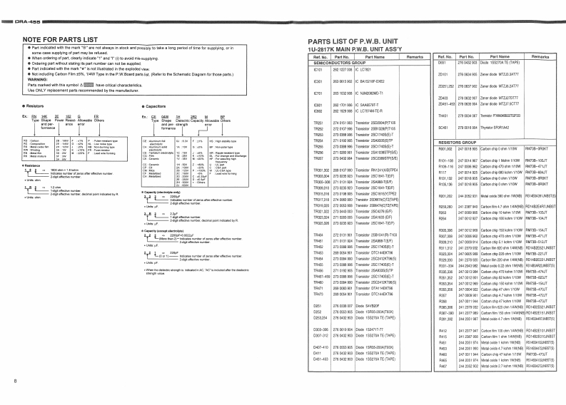 DENONHi-Fi AM-FM Stereo ReceiverSERVICE MANUALFor Europe ModelMODEL DRA-455AM-FM STEREO RECEIVERFM 02507H.B5巴宫This service manual is composed of only pages whose contents are different from thosefor the model DRA-385RD.For servicing,refer to the previously issued service manual ofDRA-385RD(for Europe and U.K.models)at the same time.-TABLE OF CONTENTS-SPECIFICATONS.2SEMICONDUCTORS...1,3PRINTED WIRING BOARDS…4-7NOTE FOR PARTS LIST…8PARTS LIST OF P.W.B.UNIT.................48-11EXPLODED VIEW….12PARTS LIST OF EXPLODED VIEW.13PACKING VIEW.....14PARTS LIST OF PACKING ACCESSORIES.14SCHEMATIC DIAGRAMS.........…15,16(1/2)1U-2817K-1 MAIN UNIT…151U-2818TUNER UNIT.15(2/2)1U-3302-1 DISPLAY UNIT/1U-3302-2 H/P UNIT.............161U-3302-3 POWER SW UNIT/1U-3302-4 POWER UNIT.161U-3302-5 VOLUME UNIT....…16WRING DIAGRAM..17Some illustrations using in this service manual are slightly different from the actual set.NIPPON COLUMBIA CO.LTD.