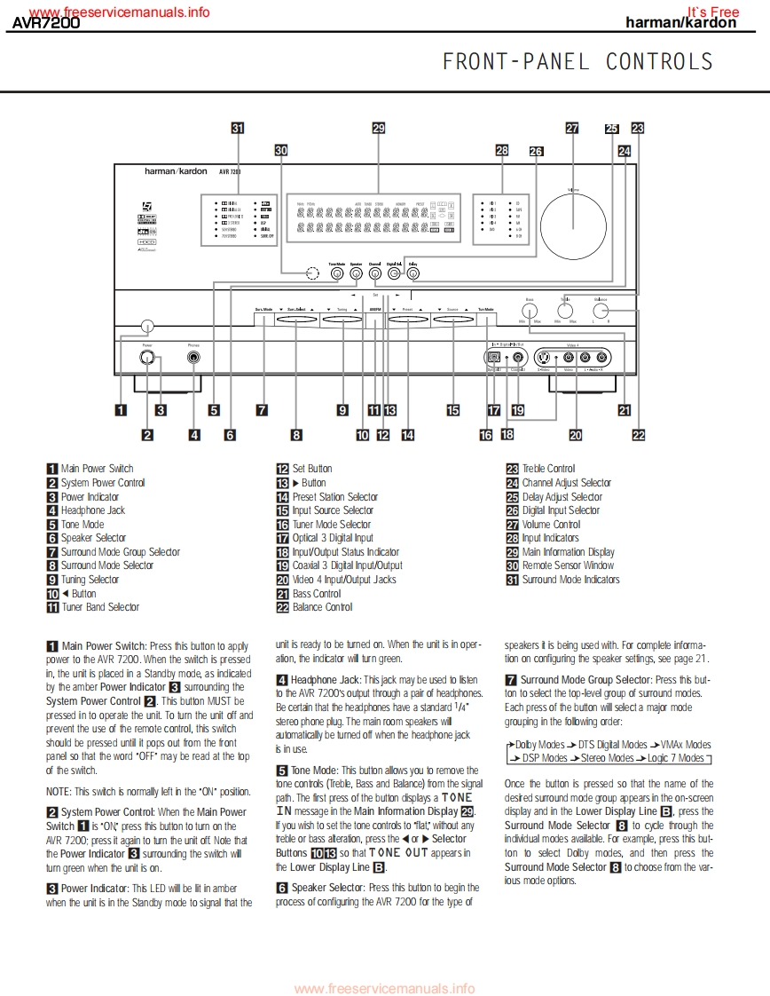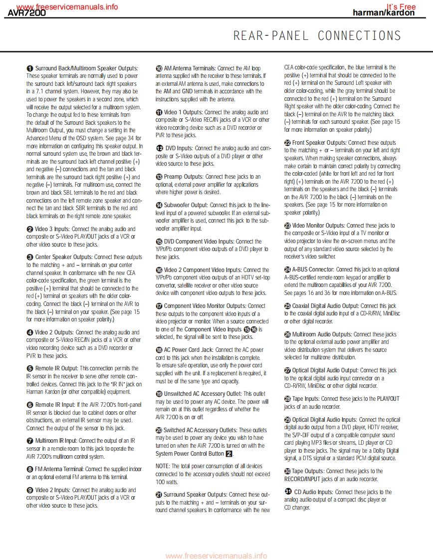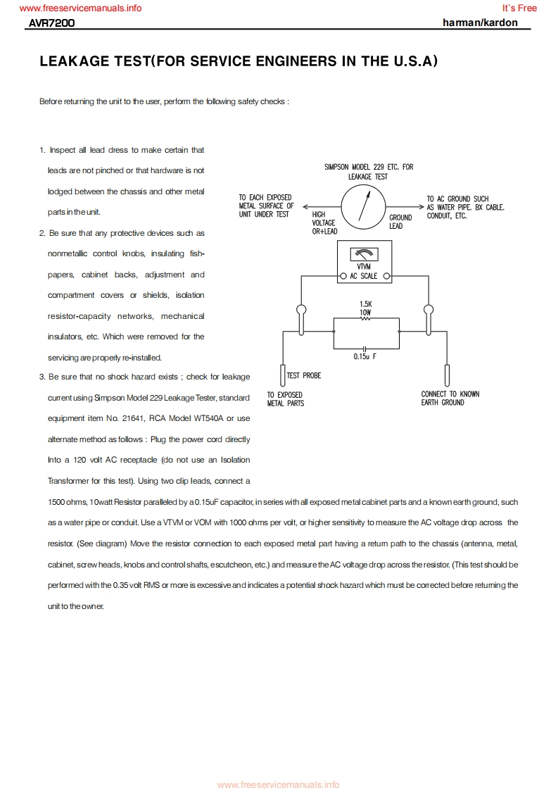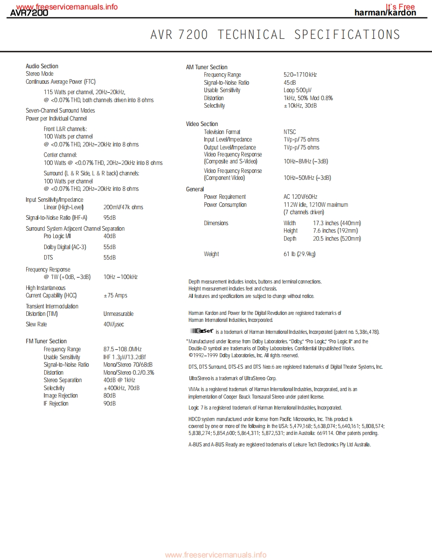 www.freeservicemanuals.infoIt's Freeharman/kardonAVR7200AM DOLBY DIGITAL RECEIVERSERVICE MANUALharman/kardon AVR 7200DV D/CORx:LOGIC CH CoooCONTENTSESD WARNING..EXPLODED VIEW PARTS LIST............19LEAKAGETESTING.............3BLOCK DIAGRAM...22BASIC SPECIFICATIONS.....….4DC OFFSET/IDLE CURRENT ADJ..........23FRONT PANEL CONTROLS.5BULLETIN HK2003-04...............INFORMATION DISPLAY................TECH TIP HKTT2003-01........25REAR PANEL CONNECTIONS...............8ELECTRICAL PARTS LIST..................26REMOTE CONTROL FUNCTIONS..........11PCB DRAWINGS...................74INSTALLATION/CONNECTIONS.......14SEMICONDUCTOR PINOUTS.99TROUBLESHOOTING GUIDE.................17SCHEMATICS.......................158PROCESSOR RESET..........17WIRING DIAGRAM.183UNIT EXPLODED VIEW...............18PACKAGING PARTS LIST.................184haman/kardon,Inc.250 Crossways Park Dr.Woodbury,New York 11797Rev17/2005ww.freeservicemanuals.info