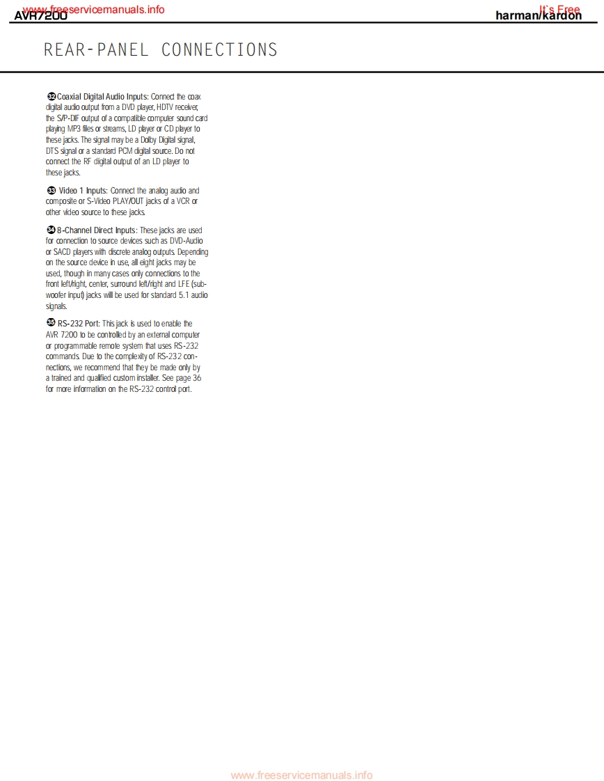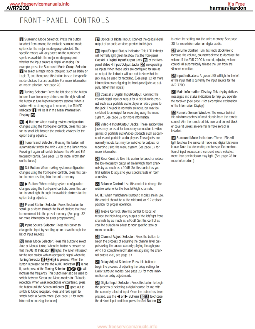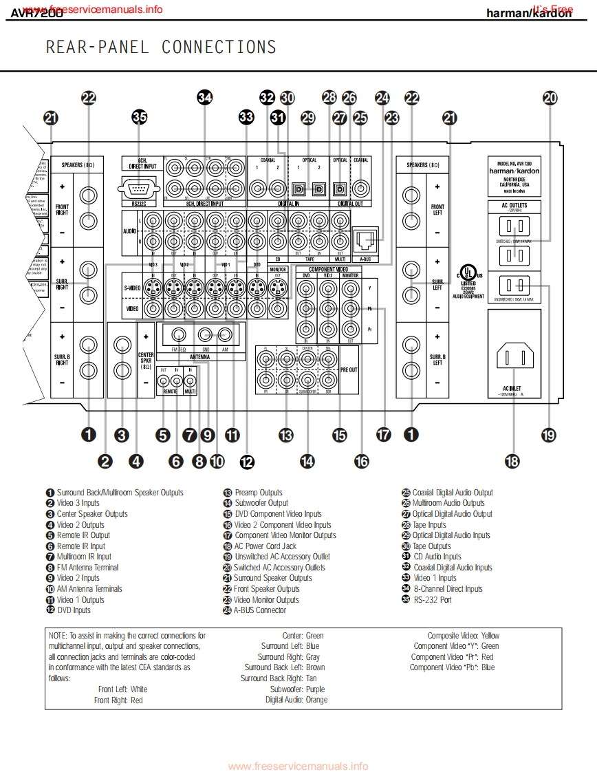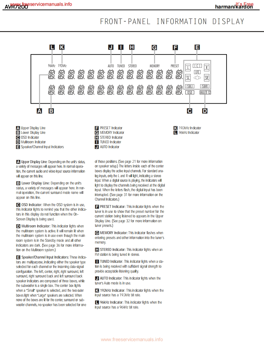 www.freeservicemanuals.infoIt's Freeharman/kardonAVR7200AM DOLBY DIGITAL RECEIVERSERVICE MANUALharman/kardon AVR 7200DV D/CORx:LOGIC CH CoooCONTENTSESD WARNING..EXPLODED VIEW PARTS LIST............19LEAKAGETESTING.............3BLOCK DIAGRAM...22BASIC SPECIFICATIONS.....….4DC OFFSET/IDLE CURRENT ADJ..........23FRONT PANEL CONTROLS.5BULLETIN HK2003-04...............INFORMATION DISPLAY................TECH TIP HKTT2003-01........25REAR PANEL CONNECTIONS...............8ELECTRICAL PARTS LIST..................26REMOTE CONTROL FUNCTIONS..........11PCB DRAWINGS...................74INSTALLATION/CONNECTIONS.......14SEMICONDUCTOR PINOUTS.99TROUBLESHOOTING GUIDE.................17SCHEMATICS.......................158PROCESSOR RESET..........17WIRING DIAGRAM.183UNIT EXPLODED VIEW...............18PACKAGING PARTS LIST.................184haman/kardon,Inc.250 Crossways Park Dr.Woodbury,New York 11797Rev17/2005ww.freeservicemanuals.info