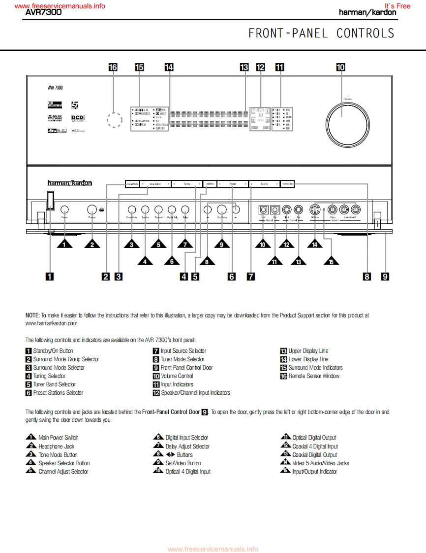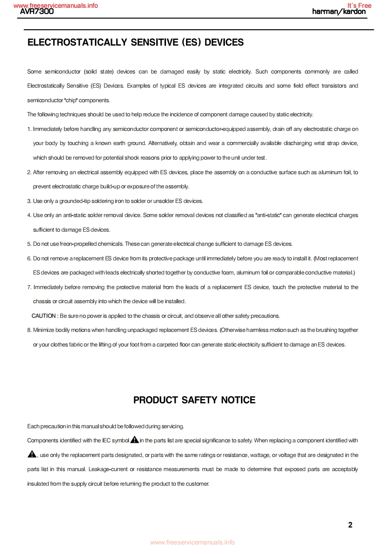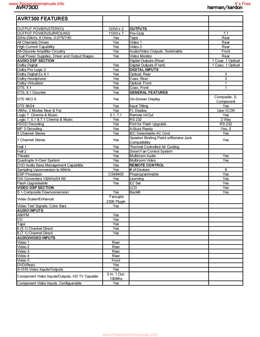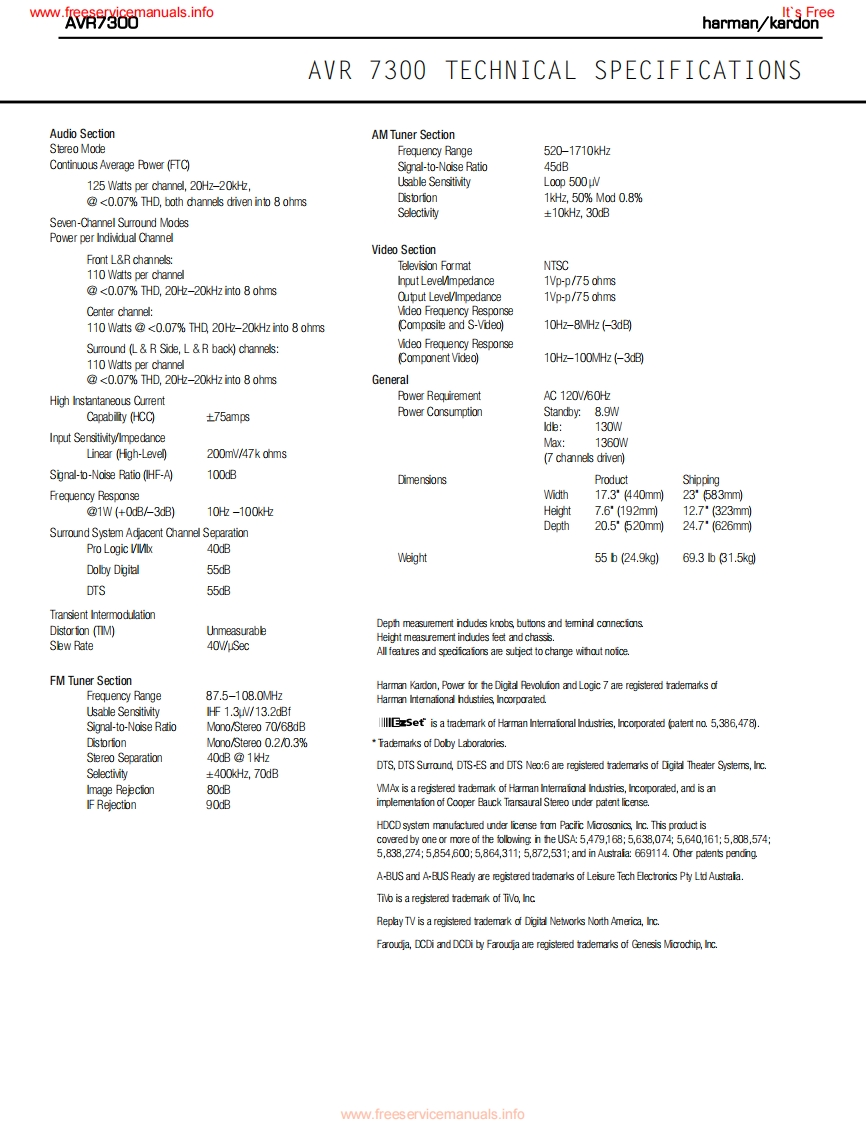 www.freeservicemanuals.infoIt's Freeharman/kardonAVR73007x 110W 7.1 CHANNEL AV RECEIVERSERVICE MANUALAVR 7300品器盛互·gDUD/C0AX1四四m黑DCDiLOGIC 7 7CH CI围harman/kardonCONTENTSESDWARNING..EXPLODED VIEW PARTS LIST..............31LEAKAGE TESTING......................3BLOCK DIAGRAM...............33BASIC SPECIFICATIONS...............4CIRCUIT DESCRIPTION.....................34FEATURES.............DC OFFSET/IDLE CURRENT ADJ..........45FRONT PANEL CONTROLS....BULLETIN HK2005-01....49REAR PANEL CONNECTIONS..10TECH TIP HKTT2003-01….50REMOTE CONTROL FUNCTIONS..........14ELECTRICAL PARTS LIST....................51INSTALLATION/CONNECTIONS...........18SEMICONDUCTOR PINOUTS..............70OPERATION........21PCB DRAWINGS........................99TROUBLESHOOTING GUIDE.................9SCHEMATICS.........146PROCESSOR RESET......9WIRING DIAGRAM157UNIT EXPLODED VIEW................30PACKAGING PARTS LIST........158hamman/kardon,Inc.250 Crossways Park Dr.Woodbury,New York 11797Rev03/2005ww.freeservicemanuals.info