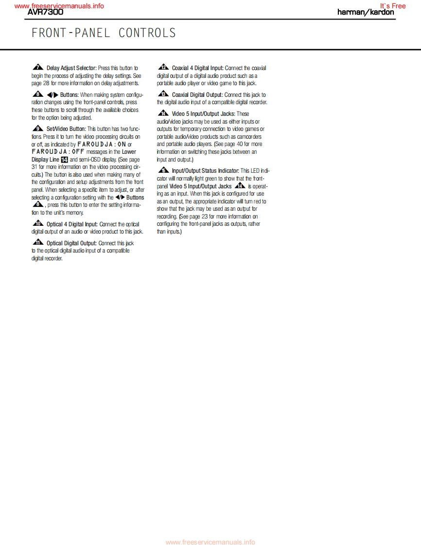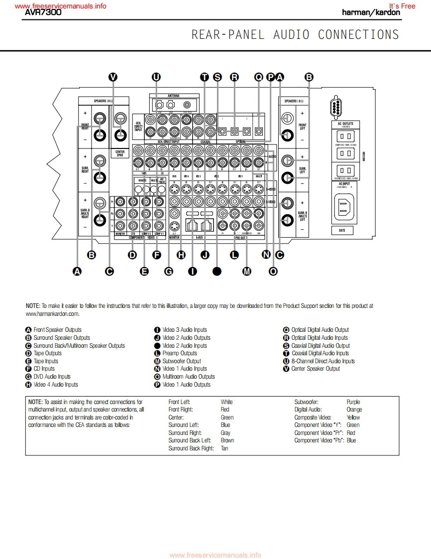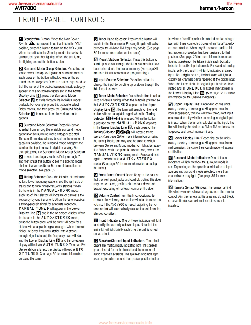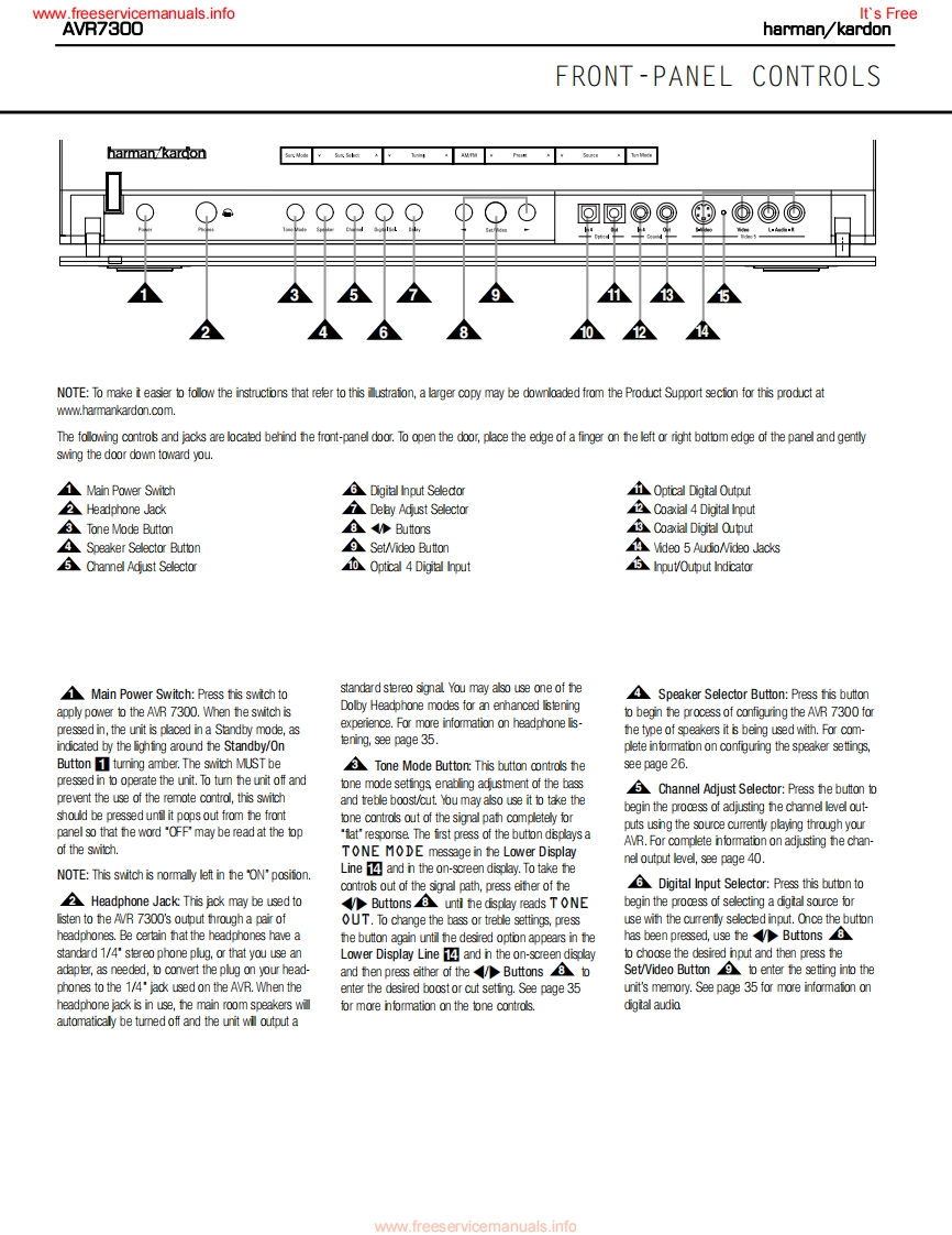 www.freeservicemanuals.infoIt's Freeharman/kardonAVR73007x 110W 7.1 CHANNEL AV RECEIVERSERVICE MANUALAVR 7300品器盛互·gDUD/C0AX1四四m黑DCDiLOGIC 7 7CH CI围harman/kardonCONTENTSESDWARNING..EXPLODED VIEW PARTS LIST..............31LEAKAGE TESTING......................3BLOCK DIAGRAM...............33BASIC SPECIFICATIONS...............4CIRCUIT DESCRIPTION.....................34FEATURES.............DC OFFSET/IDLE CURRENT ADJ..........45FRONT PANEL CONTROLS....BULLETIN HK2005-01....49REAR PANEL CONNECTIONS..10TECH TIP HKTT2003-01….50REMOTE CONTROL FUNCTIONS..........14ELECTRICAL PARTS LIST....................51INSTALLATION/CONNECTIONS...........18SEMICONDUCTOR PINOUTS..............70OPERATION........21PCB DRAWINGS........................99TROUBLESHOOTING GUIDE.................9SCHEMATICS.........146PROCESSOR RESET......9WIRING DIAGRAM157UNIT EXPLODED VIEW................30PACKAGING PARTS LIST........158hamman/kardon,Inc.250 Crossways Park Dr.Woodbury,New York 11797Rev03/2005ww.freeservicemanuals.info
