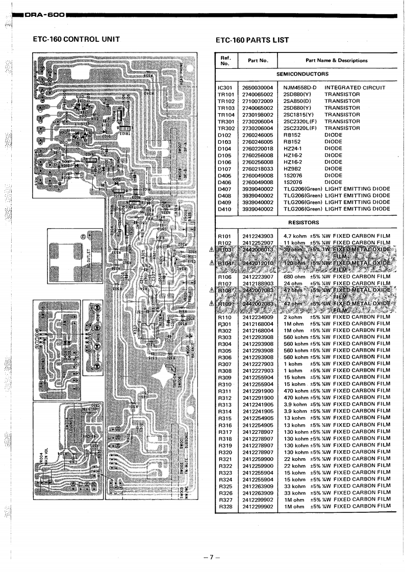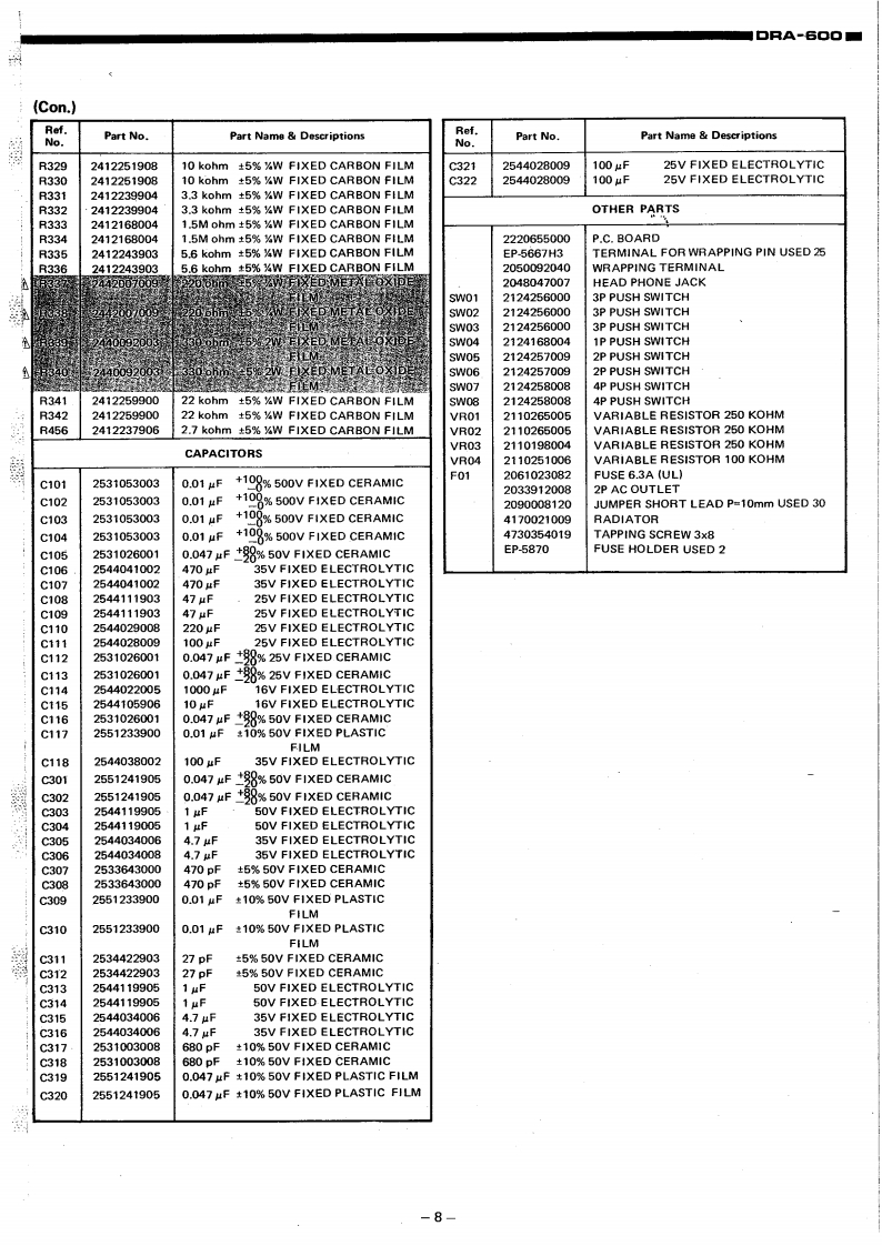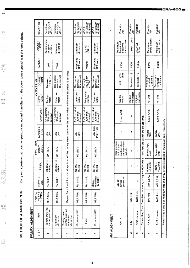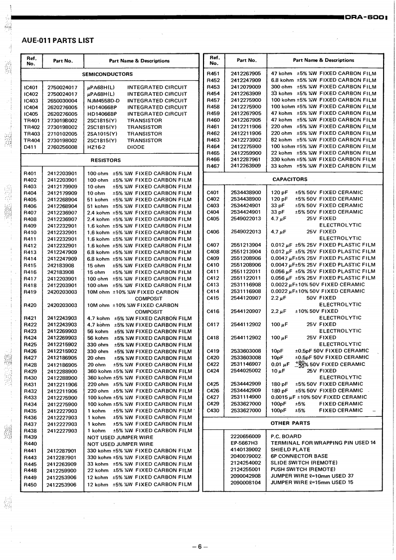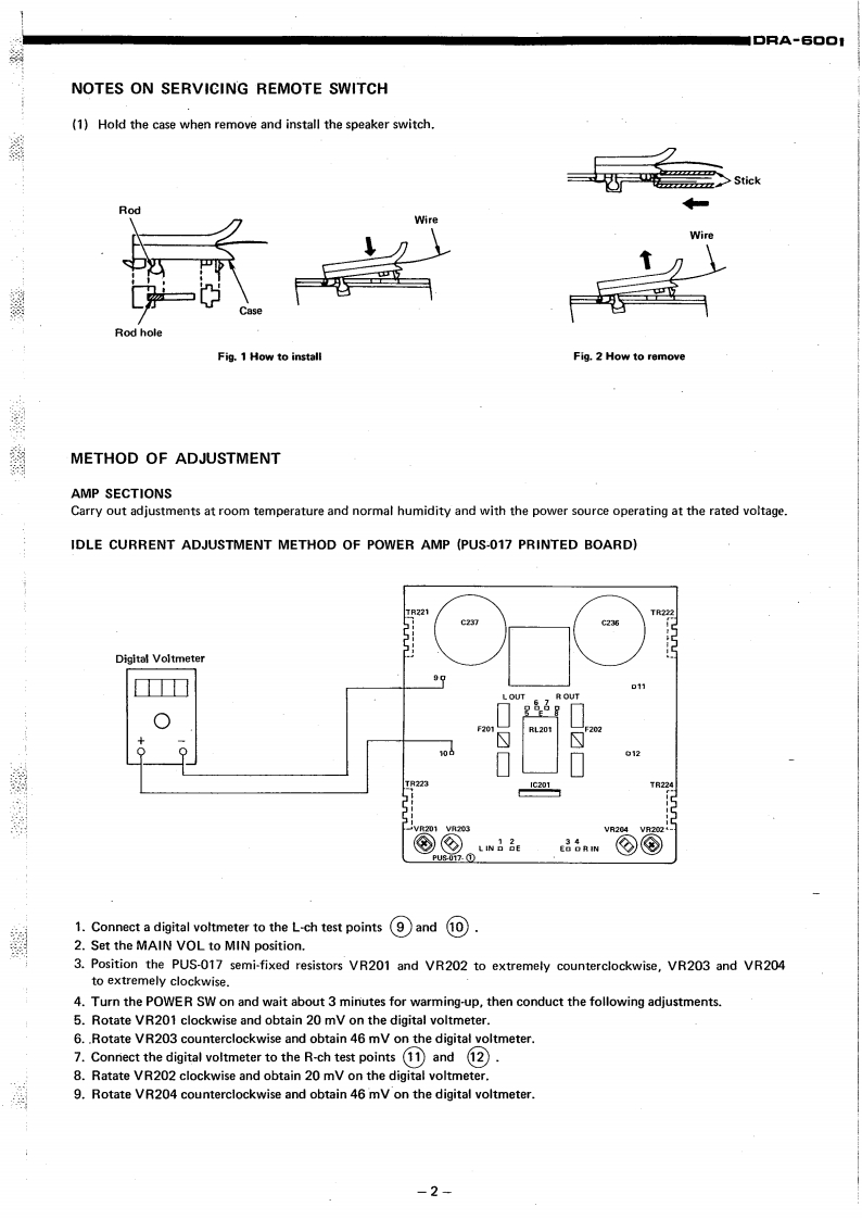 DENONHi-Fi Component Tuner AmplifierSERVICE MANUALODEL DRA-6▣▣CONTENTSSPECIFICATIONS1BLOCK DIAGRAM1NOTES ON SERVICING REMOTE SWITCH.....·.,,..··········2METHOD OF ADJUSTMENT.,····24PRINTED CIRCUIT BOARD PATTERNS AND PARTS LISTE0.&C0 NTROL UNIT AUE-011.,,.....,.·······5,6CONTROL UNIT ETC-16078DISPLAY&KEY UNIT ETC-161...................911POWER&SUPPLY UNIT PUS-O17......·..··,12~14BATTER UNIT ETC-168..........14BIAS UNIT ETC-169..TUNER UNIT ETC162..·.·,·.1415~17CONNECTION DIAGRAM...........18,19NIRING DIAGRAM.:.··20EXPLODED VIEW OF CHASSIS AND CABINET21NIPPON COLUMBIA CO,LTD.