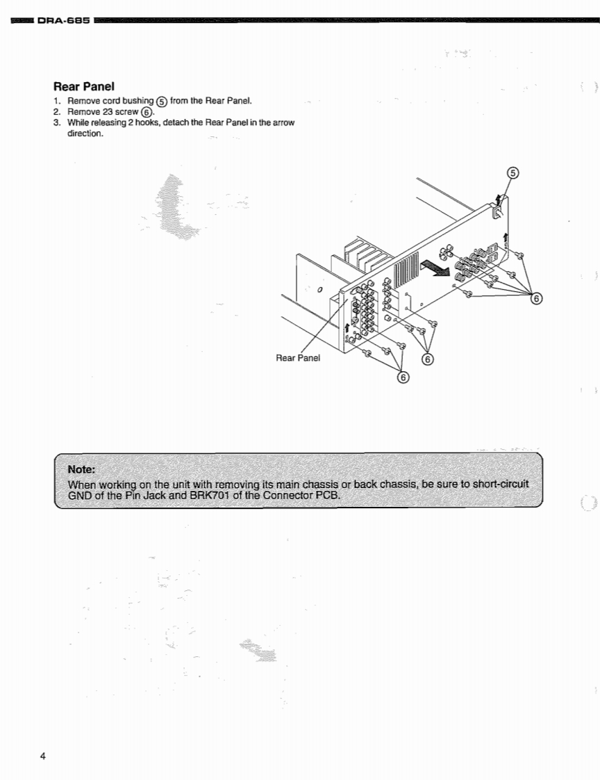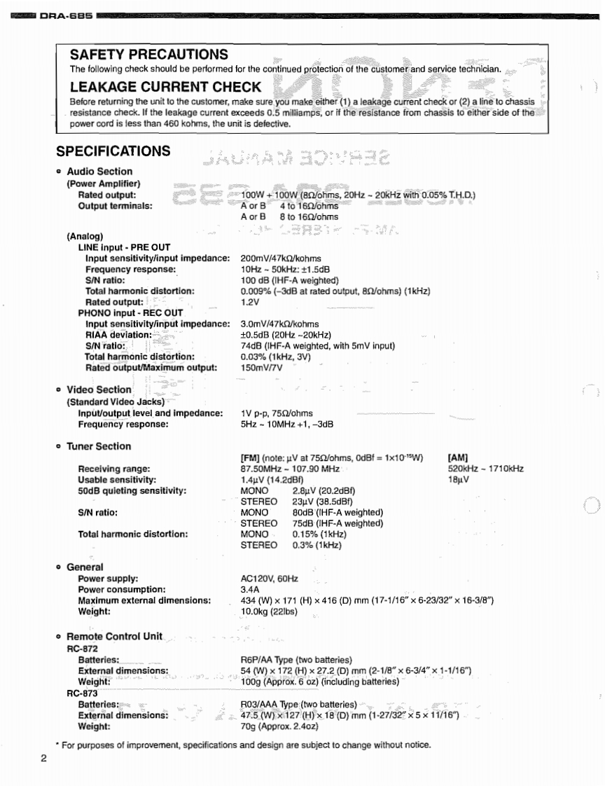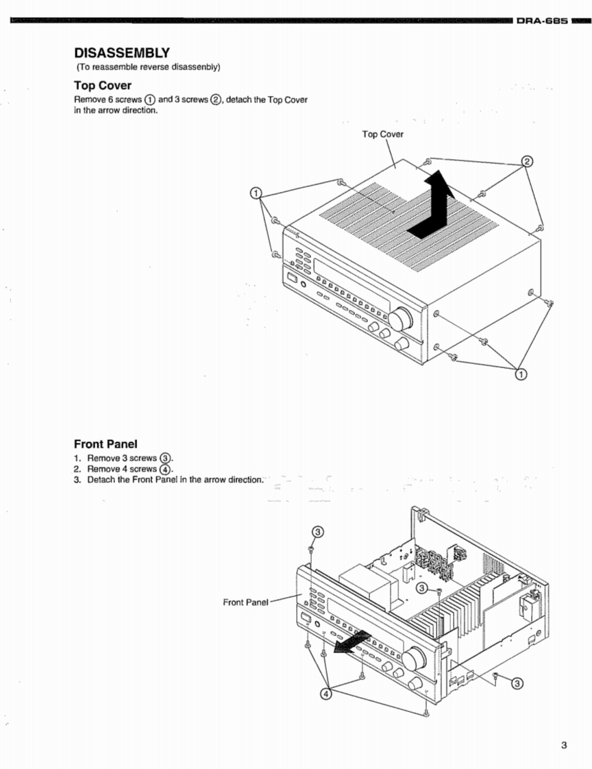 DENONHi-Fi AM-FM Stereo ReceiverSERVICE MANUALMODEL DRA-685AM-FM STEREO RECEIVER9单四见中-TABLE OF CONTENTS一SPECIFICATIONS.n2SCHEMATI DIAGRAMS25-DISASSEMBLY3.4(1).MAIN P.C.B......25ADJUSTMENT ....5,6(2/6)INPUT P.C.B.26BLOCK DIAGRAM36).TUNER P.C.B.27LEVEL DIAGRAM.......(4/6)PREOUT P.C.B.28SEMICONDUCTORS8-11CPU P.C.B..,28PRINTED WIRING BOARDS.12-15HEADPHONE P.C.B.28NOTE FOR PARTS LIST.16CONNECTOR P.C.B.28PARTS LIST OF P.W.B.UNIT ASSY.16-2156)'VIDEO P.C.B.…29PARTS LIST OF EXPLODED VIEW66)TONE P.C.B.30EXPLODED VIEW ....23FRONT P.C.B.....23WIRING DIAGRAM.24VOLUME P.C.B......30PACKING VEW...PARTS LIST OF PACKING &ACCESSORIES.31Some illustrations using in this service manual are slightly different from the actual setNIPPON COLUMBIA CO.LTD