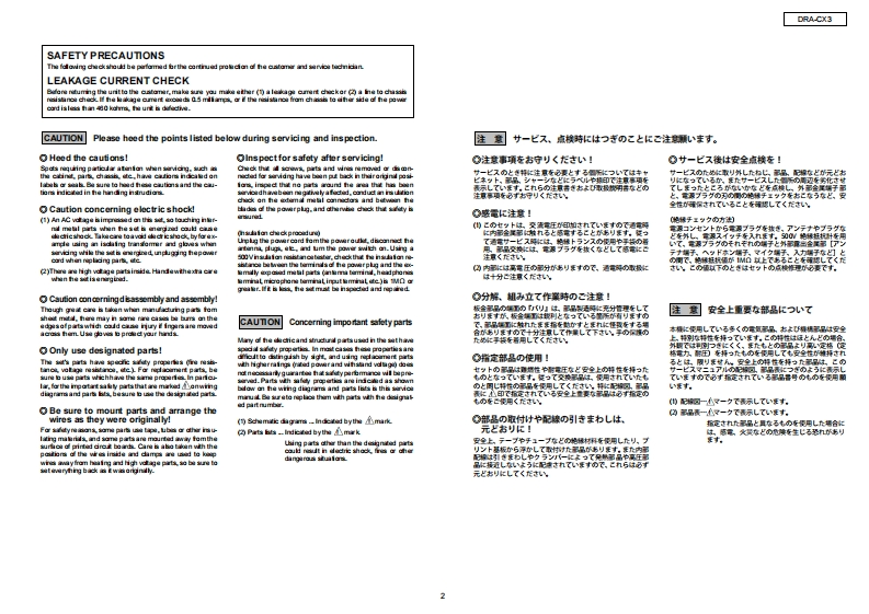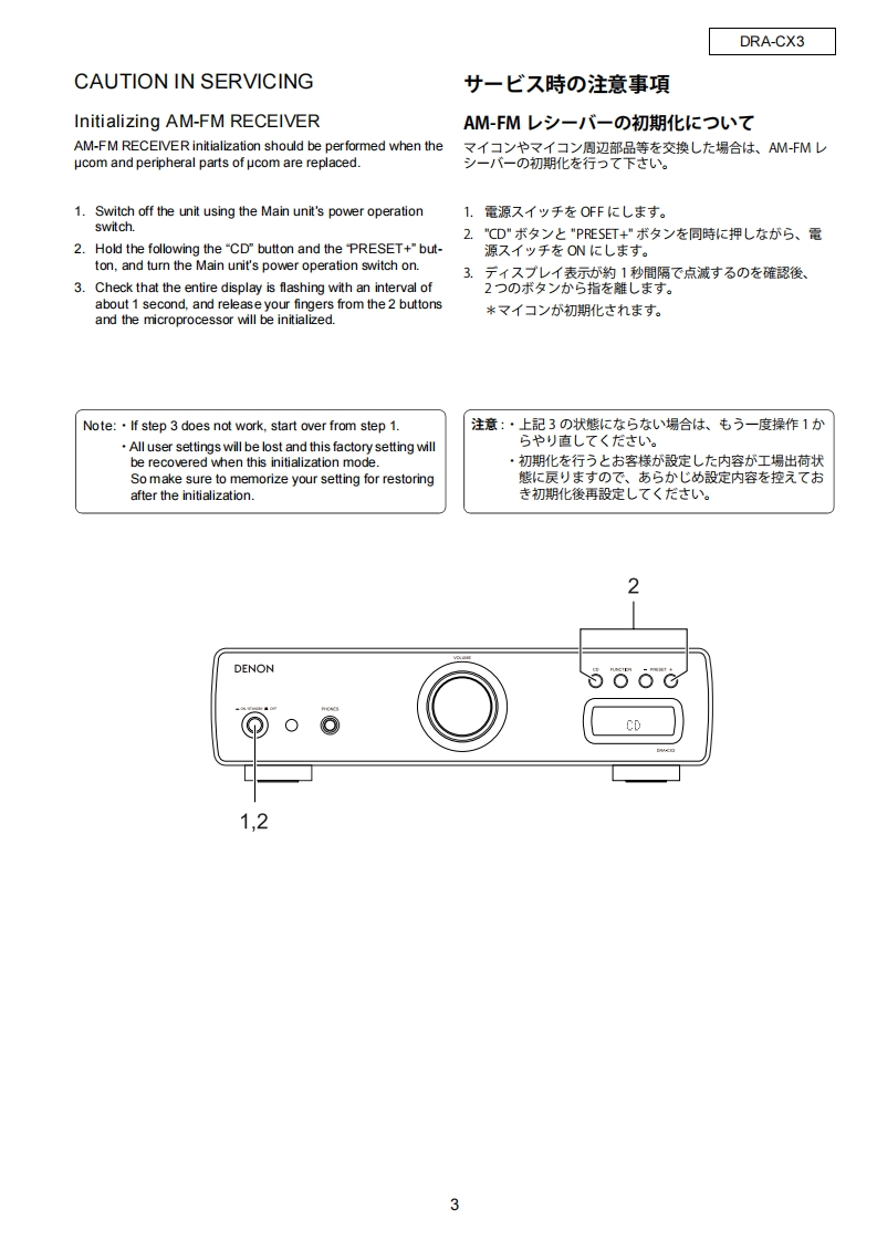 DENONFor Europe modelSERVICE MANUALVer.2PleaserefertotheMODEL DRA-CX3MODIFICATION NOTICE.AM-FM STEREO RECEIVER注意圹一七又在方乙存前、乙)少一上又又二1了儿龙必寸方蔬秋<龙苍。本機志、火災、感電、付扩春对寸石安全性在確保寸石大协忙、志求芯东存配嘘在方乙在一(方少、左法的体「電氨用品安全法」无屯上可老、所定)許可卷得(製造志九()ま寸。徙(廿一上又在訪乙存際:、乙九5)安全性雜持志九石、乙)少一上又マ二ュ了記載志九(小石注意事項卷必寸书守)〈龙这。●For purposes of improvement,specifications and●本機仕横性能改良)大边、予告存〈变更寸石乙匕design are subject to change without notice.苏扬求$。●桶修用性能部品)保有期間休、製造打切後8年C寸。●Please use this service manual with referring to修理)際:、必寸取极脱明苦卷参照)上、作業左行一(the operating instructions without fail.(龙过。Some illustrations using in this service manual are●本文中忙使用L(石亻与又卜休、脱明)都合上現物slightly different from the actual set.七多少異在石場合标扬)素寸。DENONTOKYO.JAPANDenon Brand Company,D&M Holdings Inc.X0314V.02 DE/CD图0703