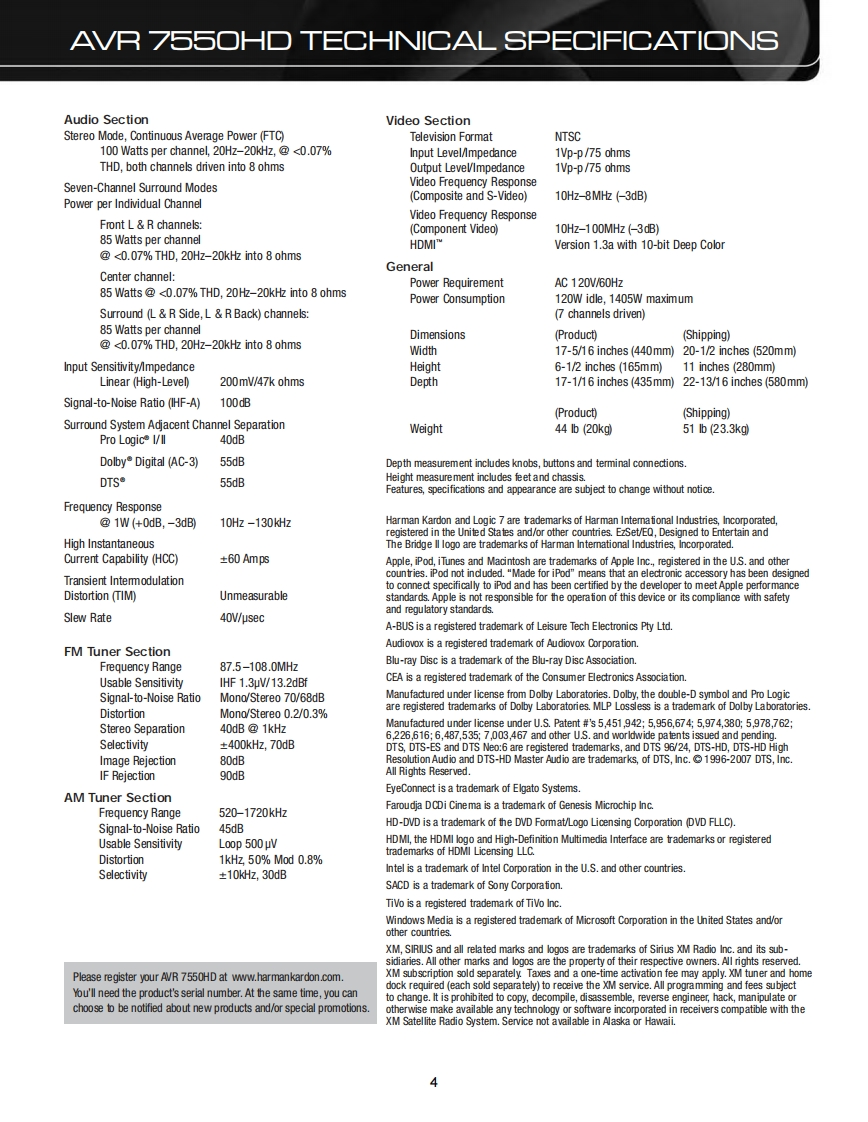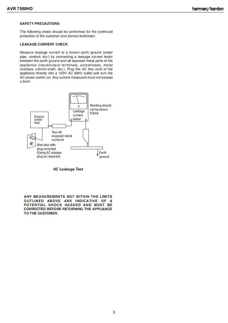 harman/kardonAVR 7550HD7 X 105W 7.1 CHANNEL AN RECEIVERSERVICE MANUALAW阳团HOBLU RAY/HDMIDOLBY VOLUMEharman/kardonCONTENTSESD WARNING.........2PROCESSOR RESET....................30LEAKAGE TESTING...............3UNIT EXPLODED VIEW........................31BASIC SPECIFICATIONS.........EXPLODED VIEW PARTS LIST..32PACKAGING.....5AMP BIAS ADJUSTMENT....................34FRONT PANEL CONTROLS....6BLOCK DIAGRAM...........37REAR PANEL CONNECTIONS...........ELECTRICAL PARTS LIST...................40REMOTE CONTROL FUNCTIONS..........11PCB DRAWINGS....106CONNECTIONS...................14SEMICONDUCTOR PINOUTS...............124OPERATION........22SCHEMATICS..162TROUBLESHOOTING GUIDE.................29WRING DIAGRAM................................186harman/kardon,Inc.250 Crossways Park Dr.Released 2009Woodbury,New York 11797Revo1/2010Discontinued XXXX