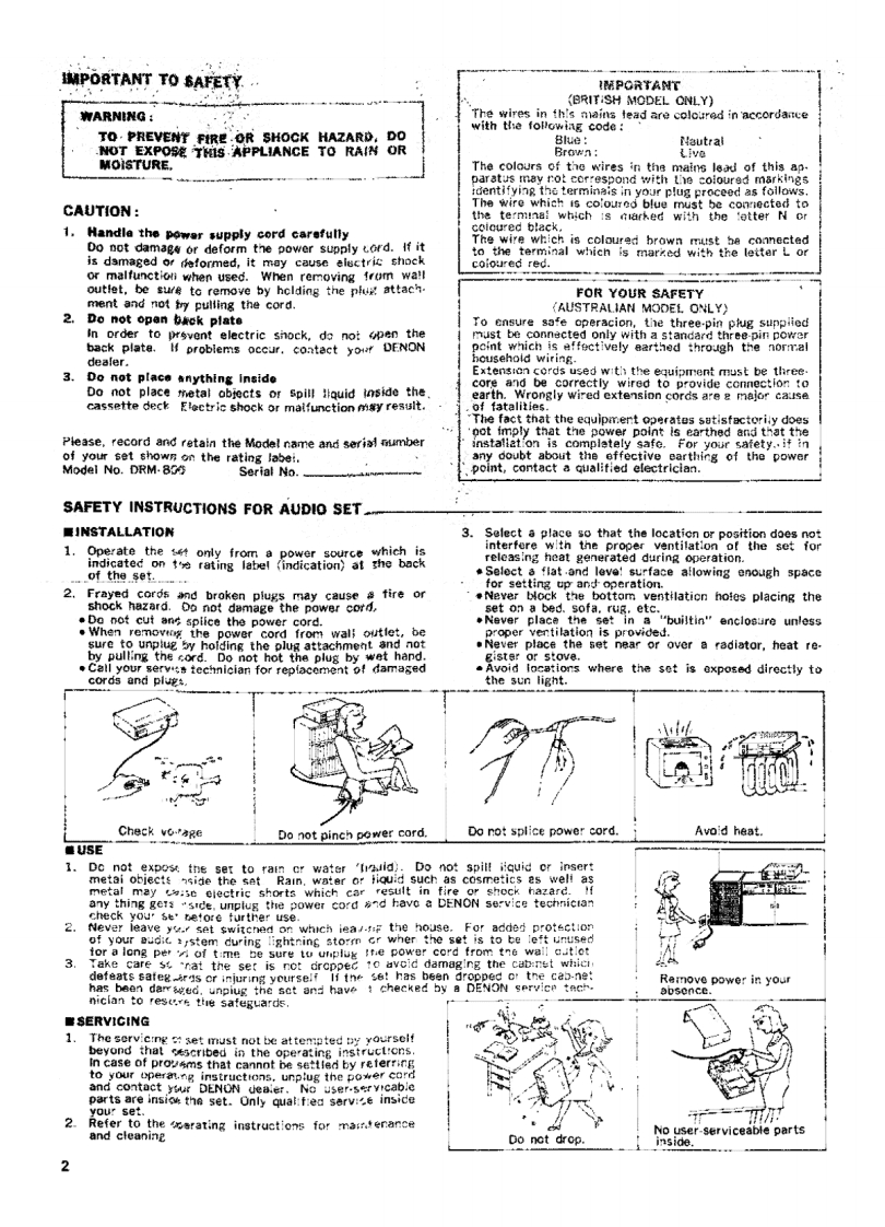 DENONHi-F ComponentSERVICE MANUALSTEREO CASSETTE TAPE DECKMODELDRM-800TABLE OF CONTENTSOPERATING INSTRUCTIONS............................................................211SPECIFICATIONS....................................................................IBLOCK DlAGRAM..........................…12LEVEL DIAGRAM.,·…….13DISASSEMBLY INSTRUCTIONS..................................................14-15ADJUSTING AND CHECKING THE MECHANISM SECTION..........................15-17ADJUSTING THE ELECTRCAL SECTIONS..........1719PARTS LIST OF EXPLOPED VIEW.................……20EXPLODED VIEW OF CABINET AND CHASSIS GROUP.,···.…21PARTS LiST OF 4U-1817/4U-1823/MECHANISM EXPLODED VIEW.......................22EXPLODED VICW OF MECHANISM...,、.....…23PARTS LIST OF 4U-1816.................................................24WNG0 AGRAM.25SCHEMATIC DIAGRAM...........................26-27P.W.BOARD OF 4U-1816....8PW80A8D0F4U-1817f4-1823.··……···…29SEMICONDUCTORS.........30NIPPON COLUMBIA CO LTD