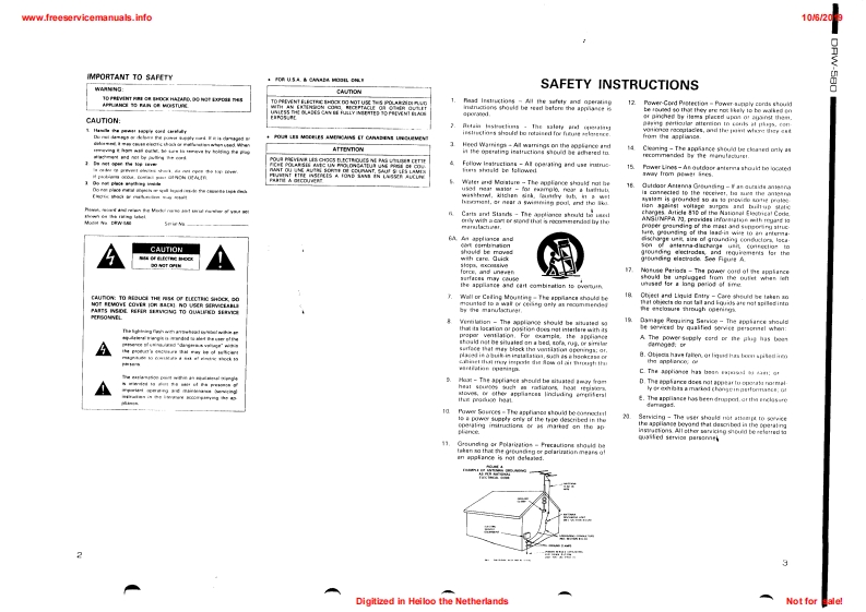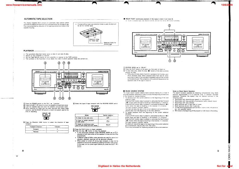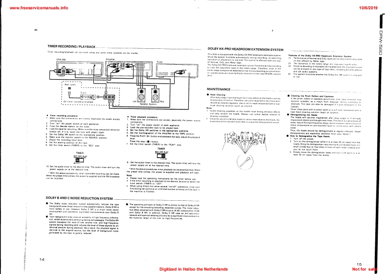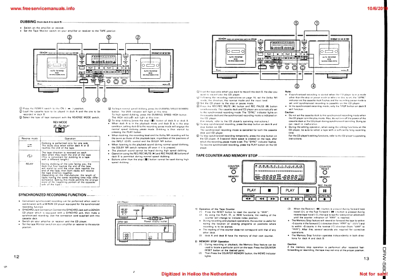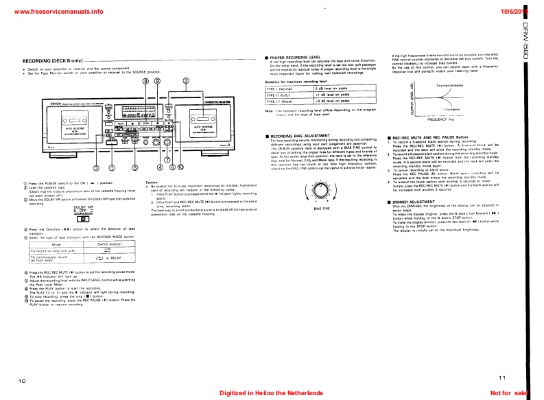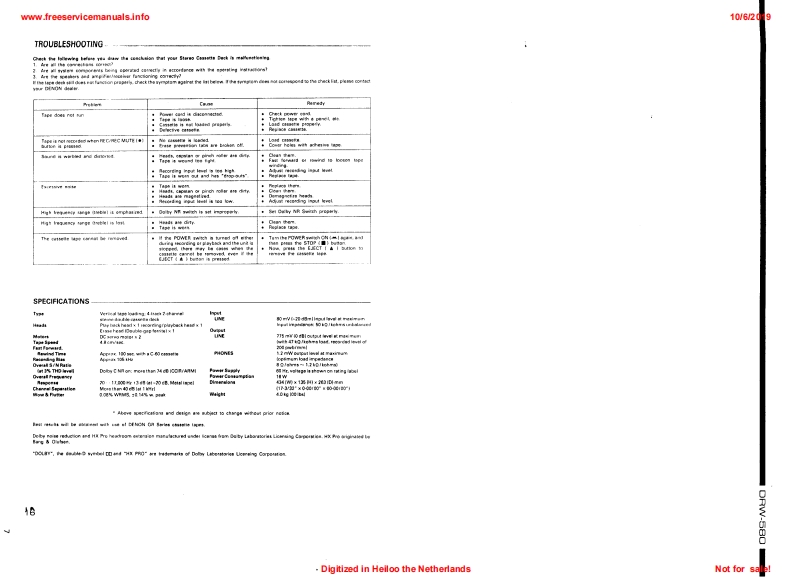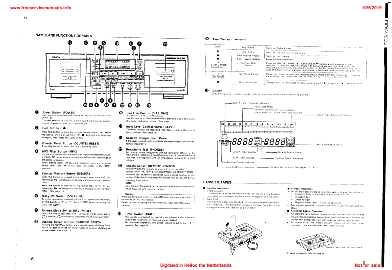 www.freeservicemanuals.info10/62019DENONSERVICE IMANUALMODEL DRW-580STEREO CASSETTE TAPE DECKDENONa158e总0200出TABLE OF CONTENTSOPERATING INSTRUCTIONS.....................2-7DISASSEMBLY INSTRUCTIONS.......8,9ADJUSTING AND CHECKING THE MECHANISM SECTION.............10ADJUSTING THE ELECTRICAL SECTIONS............11-13BLOCK DIAGRAM.......14PARTS LIST OF EXPLODED VIEW......…16EXPLODED VIEW OF CHASSIS AND CABINET.....17KU-9322 AUDIO P.W.B.UNIT ASS'Y…18KU-9323 DISPLAY P.W.B.UNIT ASS'Y....KU-9324 POWER P.W.B.UNIT ASS'Y........19.20NOTE FOR PARTS LIST.….21PRINTED WIRNING BOARD PARTS LIST..............21-23BUNDEL DIAGRAM............23WIRING DIAGRAM.........24SCHEMATIC DIAGRAM.......25SEMICONDUCTOR.............26NIPPON COLUMBIA CO..LTDDigitized in Heiloo the NetherlandsNot for sale!