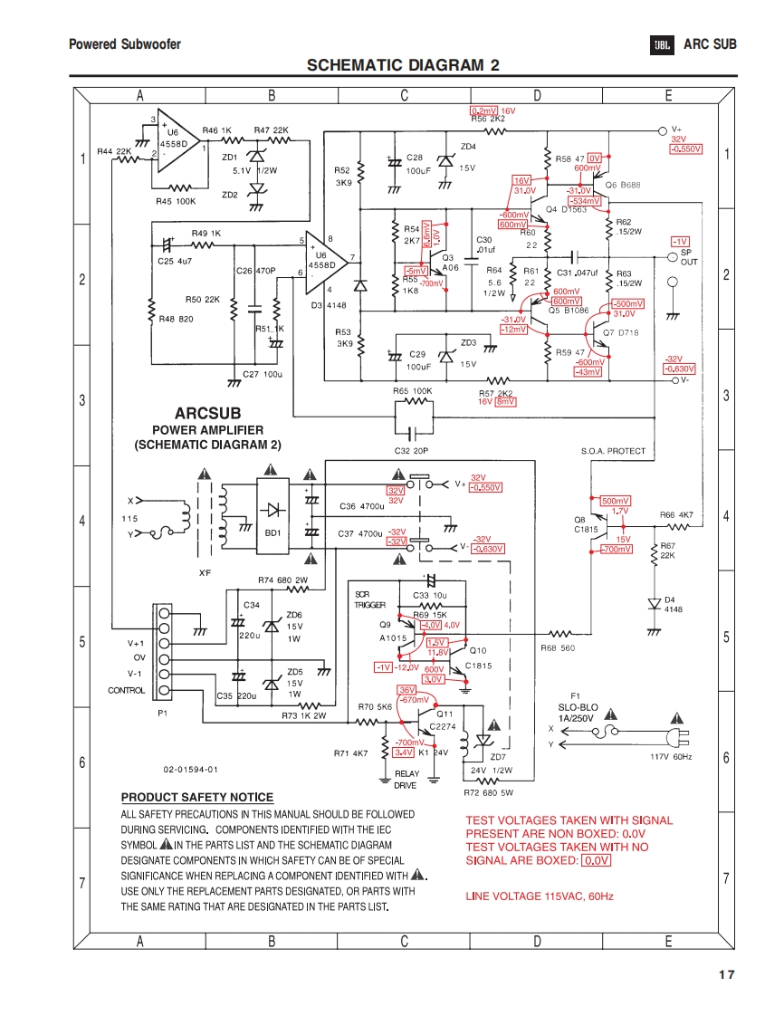 Powered SubwooferJBLARC SUBSCHEMATIC DIAGRAM 1ABCDER OUT(-)LOW LEVELHI-LEVEL(⊙HW+13C11.015uf1R OUT(+)2100uC44u7A1047KU2U2Ohw4558C9.015u1558RN(+)R8 4K7455日HI-LEVELR6270KC820PC10015u202M2RIN()R16HwR447KA18379K47H2R1923K25>R4R12C7.015uHI-PASS33K2WC6100fALTER2w市市R17379K2M2W.1L OUT-)●9R32HI-LEVELC34u7R947KK1L OUT(+)R74K73U1A5270K455B5L IN (+U3而C12u1H-LEVEL4558C20u22wL ING)A13R1147K月21930R1C13001u310033K32市.2W7C5100PR22930KARCSUBPRE-AMPLIFIER在C14uE8(SCHEMATIC DIAGRAM 1)U3R23141K5R2473K858C17u3327160K4558Mw-MWwC21470PR26320K4C16.0039ufC19.001udR33220NWw人o。SUBFREQR25147K5C18.0056ufR28320KVV-1C15.033uf市U52而4558350mV OV]V+1C241000u/25V+315.0VP112R37 10KR394715V5V+158.0V16VR3610K月4010KD14148M02A1015+1.1C prd 022u01C1815-15.0R341KP381KA3510K300mVC22100uW4558-15VA433K3-15V-8V10.07R412M7370mWR423K3C23.1ulov]AUTO ON-OFF CCTLED1办PRODUCT SAFETY NOTICEDUALCOLOR02-01593-016ALL SAFETY PRECAUTIONS IN THIS MANUAL SHOULD BE6FOLLOWED DURING SERVICING.COMPONENTS IDENTIFIEDWITH THE IEC SYMBOL IN THE PARTS LIST AND THEwR2910KU4VR2 20KBSCHEMATIC DIAGRAM DESIGNATE COMPONENTS IN WHICH4558P117-25mWSAFETY CAN BE OF SPECIAL SIGNIFICANCE WHEN REPLACING6R3010KVOL-25mWA COMPONENT IDENTIFIED WITHA.USE ONLY THE REPLACEMENT办PARTS DESIGNATED,OR PARTS WITH THE SAME RATING THAT ARER3110KDESIGNATED IN THE PARTS LIST.7TEST VOLTAGES TAKEN WITH SIGNAL PRESENT ARE NON BOXED:0.0VLINE VOLTAGE 115VAC.60HzTEST VOLTAGES TAKEN WITH NO SIGNAL ARE BOXED:0,0VBCDE16