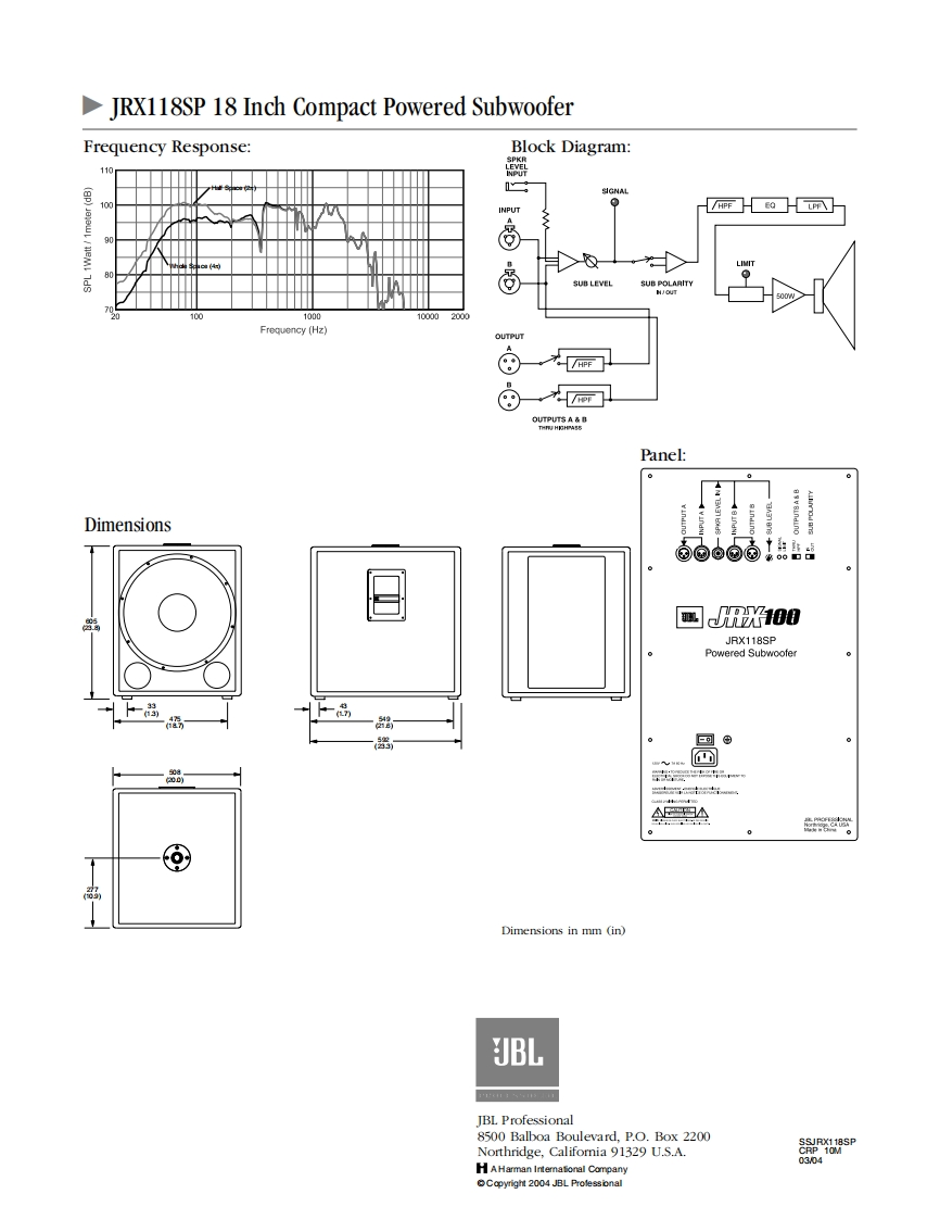 18 InchJBLRX118SPCompactPoweredSubwoofer100Key Features:The rugged enclosure isconstructed from 19 mm in)MDF (Medium Density Fiberboard)using advanced adhesives andmechanical fastener technology fordurability and improved low-frequency performance.Theenclosure is covered in blackcarpet.Heavy duty,all steel handles areused.A top mounted,cast aluminum35 mm pole mount receptacle canreceive an optional SS3BK pole tofacilitate use of the JRX118SP as abase for a mid-high speakercabinet.Built-in 500 watt (peak),300 wattWith JRX112M and(continuous)amplifer.Controls,available SS3BKconnectors,and indicators areclearly labeled with large,high-contrast graphics for easy operationThe JRX118SP is designed to supplement and extend the low frequencyin poorly lit environments.performance of full-range systems in live sound and music playback appli-cations.It is an excellent choice for use with powered full-range speakersIntegral,preset limiter preventsor in systems using powered mixers.clipping distortion.An LEDilluminates to indicate that limitingSpecifications:is taking place.System Type:Powered,18"compact subwooferLine-level stereo inputs areFrequency Range (-10 dB):'38 Hz 300 Hzsummed before being sent to theFrequency Response (3 dB):55 Hz -300 Hzsubwoofer's internal amplifier.ThisNominal Impedance:4nfeature allows the IRX118SP toRated Maximum SPL2 123 dB peak,@1 m (3.3 ft)at 500 wattsoperate in stereo systems using aDimensions (H x Wx D):605 mm x 508 mm x 592 mmsingle subwoofer.(23.8inx20.0inx23.3in)An integral crossover also providesNet Weight:40.4 kg (89 lb)including castersbalanced,line-level,stereo,high-Shipping Weight:45 kg (99 lb)passed outputs to feed poweredLF Driver:2043-Gsatellite speakers or an externalAmplifier Power:Continuous:300 watts with 0.2%THDPeak:500 wattsamplifier for passive satellites.Input Connectors:2 x XLR/F,balanced,line levelA speaker-level,TS phone jack1xphone jack,speaker levelis provided.This input is useful inInput Impedance:Nominally 20k Ohms,electronically balancedapplications,such as thoseInput Sensitivity:0.5 Vrms for 300 watt output (SUB LEVEL control fullyemploying powered mixers,inclock-wise)which it is more practical to bringMaximum Input Level:INPUTS A B:+4 dBu (nominaD,+22 dBu (max.).onea full-range,speaker-level signal tochannel driventhe subwoofer amplifier.Output Connectors:2 x XLR/MCrossover:LPF:100 Hz,24 dB OctThe JRX118SP is an 18 inch direct-Infrasonic filter:25 Hz,18 dB Octradiating powered subwoofer.ARequired AC Mains:50/60 Hz (North American units are 60 Hz only);120 and 230-built-in 500 watt (peak)amplifier240 VAC (+10%)units are availableaccepts stereo or mono line levelAC Line Current:120 volts:1.4 A at power with sine-wave input,3.6 A atinputs via balanced,XLR connectorsmax.power with pink noise inputas well as single channel speaker230-240 volts:0.7 A at power with sine-wave input,1.8 A atmax.power with pink noise inputlevel input via a k inch phone jack.Power Consumption at Idle:No more than 20 wattsI