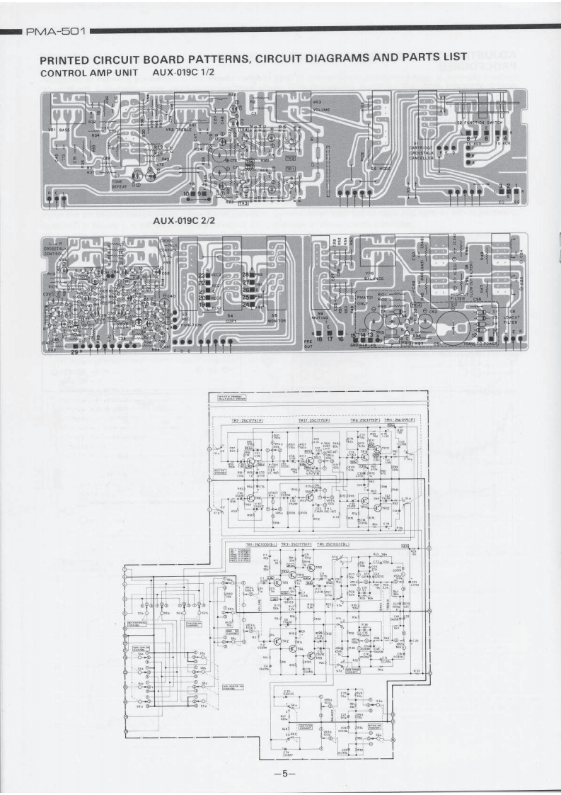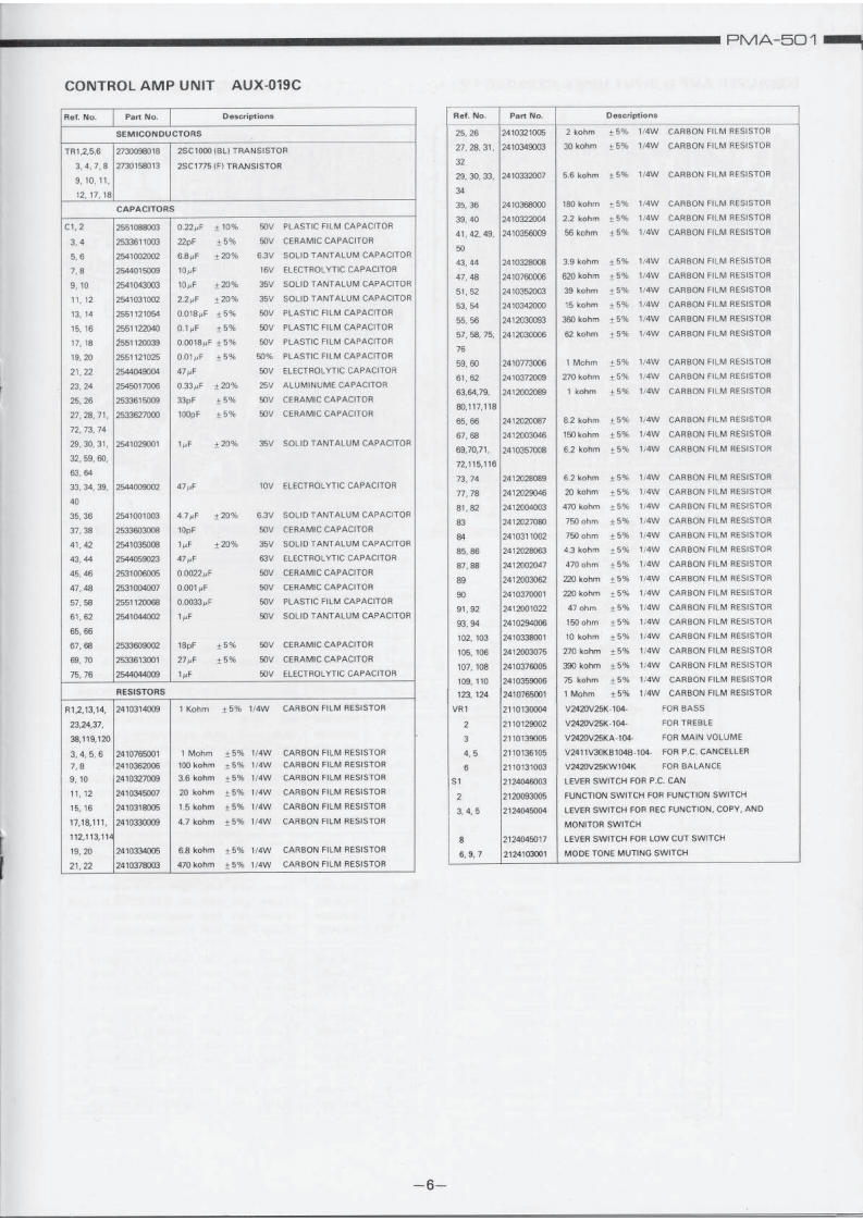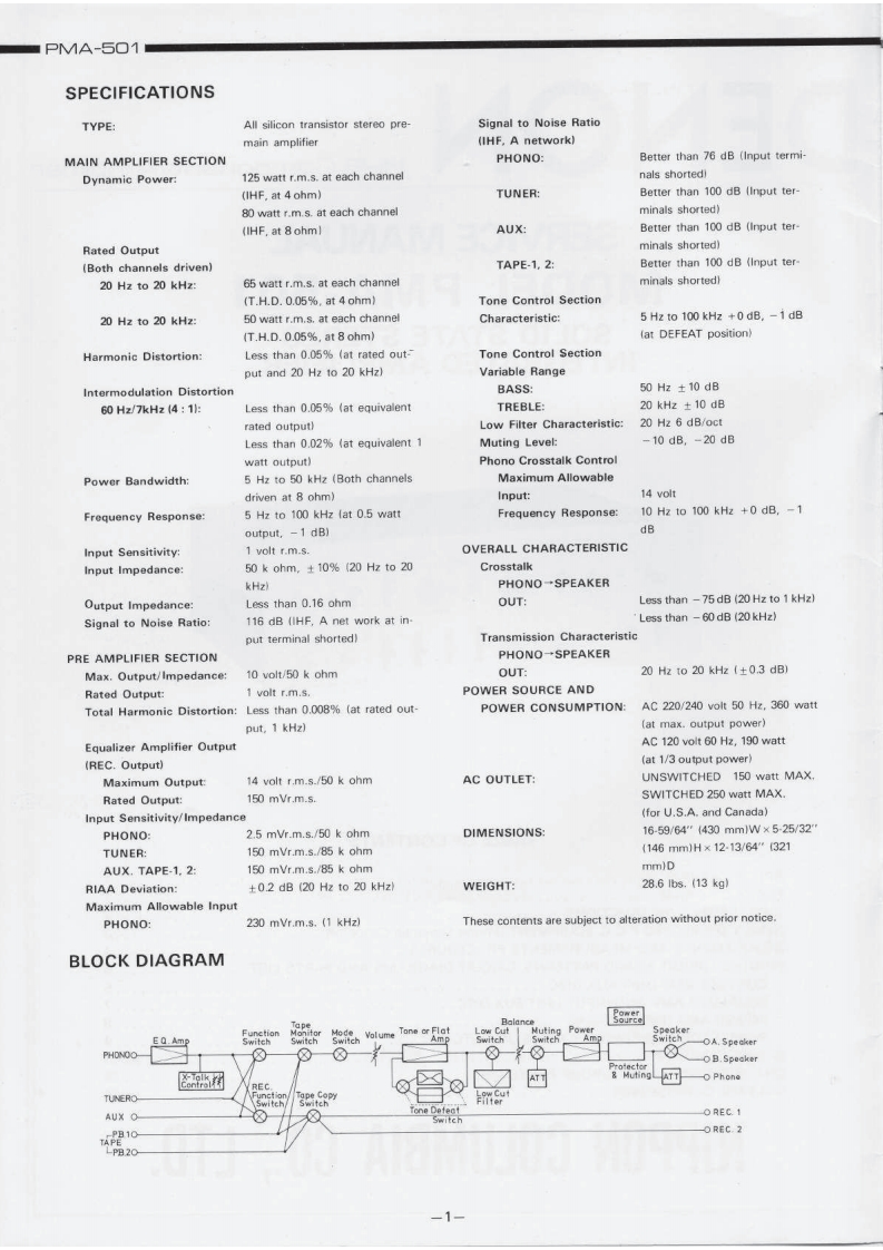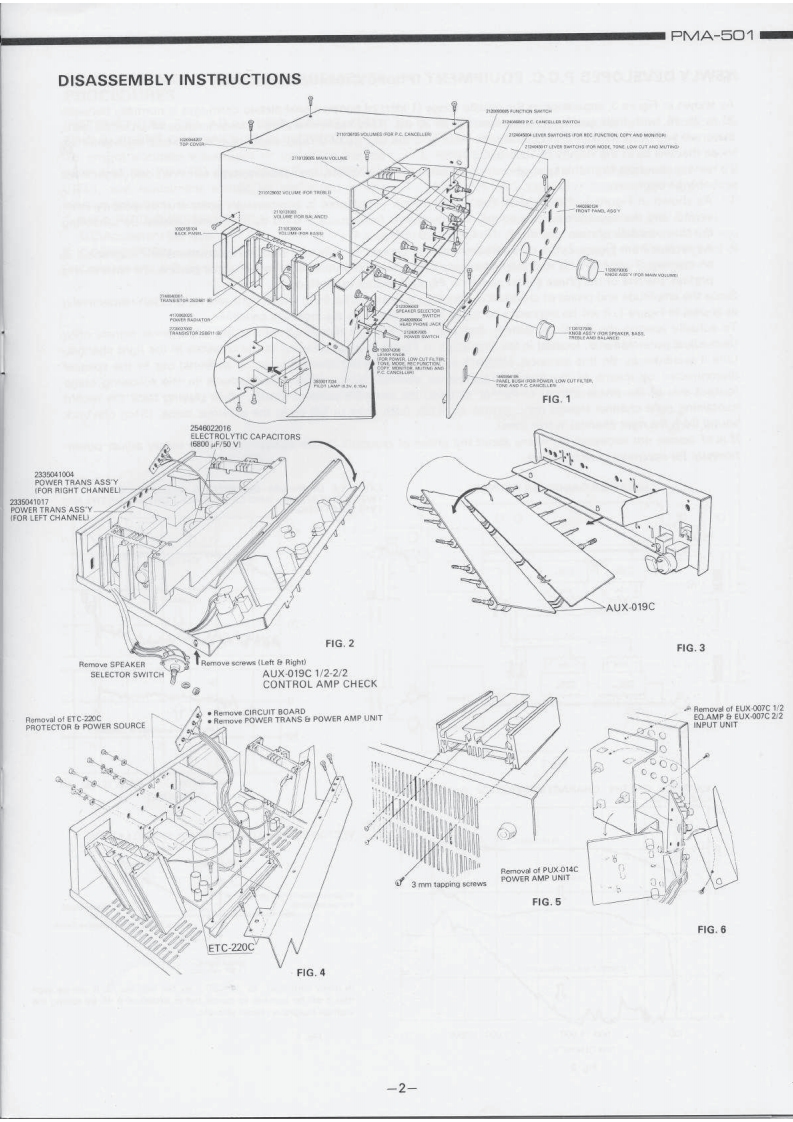 DENONHi-Fi Component/AmplifierSERVICE MANUALMODEL PMA-501SOLID STATE STEREOINTEGRATED AMPLIFIERoTABLE OF CONTENTSSPECIFICATIONSBLOCK DIAGRAM...DISASSEMBLY INSTRUCTIONS....2NEWLY DEVELOPED P.C.C.EQUIPMENT (Phono Crosstalk Canceller).........................3ADJUSTMENTS AND MEASUREMENTS PROCEDURES....PRINTED CIRCUIT BOARD PATTERNS,CIRCUIT DIAGRAMS AND PARTS LIST.,·.·.·.·.,..5CONTROL AMP UNIT AUX-019C...EQUALIZER AMP AND INPUT UNIT EUX-007C.........................................7POWER AMP UNIT PUX-014CPROTECTOR AND POWER SOURCE UNIT ETC-220C....................................9WIRING DIAGRAM ....................10,11CHASSIS AND CABINET GROUP PARTS LIST...............................14VOLTAGE CHANGEOVER1NIPPON COLUMBIA CO.LTD.