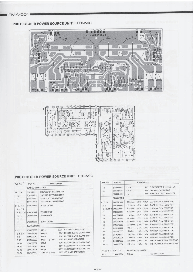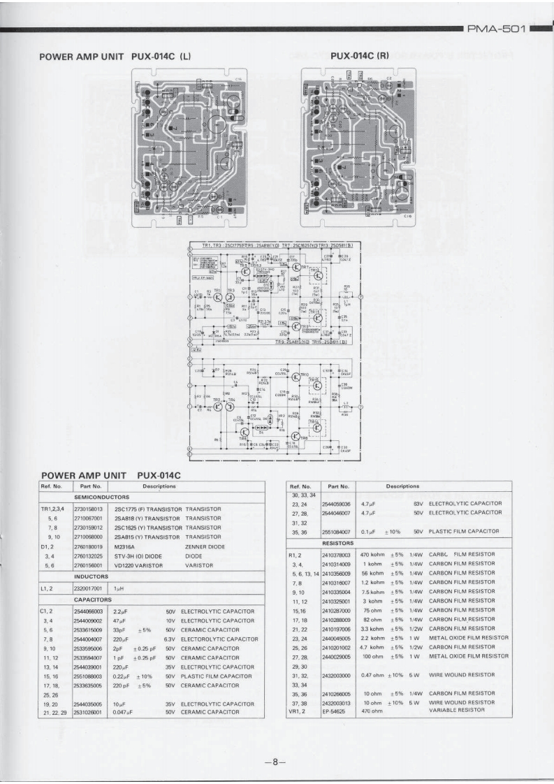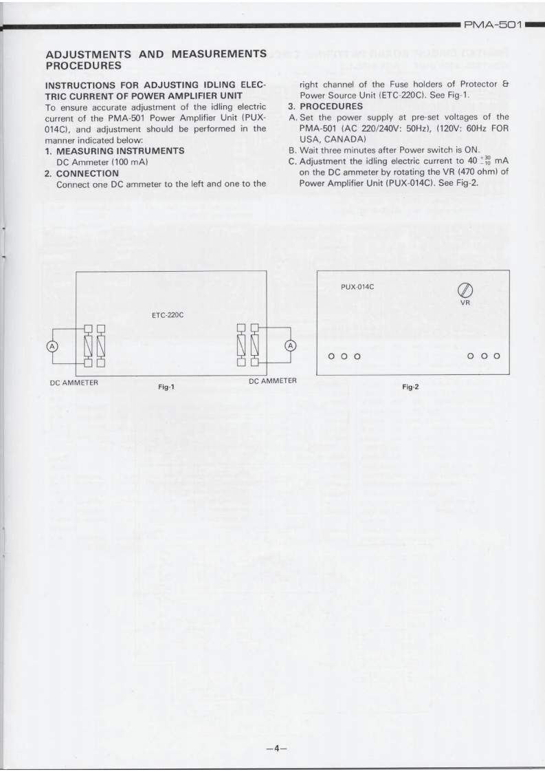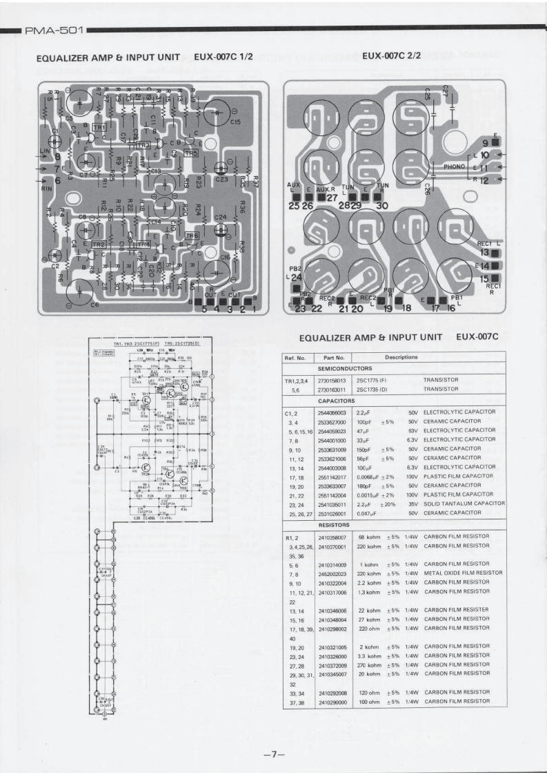 DENONHi-Fi Component/AmplifierSERVICE MANUALMODEL PMA-501SOLID STATE STEREOINTEGRATED AMPLIFIERoTABLE OF CONTENTSSPECIFICATIONSBLOCK DIAGRAM...DISASSEMBLY INSTRUCTIONS....2NEWLY DEVELOPED P.C.C.EQUIPMENT (Phono Crosstalk Canceller).........................3ADJUSTMENTS AND MEASUREMENTS PROCEDURES....PRINTED CIRCUIT BOARD PATTERNS,CIRCUIT DIAGRAMS AND PARTS LIST.,·.·.·.·.,..5CONTROL AMP UNIT AUX-019C...EQUALIZER AMP AND INPUT UNIT EUX-007C.........................................7POWER AMP UNIT PUX-014CPROTECTOR AND POWER SOURCE UNIT ETC-220C....................................9WIRING DIAGRAM ....................10,11CHASSIS AND CABINET GROUP PARTS LIST...............................14VOLTAGE CHANGEOVER1NIPPON COLUMBIA CO.LTD.