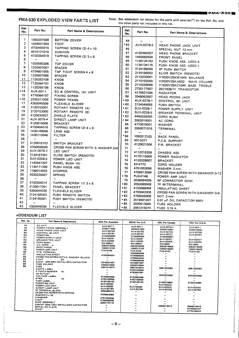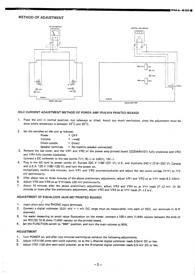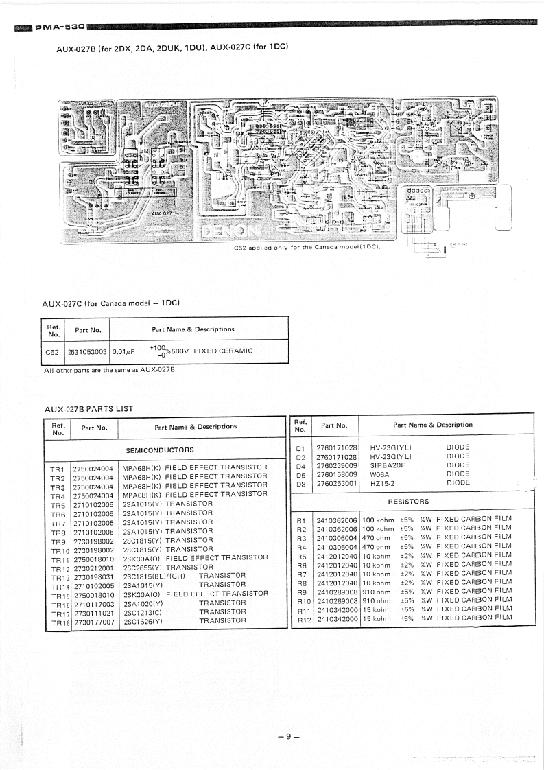 DENONHi-Fi Component AmplifierSERVICE MANUALMODEL PMA-53▣DENON当立古当::9.1355SPECIFICATIONS1BLOCK DIAGRAM,,··,,,,.·1METHOD OF ADJUSTMENTS.....2NOTES ON SERVICING REMOTE SWITCH.,.,,.·..·.3,4EXPLODED VIEW OF CHASSIS AND CABINET..·..··,,·.,·,····5PARTS LIST FOR EXPLODED VIEW.·,·,.,··,..·PRINTED CIRCUIT BOARD PATTERNS AND PARTS LISTEQ UNIT AUE-007....,..,,,,,,,,7.8CONTROL (B)UNIT AUX-027B ........9,10POWER AMP UNIT PUS-014B,.·,·····11~13POWER SUPPLY UNIT SUX-023B .........14POWER SUPPLY UNIT SUX-023C,SUX-023D.....··,·.·.·,.·17SCHEMATIC CIRCUIT DIAGRAM,,,..·,·,·,······,··,·,,··15,16NIPPON COLUMBIA CO.,LTD.