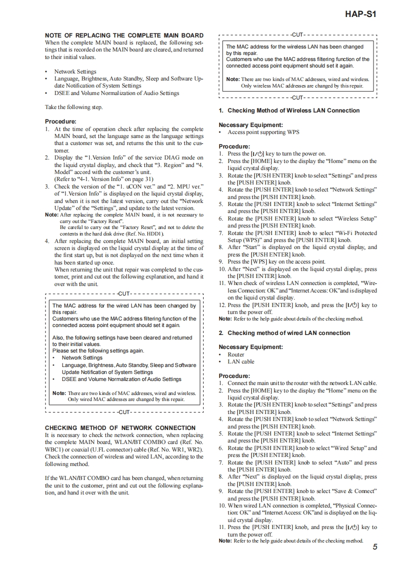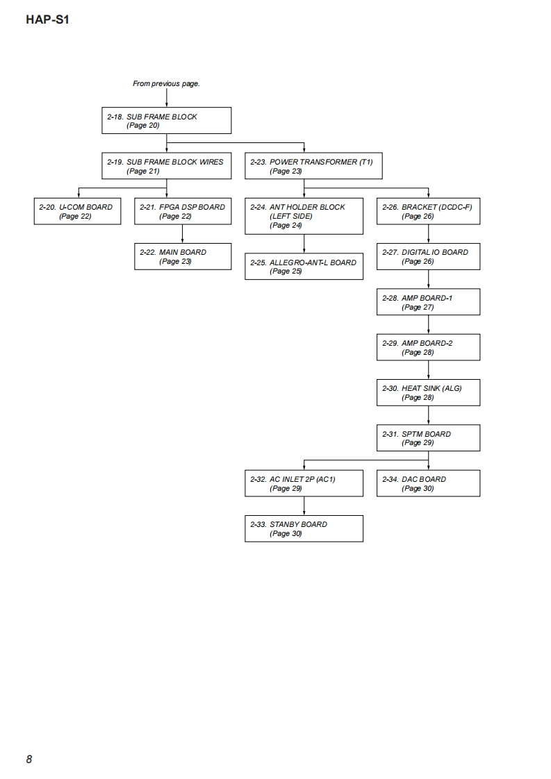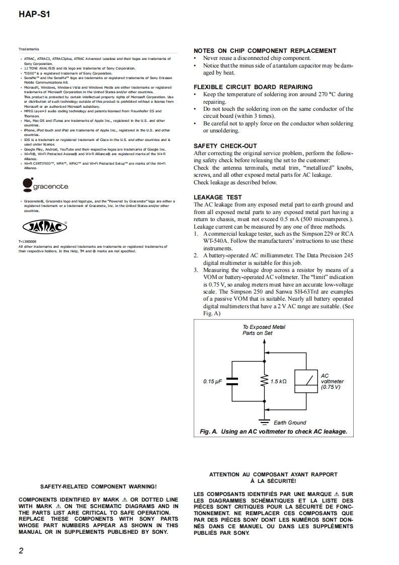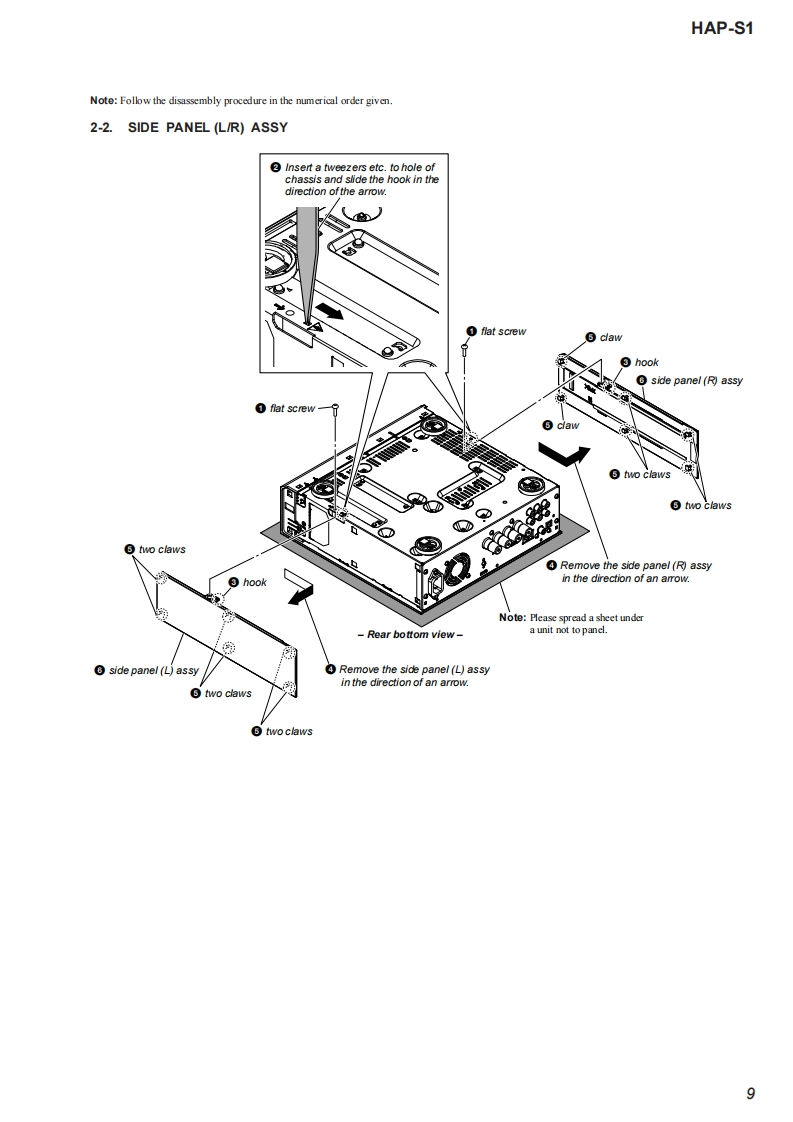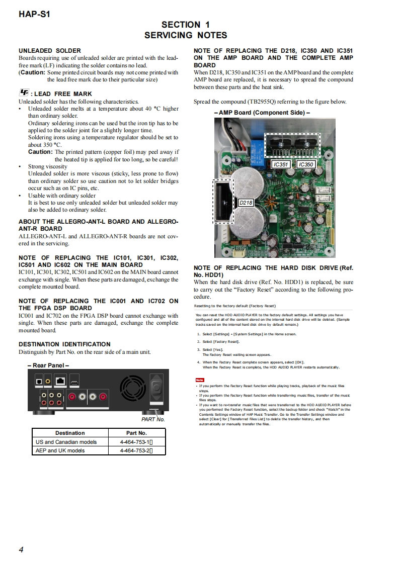 HAP-S1SERVICE MANUALUS ModelCanadian ModelVer.1.02013.10AEP ModelUK ModelNote:Be sure to keep your PC used for service andchecking of this unit always updated with thelatest version of your anti-virus software.In case a virus affected unit was found duringservice,contact your Service Headquarters.SPECIFICATIONSAUDIO POWER SPECIFICATIONSLINE IN 1,2POWER OUTPUT AND TOTAL HARMONIC DISTORTION (for the USA and CanadaInput sensitiity:500 mvonly):nput imped由nae:1o0amGwth 4 ohm loads,both driven,from 20-20,000Hz;rated 32 watts per channdOutput sectionminimum RMS power,with no more than 10%total harmonic distortion from 250 millwatts toOuout adesrated outout.LINE OUTAmplifier sectionOutput impedance:2.2 MlohmsPOWER OUT RUT:40W+40W4ams,1收,THD10%)2收80收-3d回Rated:35W+35Wm,1地,THD.9%)PHONES (headphone jack)Steo jack:8 ohms or higherFequ8 ncy response:10位,100收(t0d8,-3dB)(4ohs,IEEXT portNetwork sectionType A USB,Hi-Speed USB,for connecting an external hard dsik driveWired LANGeneral and others1000BASE-T/100BASE-TX/10BASE-TPower requlrcmcntsWirdless LANband,channels1-ll(models for the USA and Canad,Power consumptionModels for the USA and Canada0n:80WHDD sectionDuing standby mode (when Network Standby is set to [om):0.3 wCapacityDurng standby mode (when Network Standby is sct to [On]and a wired LAN is used):2.6 W500G89During standby mode (when Network Standby is set to [On and a wireless LAN is used):2.8ared tordataThre,the capyaNModels for EuropeSupported playback format0n:85WDuring standby mode (when Network Standby is sct to [):0.3 WDuring standby mode (when [Network Standby is set to [On]and a wired LAN is used):26WJack sectionDurng standby mode (when Network Standby is set to [On and a wireless LAN is used):2.8Input sectionDimensions (approx.)(w/h/d)COAXIAL IN265 mm x 88 mm x 304 mm (10 1/2 in.x 3 1/2 in.x 12 in.)induding pojecsing parts andMass(apprax.】+53mpge9 uency:44.1收,48收,38.28收,950收,1754收,192收Quantization bits:16 bts,24 bits58g(121258aOPTICAL INSupplled accessoriesSupported playback format:LPOM 2ch+5 ampling tre98nc44.1收,48收,88.2收,95位Quantization bits:16 bts,24 bitsLAN cable (1)Design and spedifications ae subject to change without notice.HDD AUDIO PLAYER SYSTEM9-893-833-012013J33-1Sony Corporation©2013.10Published by Sony Techno Create CorporationSONY