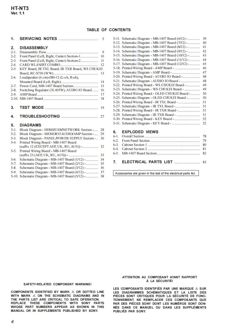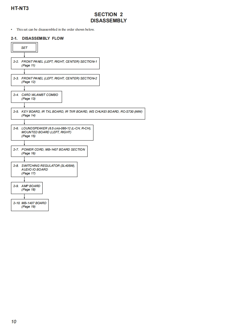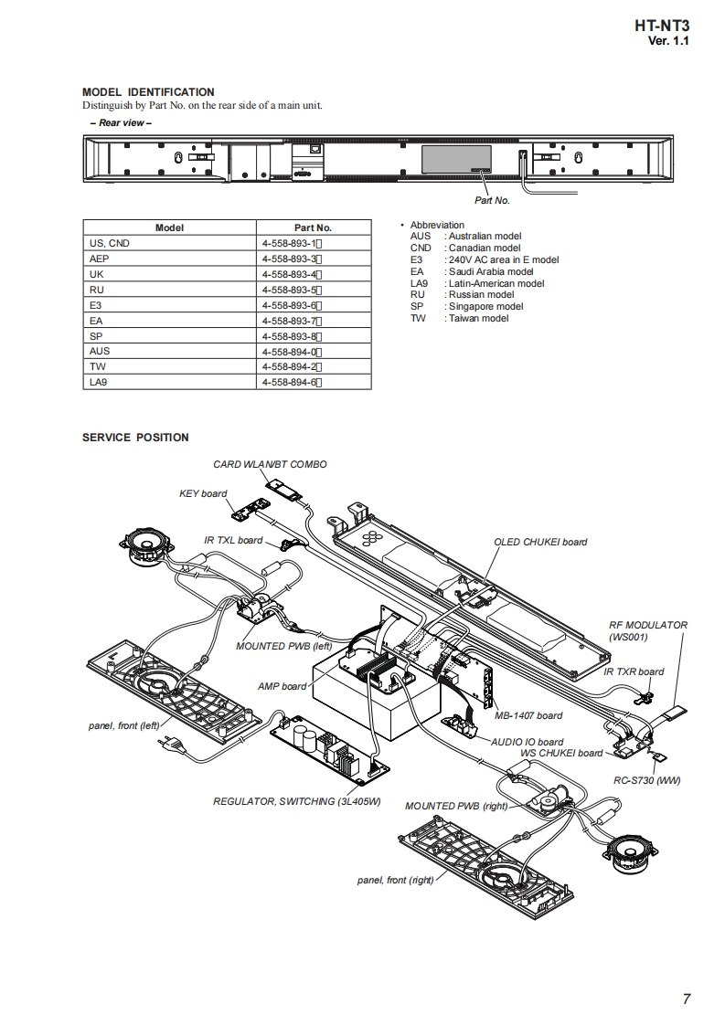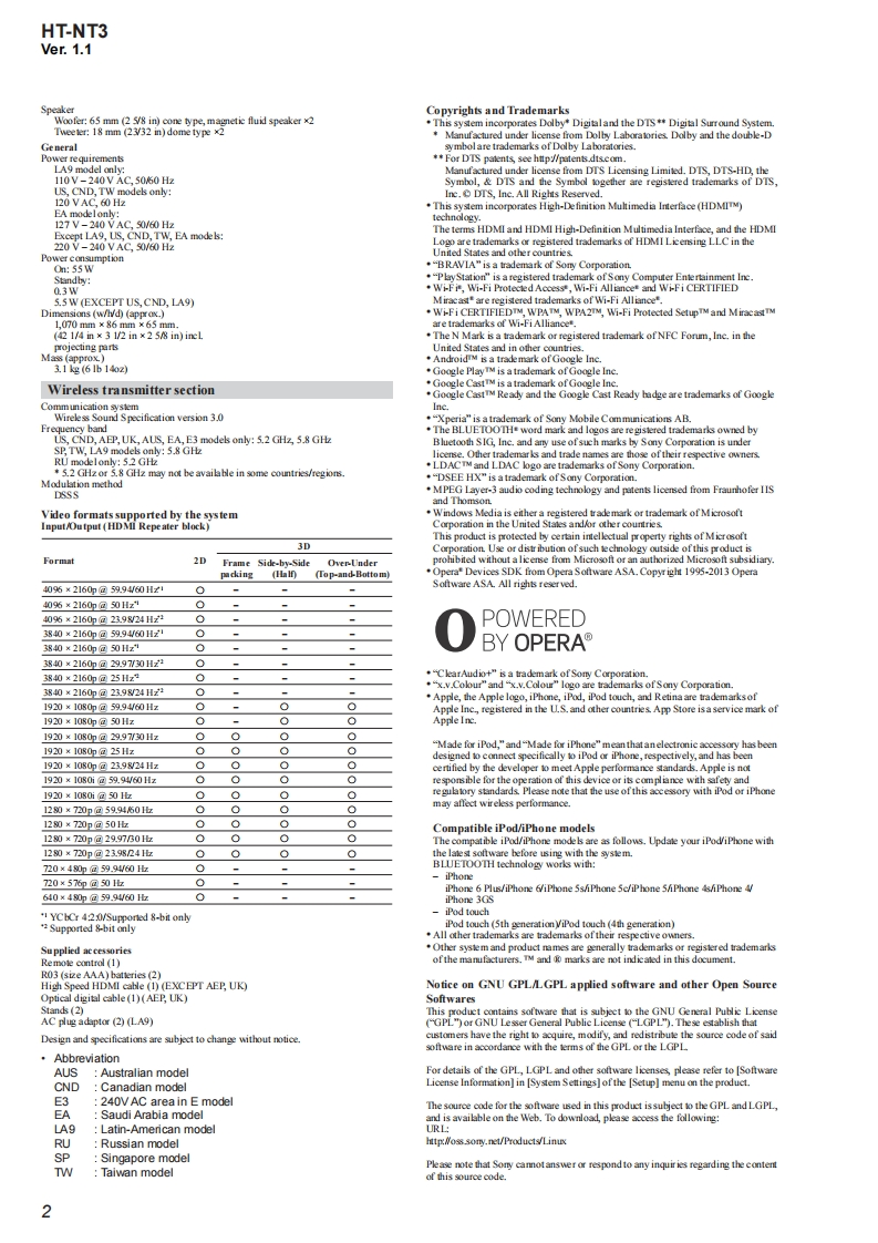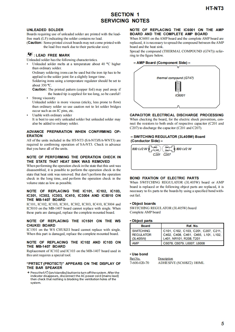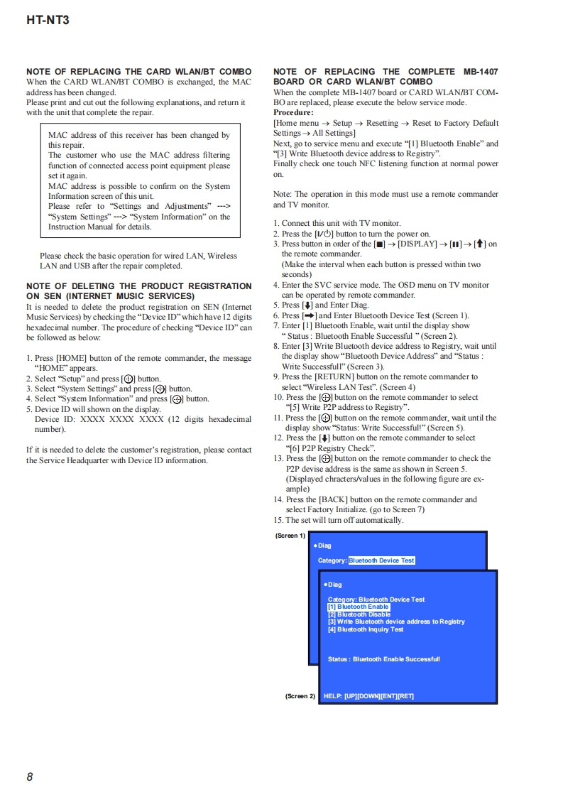 HT-NT3SA-NT3SERVICE MANUALUS ModelCanadian ModelVer.1.12015.05AEP ModelUK ModelEModelAustralian ModelPhoto:SA-NT3All of the units included in the HT-NT3 (SA-NT3/SA-WNT3)are required to confimming operation of SA-NT3.Check in advance that you have all of the units.COMPONENT MODEL NAMEHT-NT3Bar Speaker(Active Speaker System)SA-NT3Subwoofer(Active Subwoofer)SA-WNT3SPECIFICATIONSAmplifier sectionHDMI IN 1 and HDMI OUT jacks support HDCP2.2Frequency bandUS model only:protocol.HDCP 2.2 is newly enhaneed copyright24G出POWER OUTPUT AND TOTAL HARMONICprotection technology that is used to protect contentModulation methodDISTORTION:such as 4K movies(FTC)HDMI sectioncFront L+FrontR:A2DP 1.2 (Advanced Audio Distribution Profile)With 4 ohms loads,both channels dr iven,fromConnectorAVRCP 1.5 (Audio Video Remote Control Profile)300Hz-20,000Hz rated 50 watts per chamelType A (19pin)minimum RMS power,with no more than 1%otalUSB sectionharmonie distortion from 250 milliwatts to rated业LSB)potTypeA(For conecting USB memoy,memoryTransm ission range (A2DP)OUTUT()20 Hz-20,000 Hz (Sampling frequency 44.1 kHz,card readet,and digital still camera)48 kHz,88.2 kHz 9 kHz)Front L/Front R:LAN sec tion1)The actual range will vary depending on factors such133 W(per channel at 4 ohms,1 kHz)LAN (100)terminals obstcles between devices magneuic fields aroundExcept US model100BASE-TX Terminaa microwave oven,static electr icity,cordless phone,POWER OUTPUT(rated)Wire less LAN sectionreception sensitivity,antenna's perfor mance,operatingFront L+FrontR'Standards Compliancestem,sottware application etc.60W+60W(a4ohm1k比,1%THD)IEEE 802.11 a/b/g/2)BLUETOOTH standard profiles indicate the purposePOWER OUTPUT (refe rence)of BLUETOOTH communication between de vicesFront L/FrontR:3)Codec:Audio signal compression and conversion133 W(per channel at 4 ohms,1 kHz)lors1BLUETOOTH sectionInputs4)Subband CodeeHDMI IN P8Communcation systemFront L/Front R speaker sectionTV (DIGITAL IN)BLUETOOTH Specification version 3.0OutputSpeaker systemANALOG INBLUETOOTH Specification Power Clss 12.wary speaker system,Acoustic suspensionHDMI OUT (ARC)Continued on next page-HT-NT3SOUND BARSA-NT3ACTIVE SPEAKER SYSTEM9-890-666-022015E81-1Sony Corporation©2015.05SONYPublished by Sony EMCS(Malaysia)PG Tec