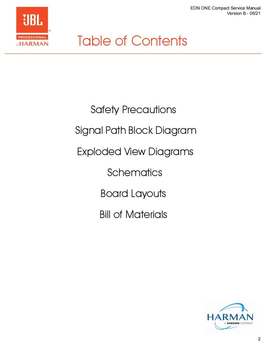 JBL_EON_ONE_Compact_ServiceManual_vB维修手册电器原理图找手册网3天前发布关注私信7.91MB28页027JBL_EON_ONE_Compact_ServiceManual_vB维修手册电器原理图此内容为付费资源,请付费后查看¥19¥21黄金会员免费钻石会员免费立即购买您当前未登录!建议登陆后购买,可保存购买订单付费资源 第1页 / 共28页 第2页 / 共28页 第3页 / 共28页 第4页 / 共28页 第5页 / 共28页 第6页 / 共28页 第7页 / 共28页 第8页 / 共28页 第9页 / 共28页 第10页 / 共28页 试读已结束,还剩18页,您可下载完整版后进行离线阅读 THE ENDJbl/Onkyo 文本预览 EON ONE Compact Service ManualVersion B-05/21JBLPROFESSIONALHARMANService ManualEON ONE CompactAll-in-One Rechargeable Personal PA90000国HARMANA SAMSUNG COMPANY1 查看更多 收起部分 喜欢就支持一下吧收藏