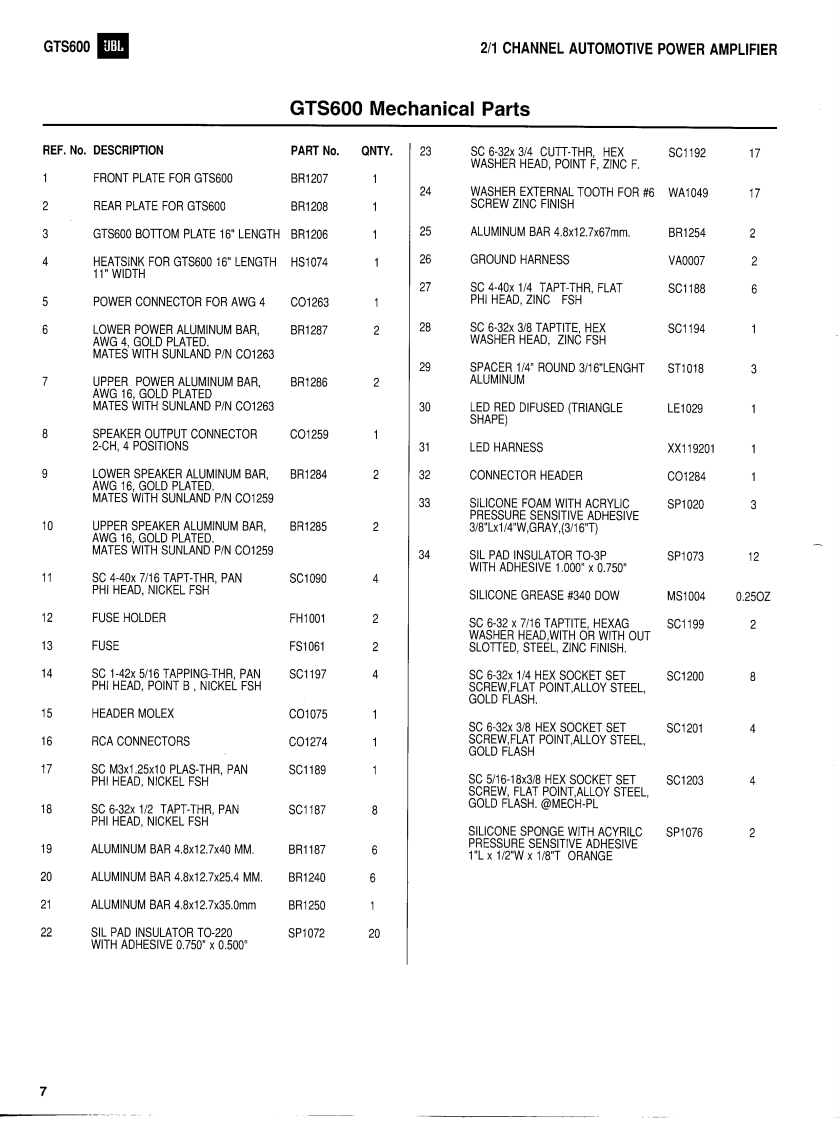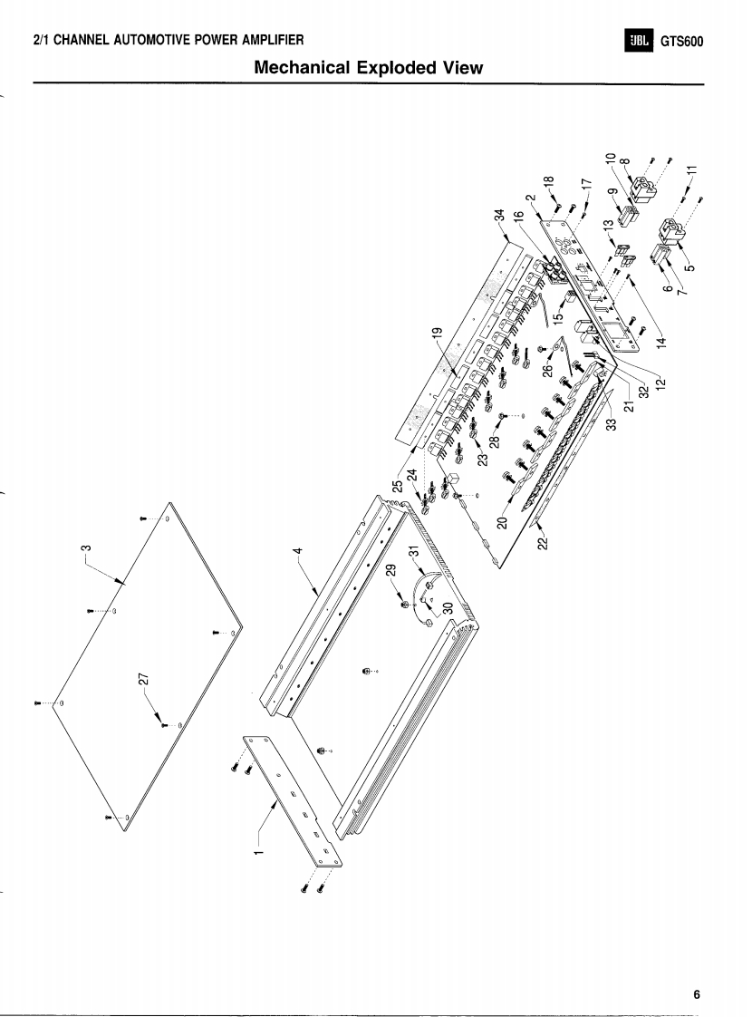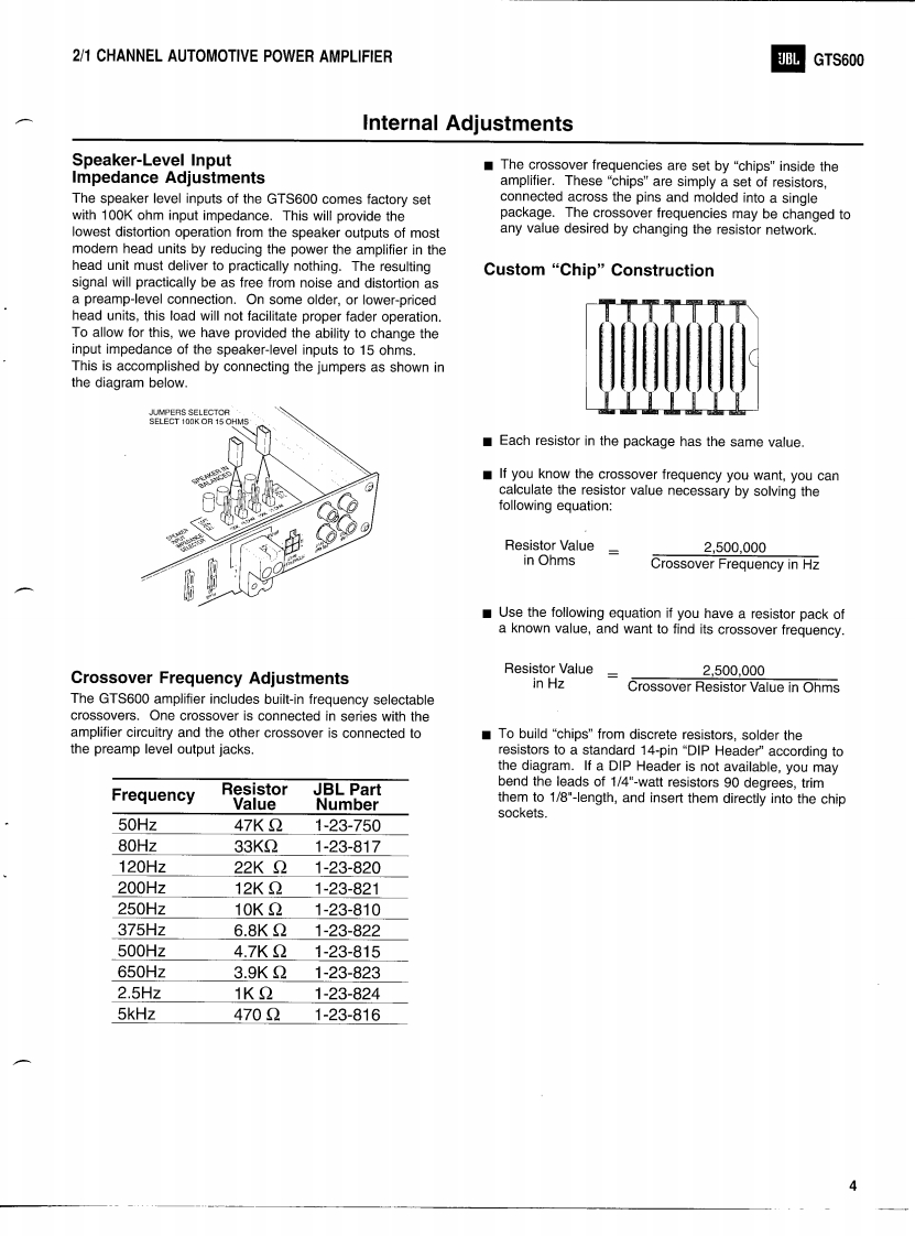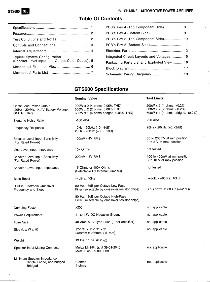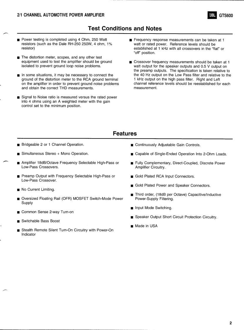 GTS600JBL2/1 CHANNEL AUTOMOTIVEPOWER AMPLIFIERTECHNICAL MANUALGTS600JBLMADE IN THEUSAPOWER☒JBL Consumer Products Inc.80 Crossways Park WestWoodbury,N.Y.117971-800-336-4JBL in the USAH A Harman International CompanyPart No.:GTS600SM Rev A