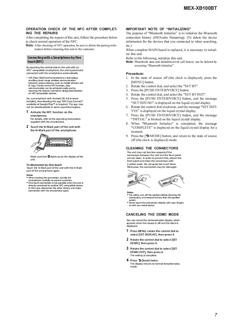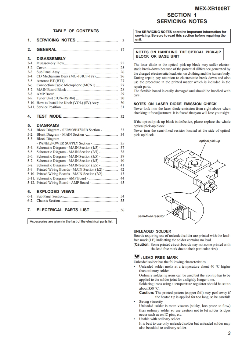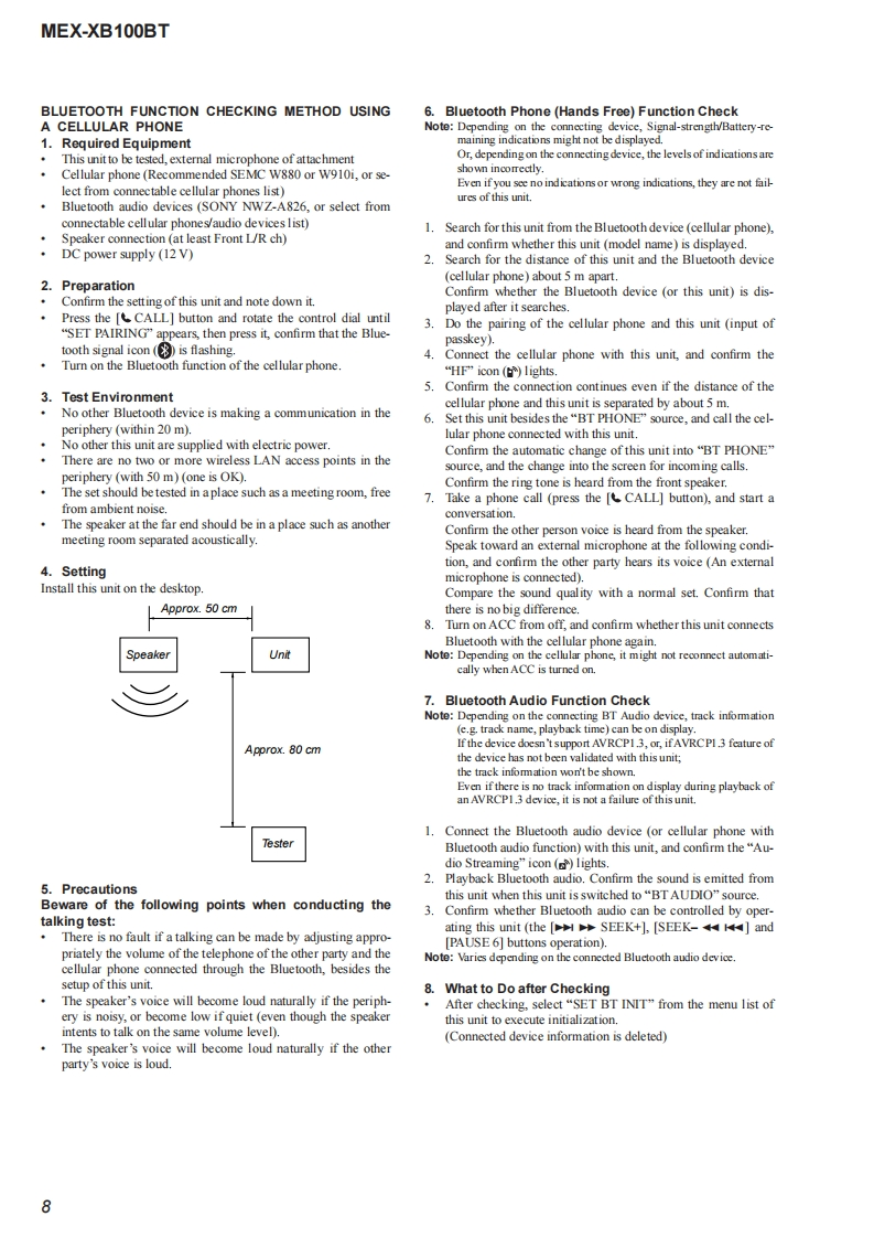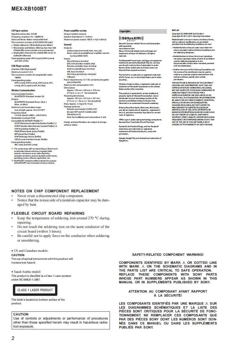 MEX-XB100BTSERVICE MANUALUS ModelCanadian ModelVer.1.02015.01AEP ModelUK ModelEModelAustralian ModelThe service manual of the mechanism deck,used inthis model,has been issued in a separate volume.Please refer to the service manual of the MG-101series for the mechanism deck infommation.The tuner and CD sections have no adjustmentsMEX-N5100BE/N5100BT/Model Name Using Similar MechanismN5150BTMechanism TypeMG-101CF-188Optical Pick-up NameDAX-25ASPECIFICATIONS(US and Canadian models only)(AEPand UK modds)MW/LW(Saudi Arabia mode)FOR THE CUSTOMERS IN THEUSA NOTTuning angeFMAPPLKCABLEINCANADA,INCLUDING IN THEag7.5-i030MMW81-1E02k收Tuning rangv:87.5-1080MHzPROVINCE OF OUEBEC1状53=279收Aetrea由0 mraPOURLES CLIENTS AUX ETATSUNIS NONAwna白er白0 terminalExarnl artonna(aral)connecoeFMCOR-19565-487.3FM工R+0000+2054k收AUDIO POWER SPECIFICATIONSUsbl sordivitt8df(E and Austra lian modds)CA006S647Sdectivty万es第400H5 ignl-o-noisraic7乃ds50875-10DMe年50生eSepar arioee 50 dBatl kzFrequncy Nsporse 20-15000 Hz875-180Me100ke0875-109WH在200ke室531-02eHuner sectionM(US and Canadian mod ds)50 kHz/00 kHz/200 kHz swinchableExor nol art orna (avil)coenecoe5sw靠r26山e5-19MExmalanma白aial)connecoS0 oisvite MW:26Y,LW0出FM正R9565887Bkt4500D0+20954Hz520-7725FCO15t(Russian modenUsablo semdisvite&Ef52:400-8,135keSdloctivty万3重40eHz@ege1410-ti575a4+50003+2P954ktSignaloncise mio:乃dE金w盒r&dFMVFM287.5-1080MHzSapar aione 50 dB at 1tzedMr75Bat400kH比B65.0e30wpFreguncy Nsporde 20-15000 HzAM2,463807万e时+17006+2484H任qncy 20-15000 Hz5引-15k收9zw同Serstity:26wAM530-170tm0t0Tuning range 530-1,710kHzFM COR-19565to-487.3Aawm白s时tornin:FC乐56037Ha460+76620-000 H2Continued on next page-Bluetooth'AUDIO SYSTEM9-896-121-012015A33-1Sony Corporation©2015.01SONYPublished by Sony Techno Create Corporation