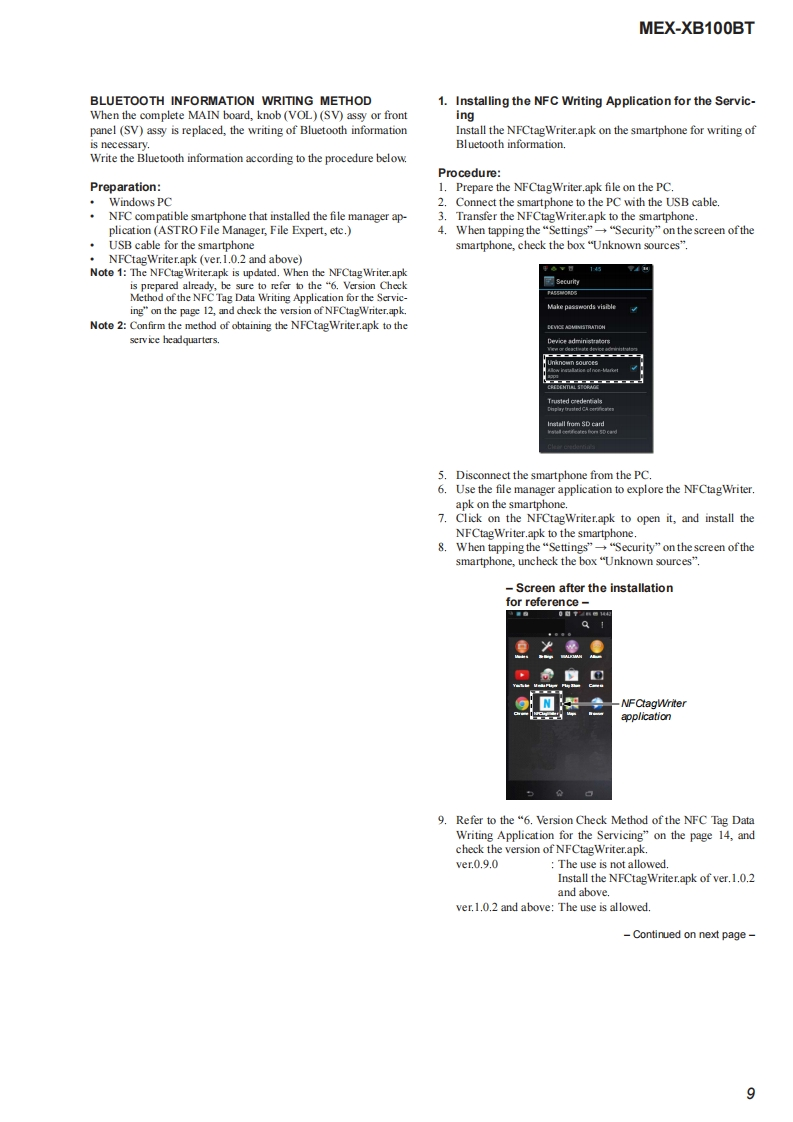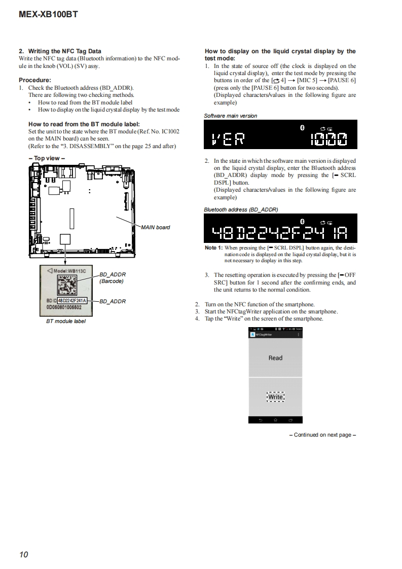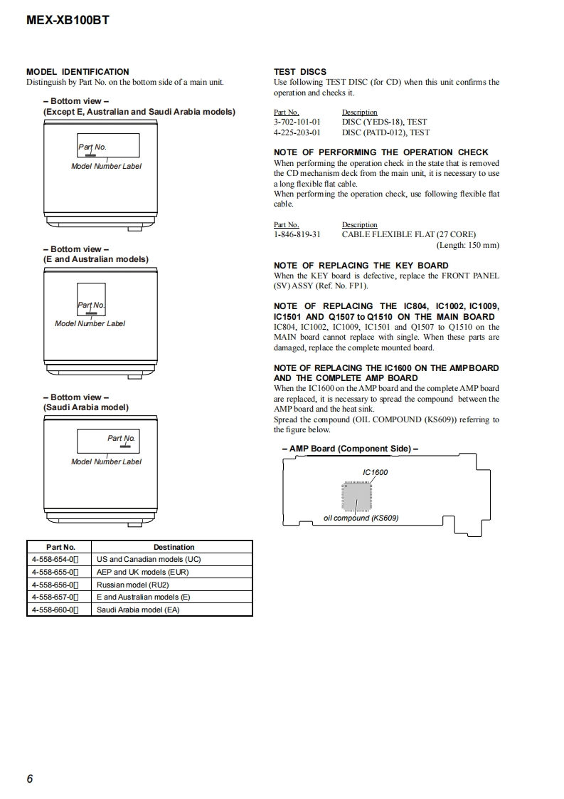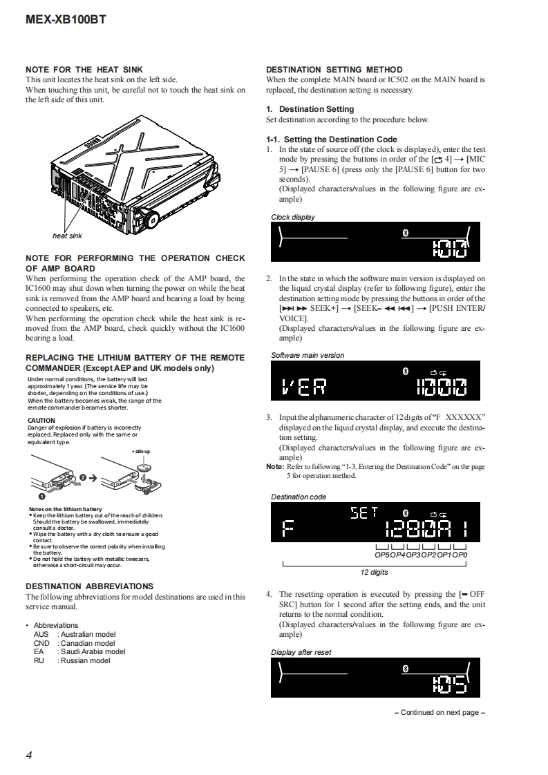 MEX-XB100BTSERVICE MANUALUS ModelCanadian ModelVer.1.02015.01AEP ModelUK ModelEModelAustralian ModelThe service manual of the mechanism deck,used inthis model,has been issued in a separate volume.Please refer to the service manual of the MG-101series for the mechanism deck infommation.The tuner and CD sections have no adjustmentsMEX-N5100BE/N5100BT/Model Name Using Similar MechanismN5150BTMechanism TypeMG-101CF-188Optical Pick-up NameDAX-25ASPECIFICATIONS(US and Canadian models only)(AEPand UK modds)MW/LW(Saudi Arabia mode)FOR THE CUSTOMERS IN THEUSA NOTTuning angeFMAPPLKCABLEINCANADA,INCLUDING IN THEag7.5-i030MMW81-1E02k收Tuning rangv:87.5-1080MHzPROVINCE OF OUEBEC1状53=279收Aetrea由0 mraPOURLES CLIENTS AUX ETATSUNIS NONAwna白er白0 terminalExarnl artonna(aral)connecoeFMCOR-19565-487.3FM工R+0000+2054k收AUDIO POWER SPECIFICATIONSUsbl sordivitt8df(E and Austra lian modds)CA006S647Sdectivty万es第400H5 ignl-o-noisraic7乃ds50875-10DMe年50生eSepar arioee 50 dBatl kzFrequncy Nsporse 20-15000 Hz875-180Me100ke0875-109WH在200ke室531-02eHuner sectionM(US and Canadian mod ds)50 kHz/00 kHz/200 kHz swinchableExor nol art orna (avil)coenecoe5sw靠r26山e5-19MExmalanma白aial)connecoS0 oisvite MW:26Y,LW0出FM正R9565887Bkt4500D0+20954Hz520-7725FCO15t(Russian modenUsablo semdisvite&Ef52:400-8,135keSdloctivty万3重40eHz@ege1410-ti575a4+50003+2P954ktSignaloncise mio:乃dE金w盒r&dFMVFM287.5-1080MHzSapar aione 50 dB at 1tzedMr75Bat400kH比B65.0e30wpFreguncy Nsporde 20-15000 HzAM2,463807万e时+17006+2484H任qncy 20-15000 Hz5引-15k收9zw同Serstity:26wAM530-170tm0t0Tuning range 530-1,710kHzFM COR-19565to-487.3Aawm白s时tornin:FC乐56037Ha460+76620-000 H2Continued on next page-Bluetooth'AUDIO SYSTEM9-896-121-012015A33-1Sony Corporation©2015.01SONYPublished by Sony Techno Create Corporation