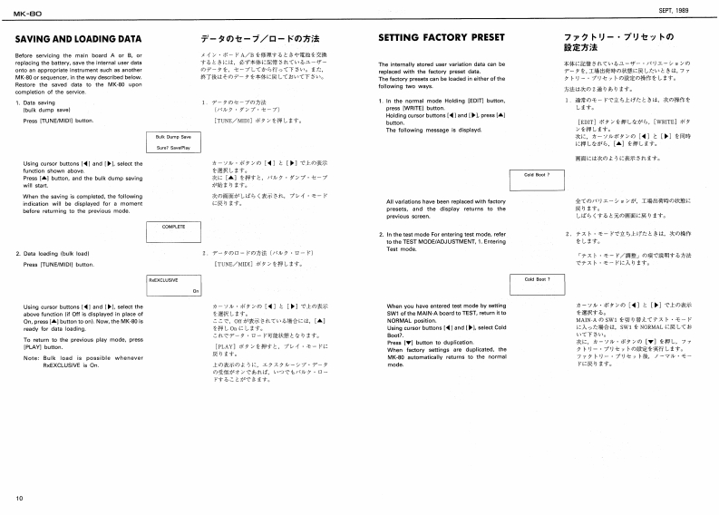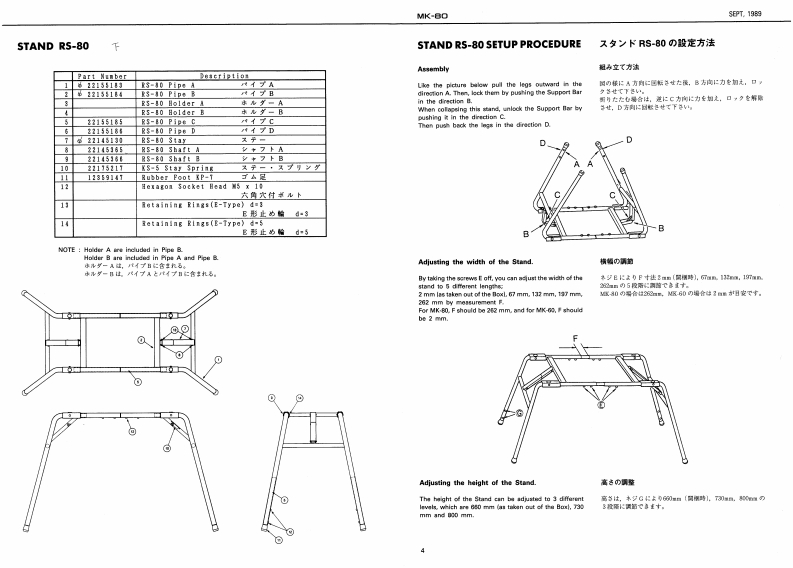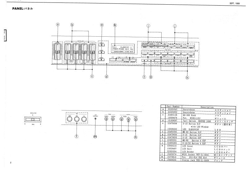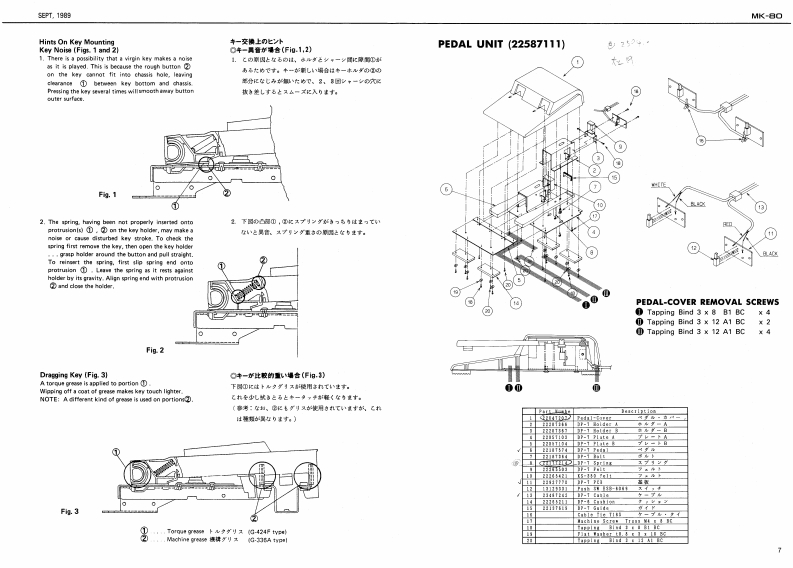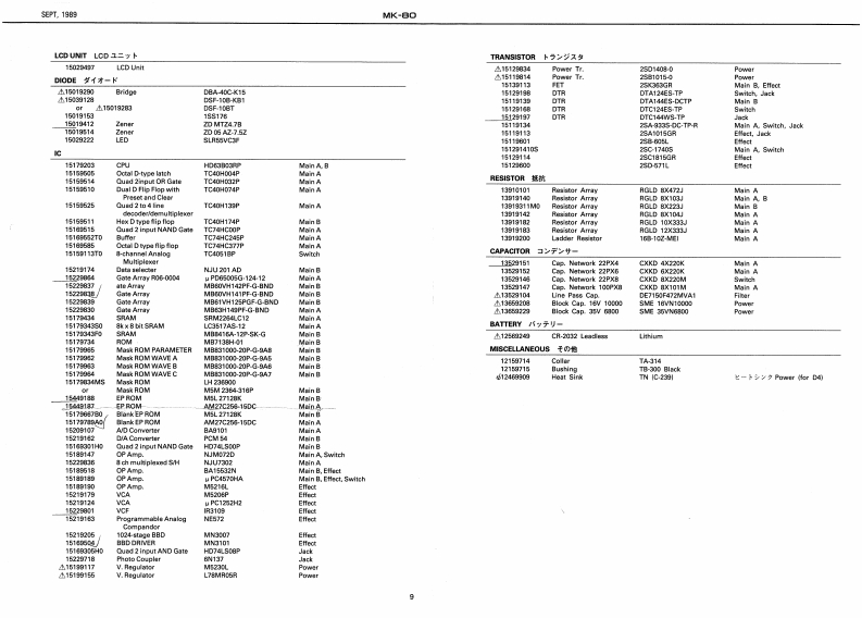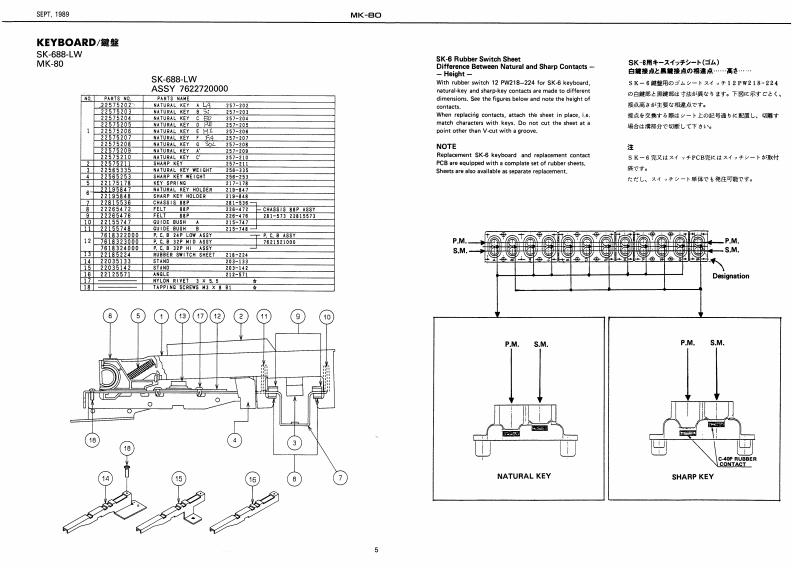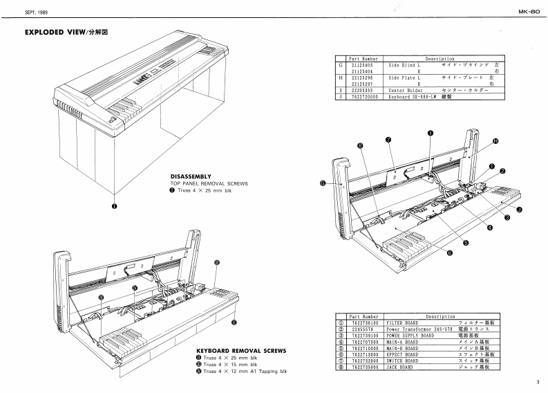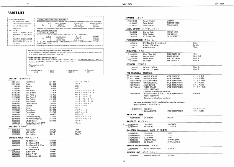 5E2T,1959MK-日ORhodesSERVICE NOTESmK-8First EditionDIGITAL PIANOTABLE OF CONTENTS目次PageSPECIFICATIONSPANEL1来儿2EXPLODED VEW分解国3网Kew40 C Ipian时euhlSound Source85hP00%STAND RS-8O入夕之K5-8016 ma:CLASSC.SPECWL BLEND.APWNO 1.KEYBOARD提整5-7AMANO 2 VRRAPHONEPEDAL UNIT风分儿·工二y7MemoryVarlatiaraPARTS UST64 typos1-y)又8,9n typesSAVING AND LOADING DATA子一夕功也一ブ·口一0方法10Programmable Tones56 twpSETTING FACTORY PRESET7学夕卜V一·了少起7卜0收定方法10Display18 chataclers x 2 linea LED wifh back-lphtDutput Level-0.8 dem (ottisg:powir os bunic asttinga.TEST MODE/ADJUSTMENT于x卜毛一长/两整11-18sider corellers:mir woluma:maxBLOCK DIAGRAM口y9岁不罗y与4178ev%0m.00t7月MAIN-A BOARD天A基医1819PadalDampar DN的qFFVMAIN-日BOARDB墓板20,21w103.117.0w228.2POWER SUPPLY BOARD草添基板22D0051370M夏5404Dx152HmmFILTER BOARD7儿岁一基板2268151WM×21-1ac4HnhsWeighe.45g7得电3gSMALL BOARD入毛一基板Ownar's ManelJ加pnn0655价2Co3gg9EFFECT BOARD工7工夕卜基板23-25Englah 0035126c35760JACK BOARD衫+y夕基板28.27Pedal Unit2258111)SWITCH BOARD天《y子基板26,27234511TROUBLESHOOTING LOGIC TREEk?可是少ュ-学15·方下2117V13439682F05K-688 PCB5×-683琴板G1343618F0024V-6IC DATA生45110C-多3013M414F0BxandH5-●Part Kusber0*:tipti0n22215652℃来水22215e51Front Panel习后卡·专本21145311Blind口板3上D211361Botton医板7.心0E21125405Side Fanel L21125405212T5329BENDER PB-A0106RolandPrinted in Japan4-2c形