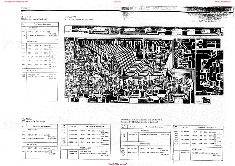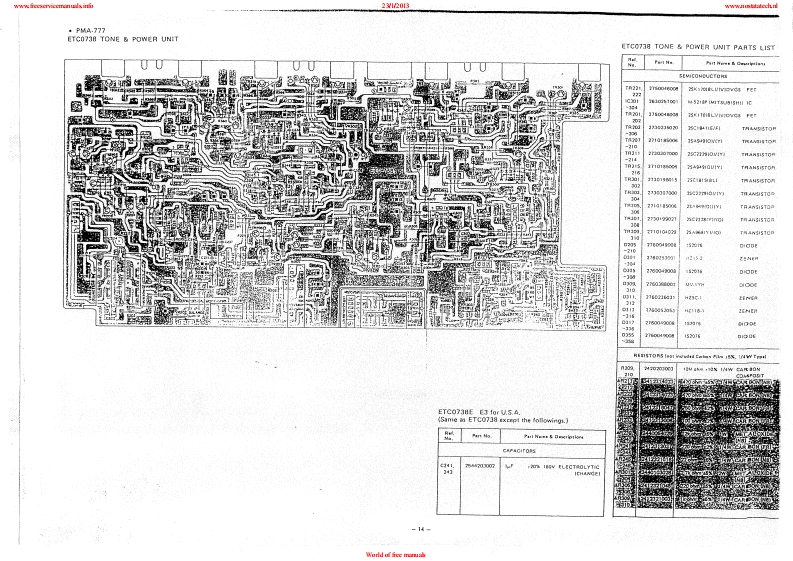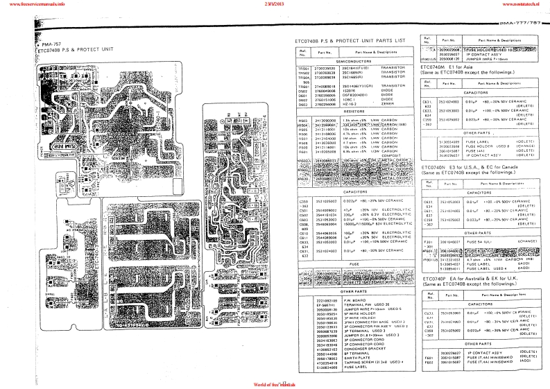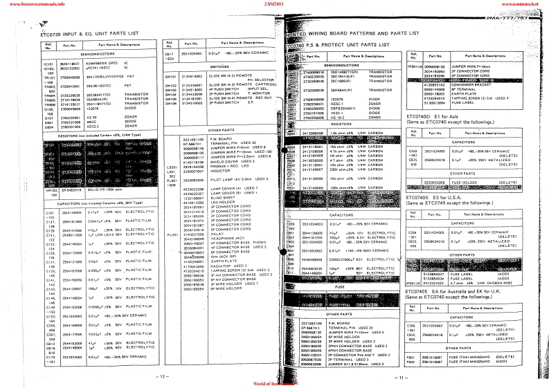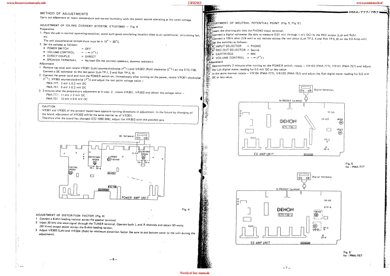 www.freeservicemanuals:info23/12013www.nostatatech.nlDENONHi-Fi Pre-Main AmplifierSERVICE MANUALMODEL PMA-777/757SOLID STATEPRE MAIN AMPLIFIERPMA-777U.5.A.Version OnlyPMA-757Asia Version OnlyCONTENTSSPECIFICATIONS2CONTROLS AND FUNCTIONS...,,,,,·,,,,,,.,,,,,······,,·,·CONNECTIONS.·METHOD OF ADJUSTMENT........................................................6BLOCK OIAGRAM .............................SEMICONDUCTORSPRINTED WIRING BOARD PATTERNS AND PARTS LISTP.S PROTECT UNIT ETC-0740,0740B10-11.17INPUT EQ.UNIT ETC-0739,0739B……12-13.18-19TONE POWER UNIT ETC-0738,0738B,..1415,20-21CONNECTION DIAGRAM ....................16,22WIRING OIAGRAM.,.........……23,25EXPLODED VIEW OF CHASSIS AND CABINET……24,26NIPPON COLUMBIA CO.,LTDWorld of free manuals