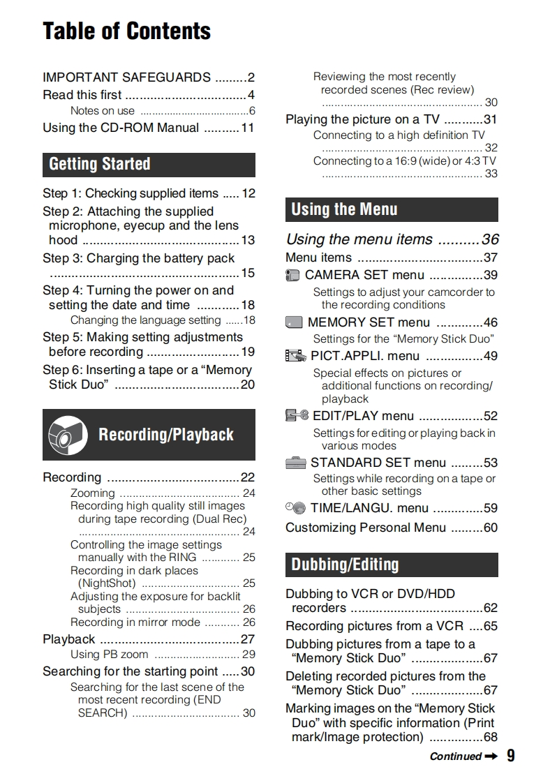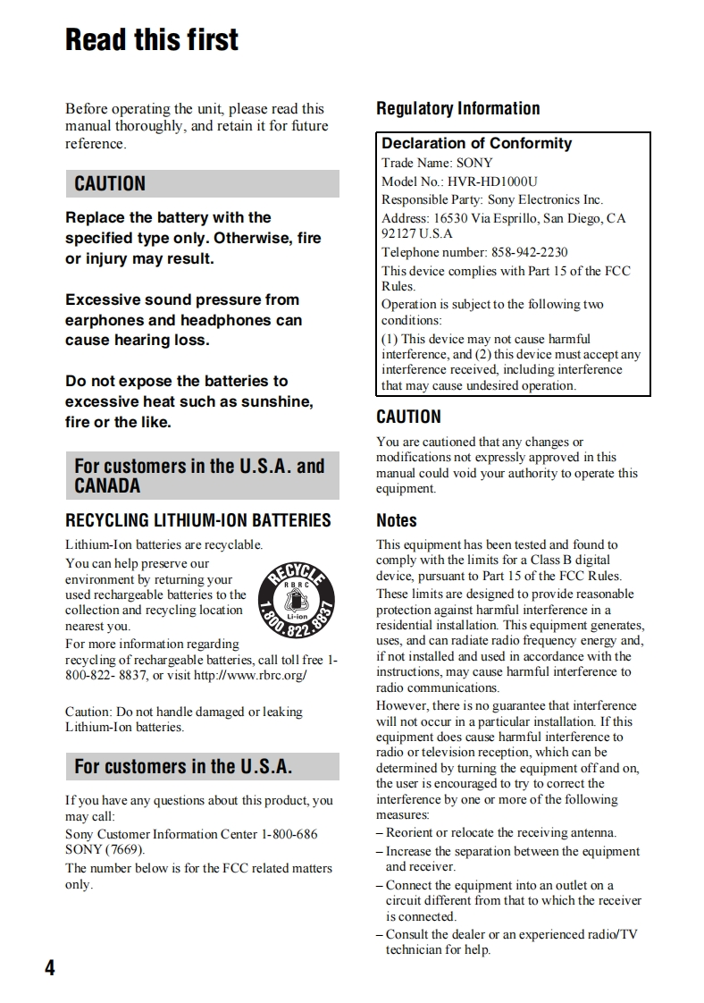 SONY3-278-988-12(1)Digital HD VideoCamera RecorderOperating GuideBefore operating the unit,please read this manual thoroughly,and retain it for future referenceThe supplied CD-ROM includes Operating Guide for the HVR-HD1000 series.(English,French,German,Italian,Spanish,and Simplified Chinese versions).For more details,see"Using the CD-ROM Manual"on page 11.Le CD-ROM fourni contient le mode d'emploi de la serie HVR-HD1000(en anglais,francais,allemand,italien,espagnol et chinois simplifie).Pour de plus amples renseignements,consultez la section Using the CD-ROMManual a la page 11.HDVMiniDigital①InfoLITHIUMCassetteH▣nIMEMORY STICK TMHDV 1080iSERIESHVR-HD1000U/HD1000N2007 Sony Corporation