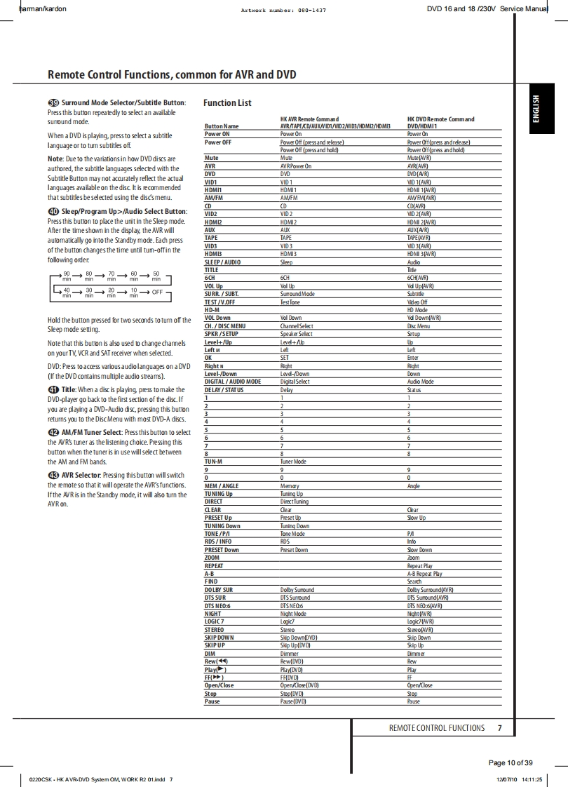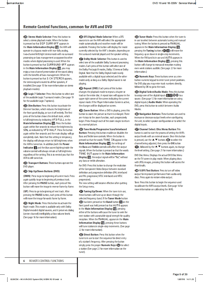 harman/kardonDVD 16 and 18/230V Service Manualharman/kardonService ManualDVD16/230DVD18/230DVD playersOnly sold with AVR 139 and AVR 141 as AVR/DVD combos 13916,13918,14116,14118..CONTENTSESD PRECAUTIONS2TROUBLESHOOTING GUIDE16SERVICING PRECAUTIONSTECHNICAL SPECIFICATIONS17OWNER'S MANUAL FRONT PAGE 5SOFTWARE CHECK UPGRADE 18OM TABLE OF CONTENTS6TROUBLESHOOTING CHARTS19REMOTE CONTROL FUNCTIONS 7EXPLODED VIEW24AVR/DVD SYSTEM CONNECTIONS 11DVD 16 SERVICE PARTS25FEATURES12DVD 18 SERVICE PARTS6FRONT PANEL CONTROLS13PCB DRAWNGS27REAR PANEL CONNECTIONS14WRING DIAGRAM31SETUP AND CONNECTIONS15SCHEMATIC DIAGRAMS32-39Released EU2010Harman Consumer Group,Inc.Rev0,09/20108500 Balboa Boulevard.Northridge,California 91329Page 1 of 39