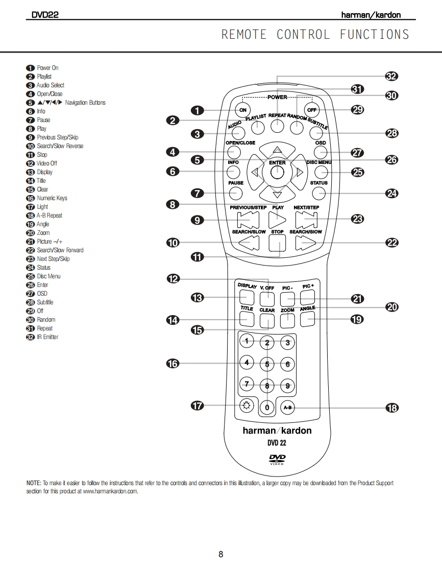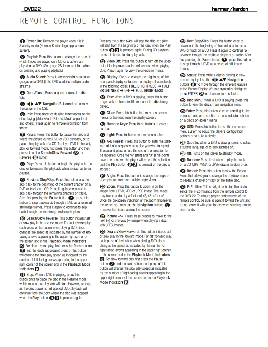 harman kardonModel DVD 22DVD/CD/CD-R/CD-RW/VCD MP3 PlayerService Manual0v022西闲隔·un当1:5片:4harman/kardonContents-SERVICE PRECAUTIONS..................BULLETIN HK2004-03.......18SPECIFICATIONS...5.BULLETIN HK2005-02.........................20FRONT PANEL CONTROLS..................6TECH TIP HKTT2005-01..21INFORMATION DISPLAY......................7ELECTRICAL PARTS LIST.......................22REMOTE CONTROL....................8MECHANICAL PARTS LIST............29REAR PANEL CONNECTIONS.............10SEMICONDUCTOR PINOUTS..........31INSTALLATION/CONNECTIONS.....1PCB DRAWINGS..38BASIC TROUBLESHOOTING GUIDE.............15SYSTEM CONFIGURATION SPECS.............47RESET INSTRUCTIONS....................15SCHEMATICS......48EXPLODED VIEW/PARTS LIST...................16PACKAGE............61BLOCK DIAGRAM..........17harman/kardon,Inc.250 Crossways Park Dr.Woodbury,New York 11797Rev45/2005