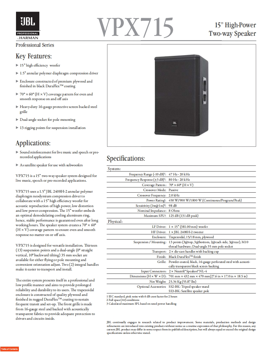 JBL_VPX715_ServiceManual维修手册电器原理图找手册网3天前发布关注私信1.65MB16页051JBL_VPX715_ServiceManual维修手册电器原理图此内容为付费资源,请付费后查看¥19¥21黄金会员免费钻石会员免费立即购买您当前未登录!建议登陆后购买,可保存购买订单付费资源 第1页 / 共16页 第2页 / 共16页 第3页 / 共16页 第4页 / 共16页 第5页 / 共16页 第6页 / 共16页 第7页 / 共16页 第8页 / 共16页 第9页 / 共16页 第10页 / 共16页 试读已结束,还剩6页,您可下载完整版后进行离线阅读 THE ENDJbl/Onkyo 文本预览 JBL®PROFESSIONALDHARMANService ManualVPX71515"High-Power Two-Way SpeakerHARMANA SAMSUNG COMPANY 查看更多 收起部分 喜欢就支持一下吧收藏