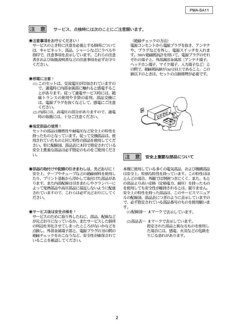 DENONFor Japan modelSERVICE MANUALVer.1MODEL PMA-SA11INTEGRATED AMPLIFIER注意少一上又在苏乙存前忙、乙)片一七又又二1了儿卷必式书読〈龙过。本機志、火災、感電、付存(仁对寸石安全性老確保寸石左忙、志求芒求存配虚态茄乙本一(茄、丰无法的忙体「電氨用品安全法」无花上一老、所定)許可在得(製造志九(方)东。従(片一上又在右乙存ラ際!体、乙九5)安全性雜持志九石今、乙)圹一上又マ二ュ了記载志九(八石注意事項在必式守)〈龙达。For purposes of improvement,specifications and●本機)仕横性能改良)龙协、予告在〈变更寸石乙上design are subject to change without notice.你杨)素寸。●補修用性能部品)保有期間、製造打切後8年C寸。Please use this service manual with referring to●修理)際、必寸取极脱明苦左参照上、作業左行the operating instructions without fail.〈龙达。O Some illustrations using in this service manual are●本文中使用L(石亻与又卜体、脱明)都合上現物slightly different from the actual set.七多少異在局場合苏齿)ま寸。DENON,Ltd.TOKYO,JAPANS-1144V.01 DE/CDM0407