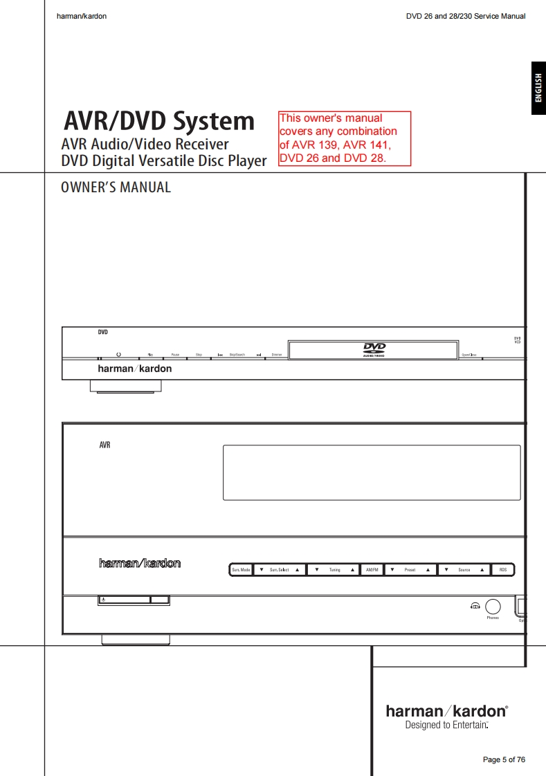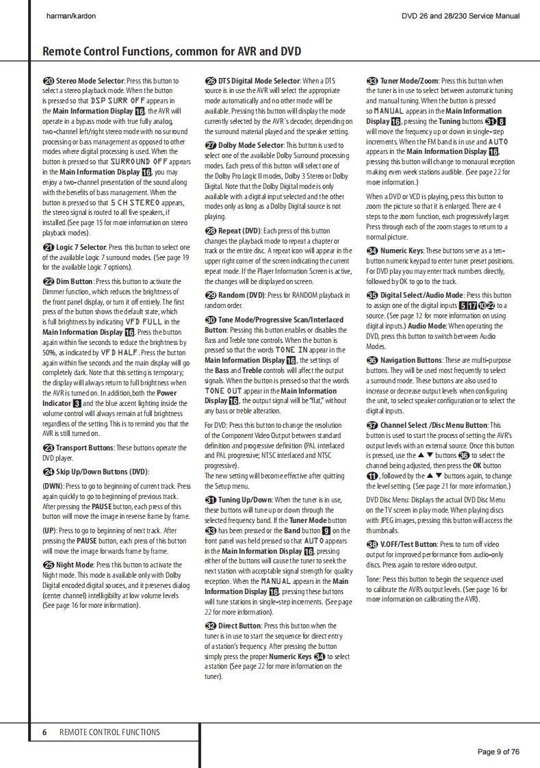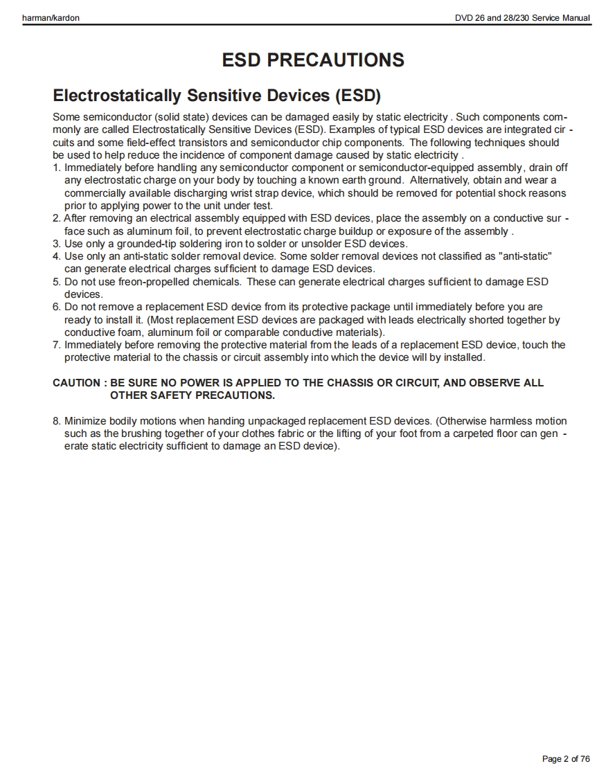 harman/kardonDVD 26 and 28/230 Service Manualharman/kardonService ManualDVD26/230DVD28/230DVD players (technically identical to DVD 29 and DVD 37)6folharman/kardorCONTENTSESD PRECAUTIONS2BASIC SPECIFICATIONS19SERVICING PRECAUTIONS3PACKAGE LIST AND PARTS24OWNER'S MANUAL FRONT PAGE 5DISASSEMBLY25OM TABLE OF CONTENTS6EXPLODED VIEW26REMOTE CONTROL FUNCTIONS 7ELECTRICAL PARTS LIST27FEATURES11SEMICONDUCTOR PINOUTS46FRONT PANEL CONTROLS12PCB DRAWINGS67FRONT PANEL DISPLAY13BLOCK DIAGRAM71REAR PANEL CONNECTIONS14WIRING DIAGRAM72SETUP AND CONNECTIONS15SCHEMATIC DIAGRAMS73-76TROUBLESHOOTING GUIDE18Released EU2010Harman Consumer Group,IncRev0,09/20108500 Balboa Boulevard.Northridge,California 91329Page 1 of 76