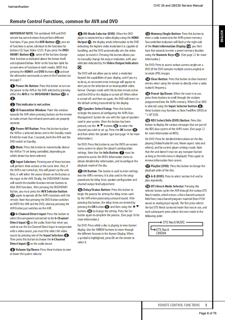 harman/kardonDVD 26 and 28/230 Service Manualharman/kardonService ManualDVD26/230DVD28/230DVD players (technically identical to DVD 29 and DVD 37)6folharman/kardorCONTENTSESD PRECAUTIONS2BASIC SPECIFICATIONS19SERVICING PRECAUTIONS3PACKAGE LIST AND PARTS24OWNER'S MANUAL FRONT PAGE 5DISASSEMBLY25OM TABLE OF CONTENTS6EXPLODED VIEW26REMOTE CONTROL FUNCTIONS 7ELECTRICAL PARTS LIST27FEATURES11SEMICONDUCTOR PINOUTS46FRONT PANEL CONTROLS12PCB DRAWINGS67FRONT PANEL DISPLAY13BLOCK DIAGRAM71REAR PANEL CONNECTIONS14WIRING DIAGRAM72SETUP AND CONNECTIONS15SCHEMATIC DIAGRAMS73-76TROUBLESHOOTING GUIDE18Released EU2010Harman Consumer Group,IncRev0,09/20108500 Balboa Boulevard.Northridge,California 91329Page 1 of 76
