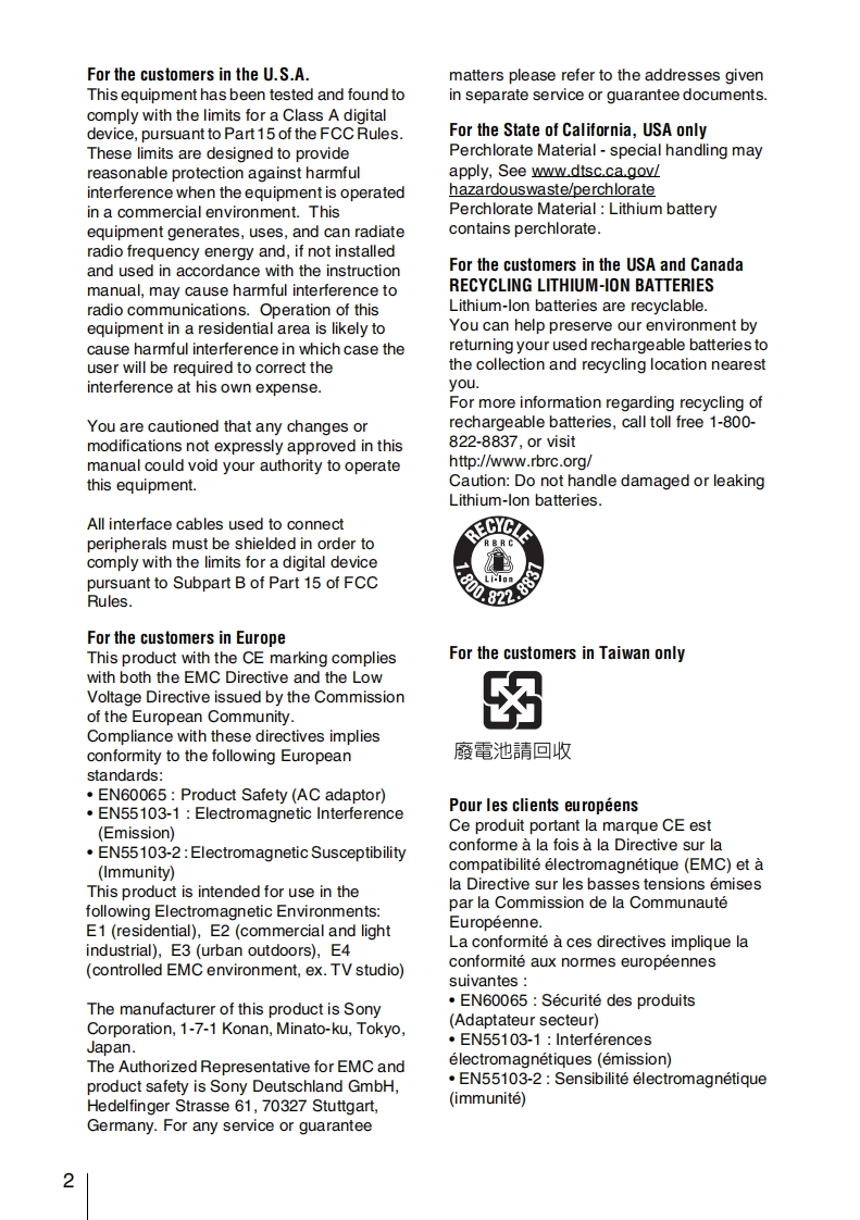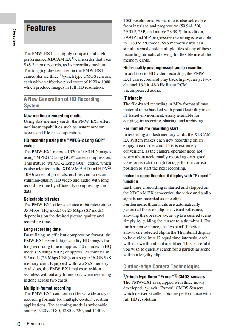 sony_PMW-EX1使用说明书手册找手册网30天前发布关注私信4.57MB135页040sony_PMW-EX1使用说明书手册此内容为付费资源,请付费后查看¥19¥21黄金会员免费钻石会员免费登录购买付费资源 第1页 / 共135页 第2页 / 共135页 第3页 / 共135页 第4页 / 共135页 第5页 / 共135页 第6页 / 共135页 第7页 / 共135页 第8页 / 共135页 第9页 / 共135页 第10页 / 共135页 试读已结束,还剩125页,您可下载完整版后进行离线阅读 THE END索尼 文本预览 SONY3278805124103278905120Solid-State MemoryCamcorderPMW-EX1Operating InstructionsXDOEXSXSPrined on recyded paper.CINEALTExmor.http://www.sony.net/Primod in Japan2007 Sony Corpora tion 查看更多 收起部分 喜欢就支持一下吧收藏