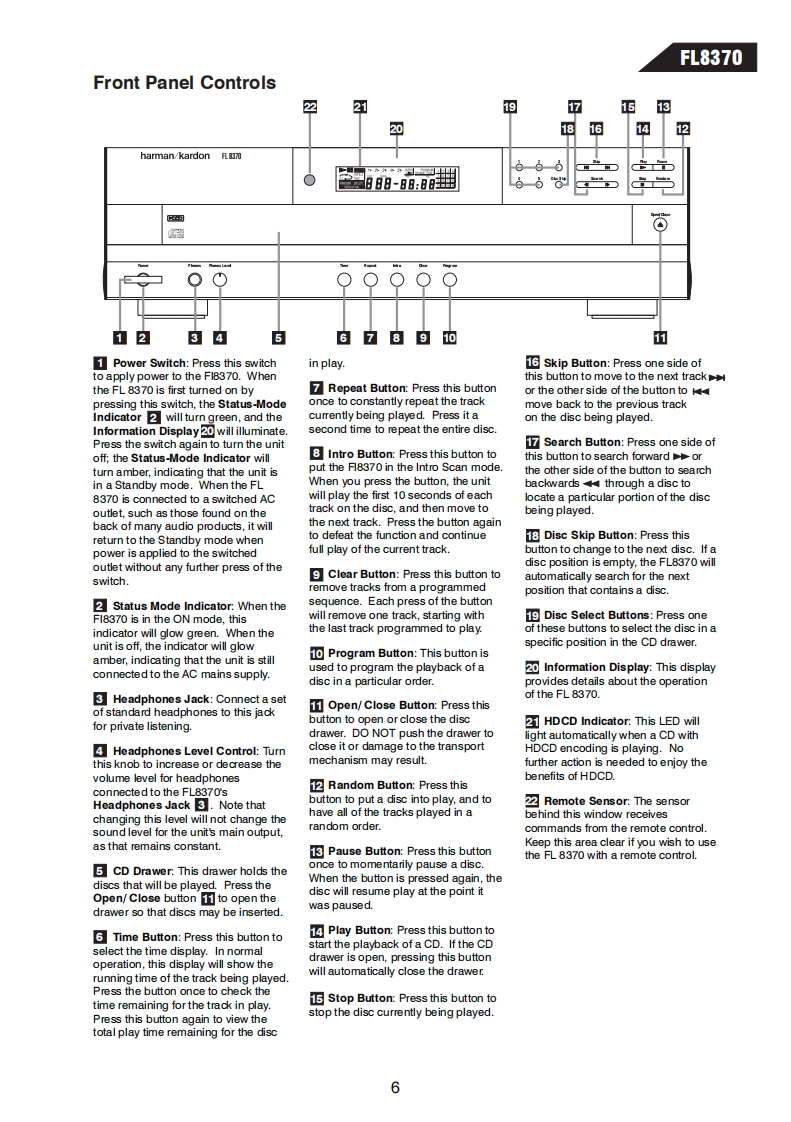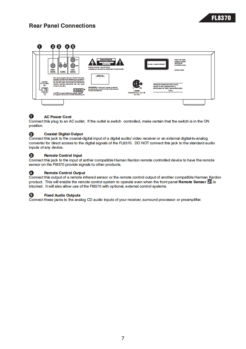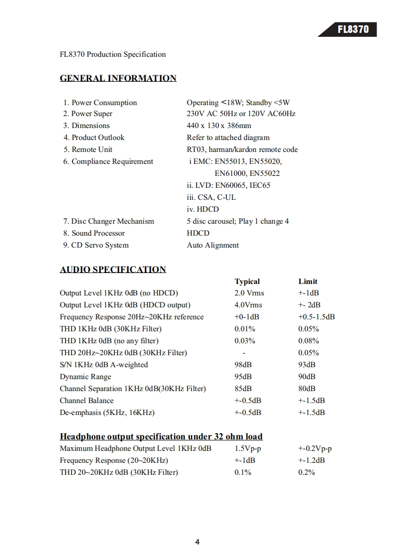 harman/kardonModel FL83705 Disc Compact Disc ChangerSERVICE MANUALharman/kardon F83707开角59攀CONTENTSLASER BEAM SAFETY PRECAUTIONS.........2CIRCUIT DESCRIPTION...................23OTHER PRECAUTIONS......................3BASIC TROUBLESHOOTING..................30SPECIFICATIONS...........4DETAILED TROUBLESHOOTING..............31FRONT PANEL CONTROLS..................6SEMICONDUCTOR IDENTIFICATION............37REAR PANEL CONNECTIONS.......7ELECTRICAL PARTS LIST ....................68REMOTE CONTROL FUNCTIONS..............8MECHANICAL PARTS LIST..................80TEST PROCEDURE.........................9PRINTED CIRCUIT BOARDS.................83BLOCK DIAGRAM........11SCHEMATIC DIAGRAMS......................92DISASSEMBLY PROCEDURE....................12PACKAGE.5GENERAL UNIT EXPLODED VIEW I,Il ........17harman/kardon,Inc.250 Crossways Park Dr.Woodbury,New York 11797Rev011/2000