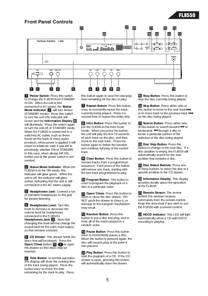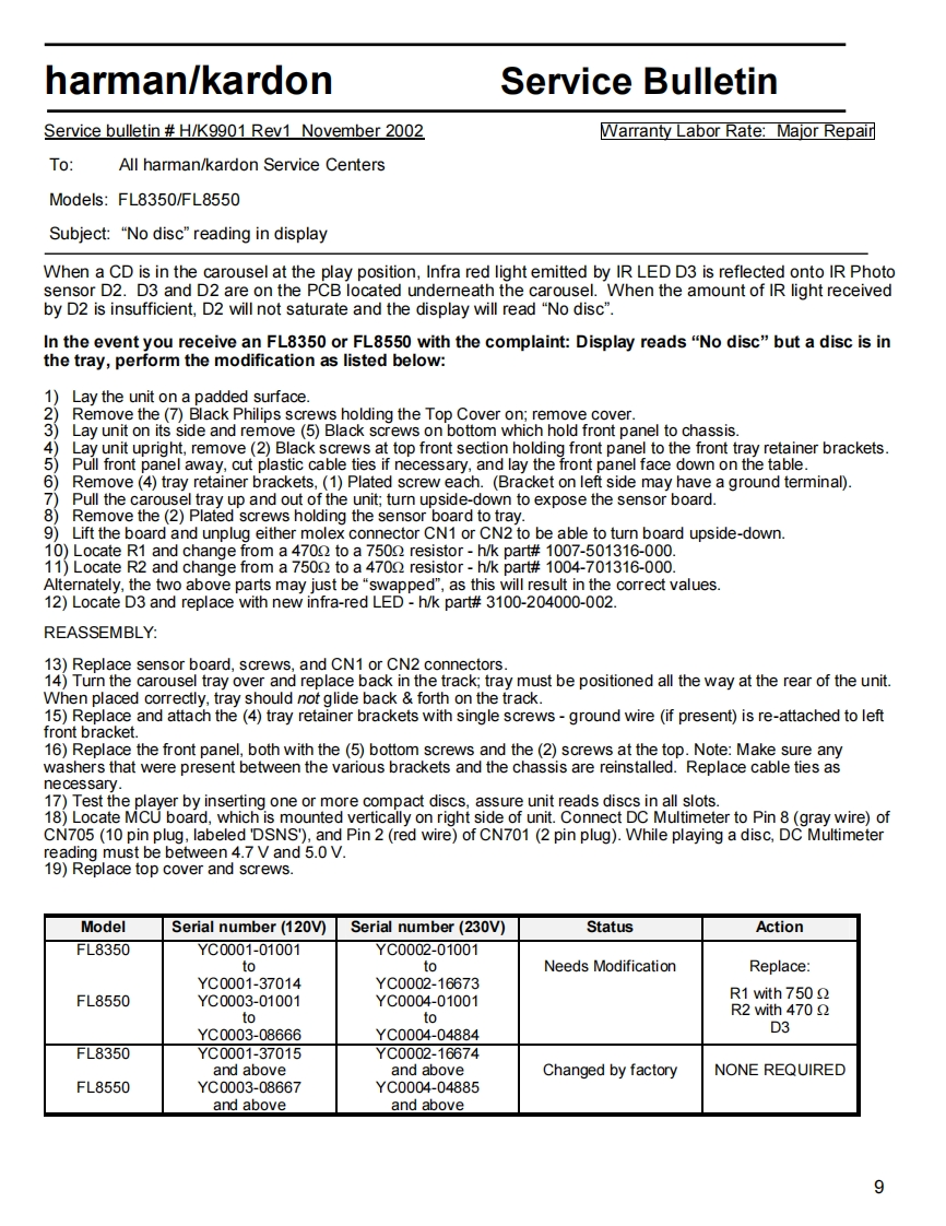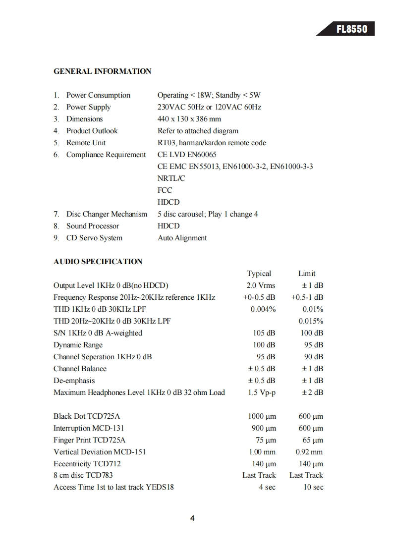 harman/kardonModel FL85505 Disc Compact Disc ChangerService Manualharman/kardon R85503:07务66608CONTENTSLASER BEAM/SAFETY PRECAUTIONS................2ADJUSTMENT PROCEDURES..SPECIFICATIONS.…4AUDIO TEST PROCEDURE......................25CONTROLS......5CIRCUIT DESCRIPTIONS.27REAR PANEL CONNECTIONS.............6I.C.SPECIFICATIONS.........35REMOTE CONTROL...7ELECTRICAL PARTS LIST ..................61TROUBLE SHOOTING GUIDE.......................8MECHANICAL PARTS LIST....................67SERVICE BULLETIN H/K9901......................9TROUBLESHOOTING FLOW CHARTS.......68SERVICE BULLETIN H/K2000-09.10BLOCK DIAGRAM..........................73TECH TIP HKTT2003-06..........11PCB LAYOUTS .........DISASSEMBLY INSTRUCTIONS...................74SCHEMATIC DIAGRAMS............78EXPLODED VIEWS.…17PACKING..83haman/kardon,Inc.250 Crossways Park Dr.Woodbury,New York 11797Rev111/2003
