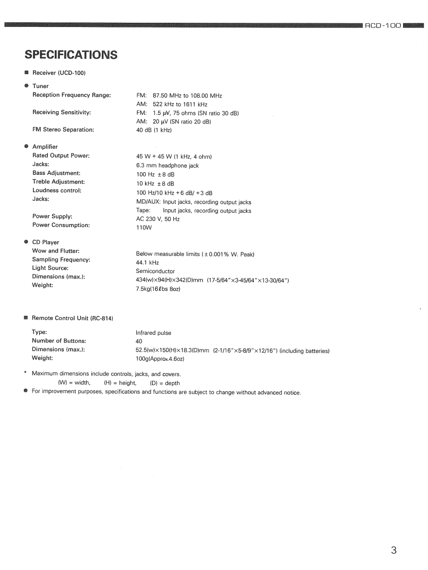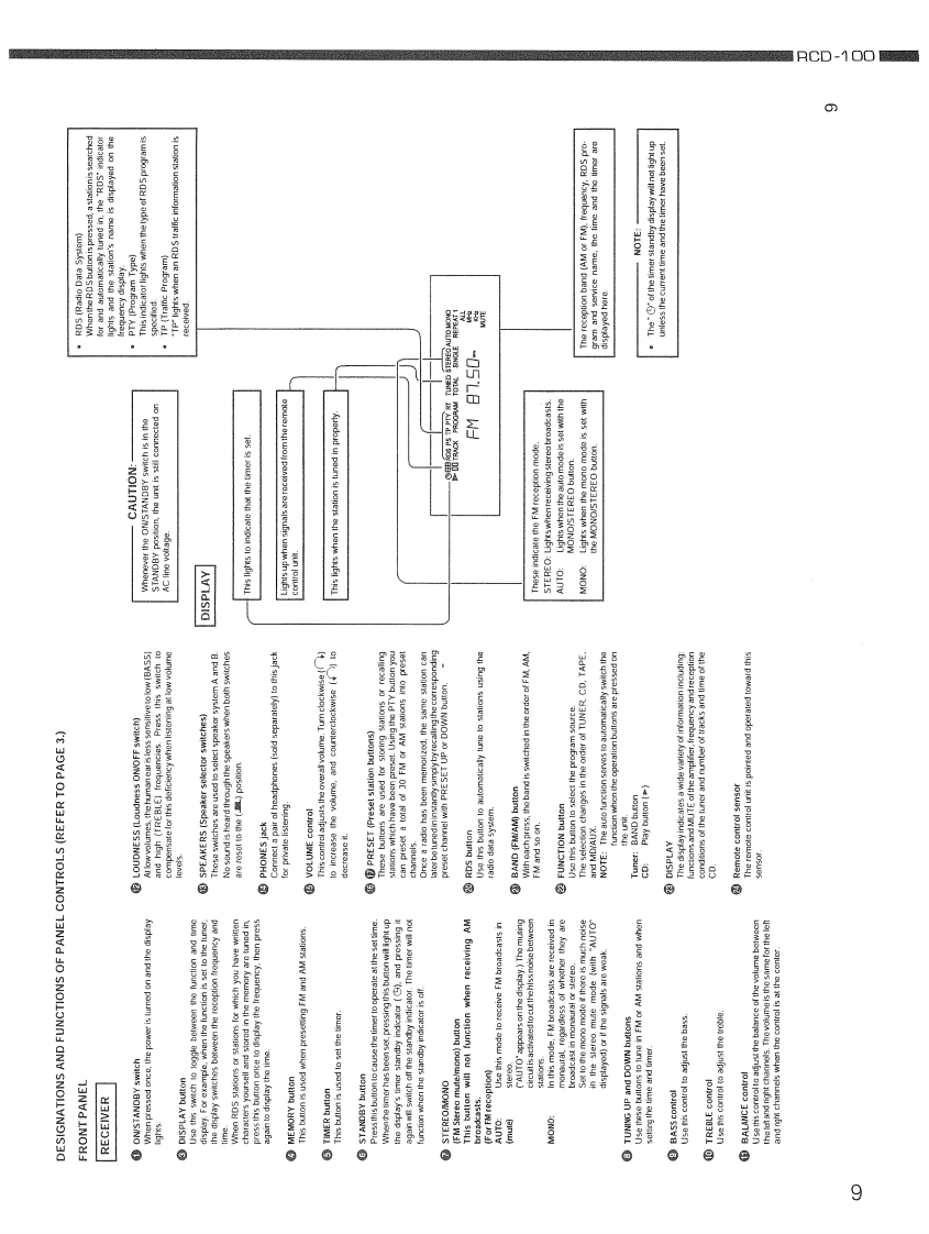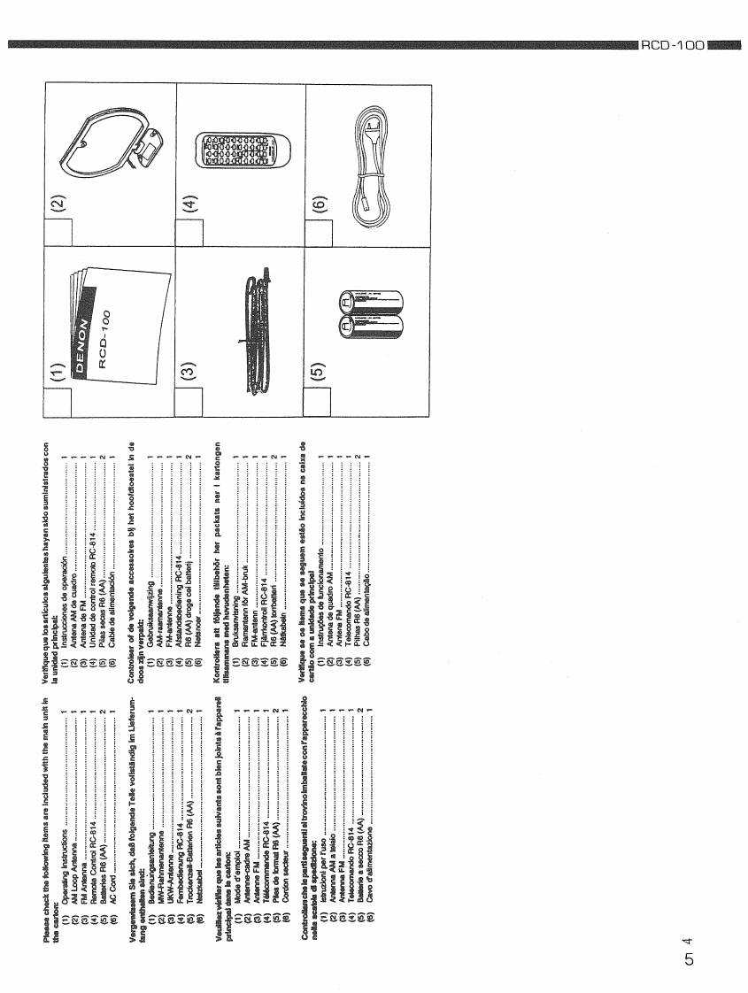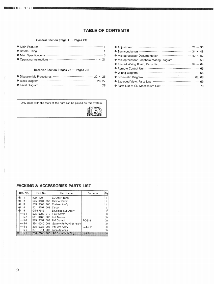 DENONHi-Fi CD AMP Tuner SystemSERVICE MANUALEurope ModelMODEL RCD-100L比CD AMP TUNERS八751S2Note:The illustrations used here may differ slightly from the actual unit.MAIN FEATURESRDS reception (FM only)Super linear converter and high performance digital filterRDS programs can be easily received (FM only).Denon's unique systems for preventing loss of CD sound quality permitAM/FM 30-station random preset tunerexcellent sound field reproductionRandom presetting permits easy operation and will beconvenient for theEasy-to-use remote control unitincreased number of FM stations in the future.Independent power amplifier designed for quality soundHigh quality 45 W per channel power amplifier with large speaker terminalsBEFORE USINGNote the following points before using the RCD-100.Hum may be produced if a TV set or another audio component is set near●Moving the systemthis system or their connection cords are nearby.If this happens,tryTo prevent short-circuiting or damage of the connection cords,be sure tochanging the position of the equipment and connection cords.unplug the power cord and disconnect all connection cords before movingDo not move the system abruptly from a cold place to a warm place,sincethe system.this may cause water droplets (condensation)to form in the equipment,In addition,always remove CDs before moving the system.Failing to do sopreventing proper operation.If this happens,wait one hour before using themay result in scratched CDs.system.Before switching on the powerCheck again that all connections are proper and that the connection cordsare not damaged.Be sure to disconnect the power plug beforedisconnecting or connecting the connection cords.Check that the following parts are included in the package aside from the main unit:1Operating Instructions④Remote Controller②FM Indoor Antenn8⑤R6 P Batteries…2③AML00 Antenn81AC Cord........................................NIPPON COLUMBIA CO.,LTD.