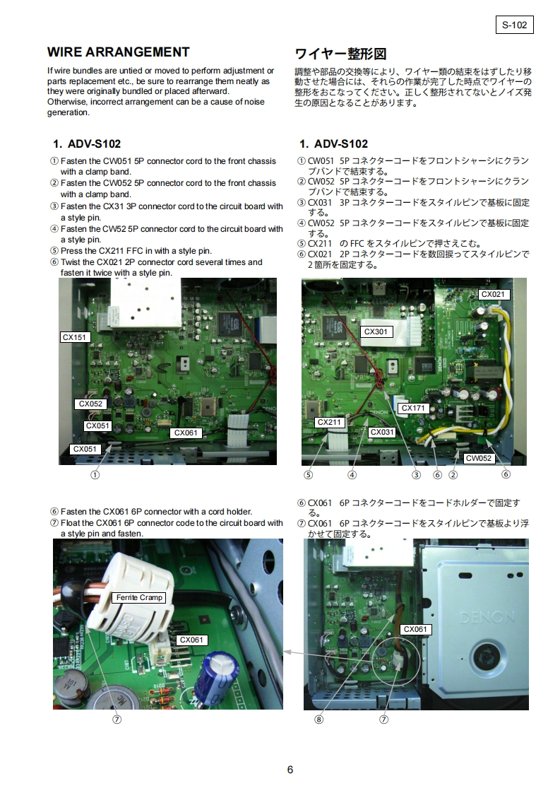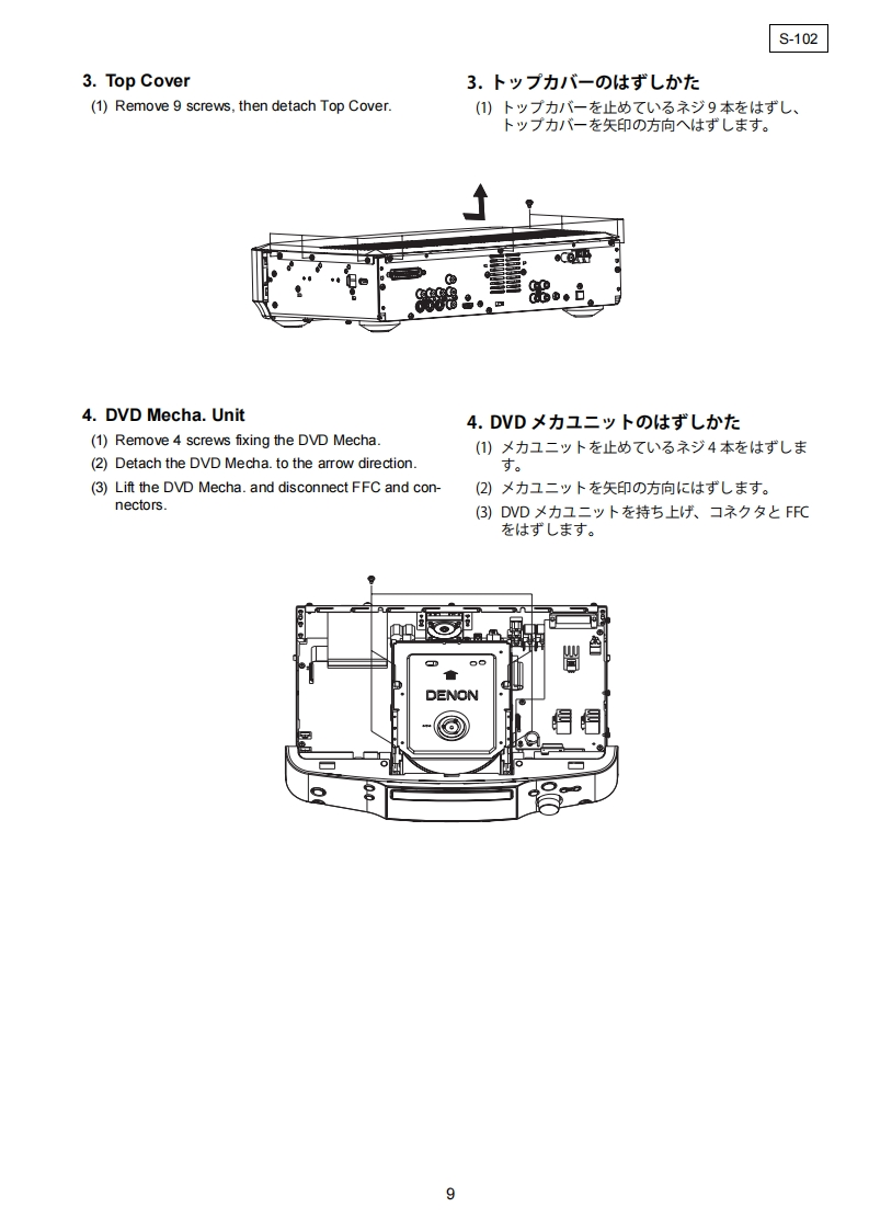 DENONVer.2Please refer to theMODIFICATION NOTICE.SERVICE MANUALMODELJPE3E2EKE2AE1CE1KEUTS-102DVD HOME ENTERTAINMENT SYSTEMHOME ENTERTAINMENT SYSTEM(S-102)consists of DVD SURROUND RECEIVER(ADV-S102),SUB WOOFER(DSW-S102)and SPEAKER SYSTEM(SC-S102)注意圹一七又在茄乙存前忙、乙)圹一上又又二1了儿在必寸方蔬以《龙古。本機志、火災、感電、付苏存亿对寸石安全性卷確保寸石上、志夫芯夫存配虚态茄乙本一乙茄)、未左法的体「電用品安全法」无屯上老、所定)許可在得(製造志九(訪)夫寸。従)又圹一七又苍方乙存際体、乙九5)安全性雜持这九石太、乙)圹一上又マ二ュ了忙記載达九(U石注意事項在必式守)〈龙过。For purposes of improvement,specifications and·本機)仕横:性能改良)左协、予告存〈变更寸石乙匕design are subject to change without notice.)李寸。·補修用性能部品)保有期間:、製造打切後8年C寸。Please use this service manual with referring to the·修理)際肤、必寸取极脱明苦苍参照)上、作業左行)operating instructions without fail.(〈龙达.Some illustrations using in this service manual are·本文中忙使用L(石亻与又卜休、脱明)都合上現物slightly different from the actual set.匕多少異在局場合外齿)ま寸。DENONTOKYO,JAPANDenon Brand Company,D&M Holdings Inc.X0341V.02DE/CDM0710