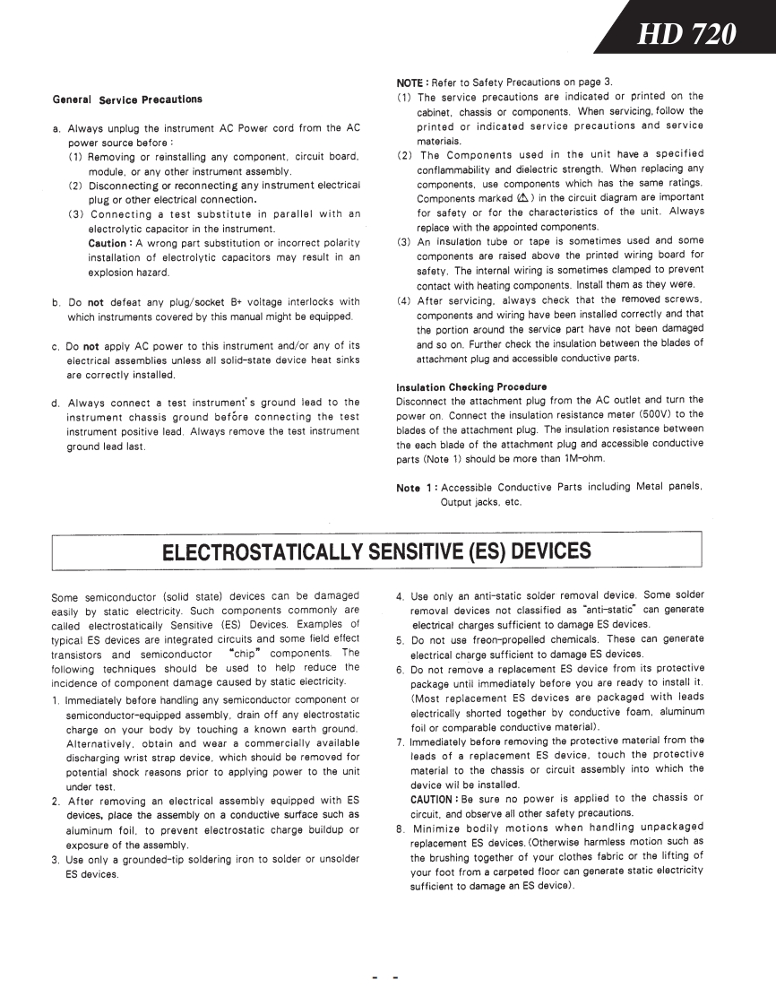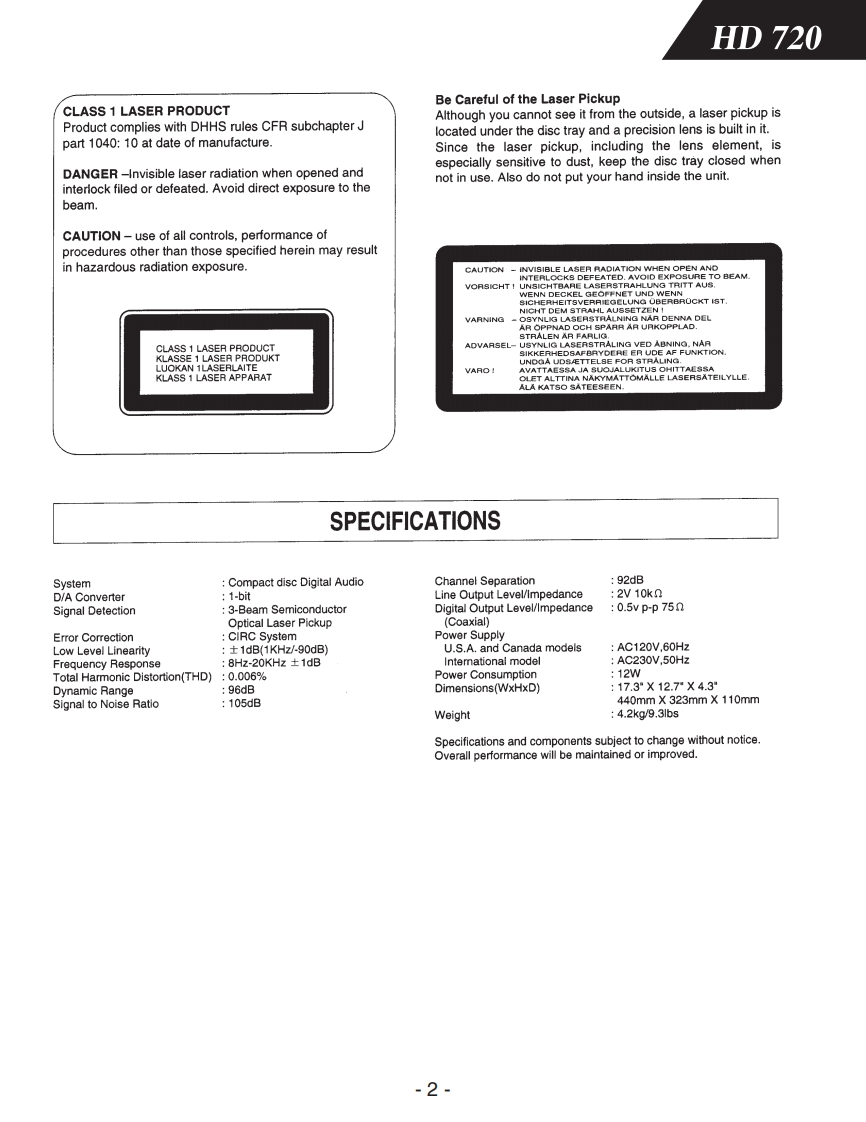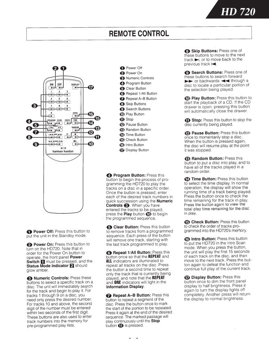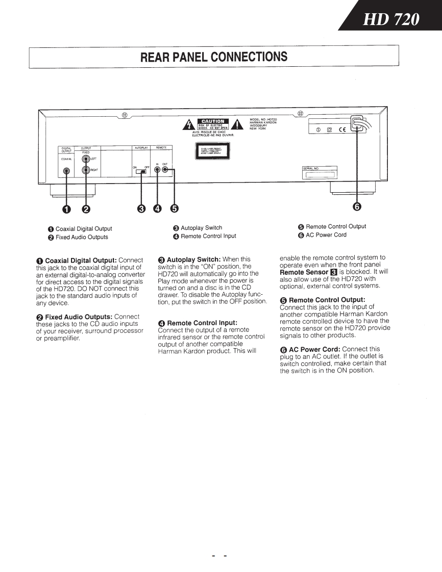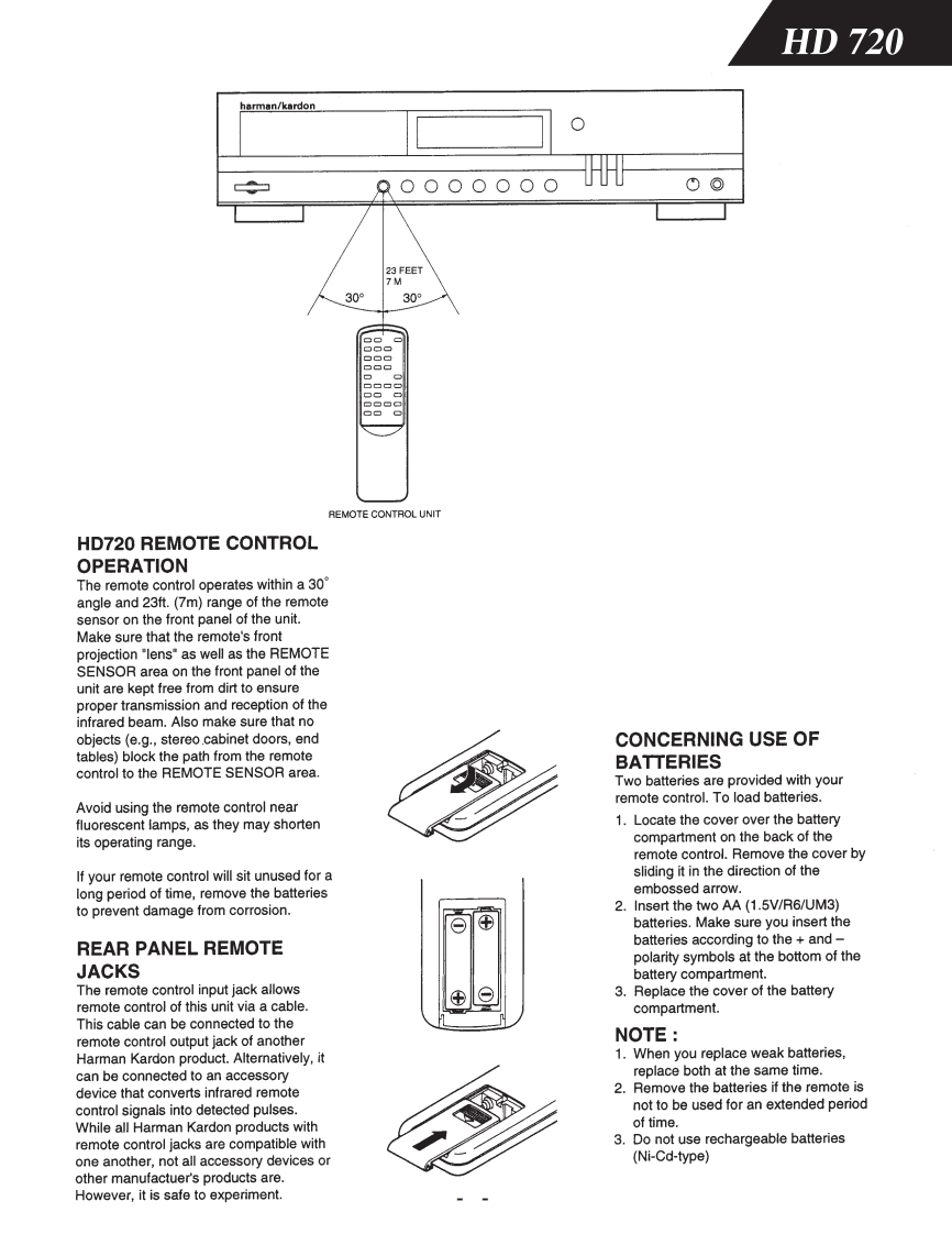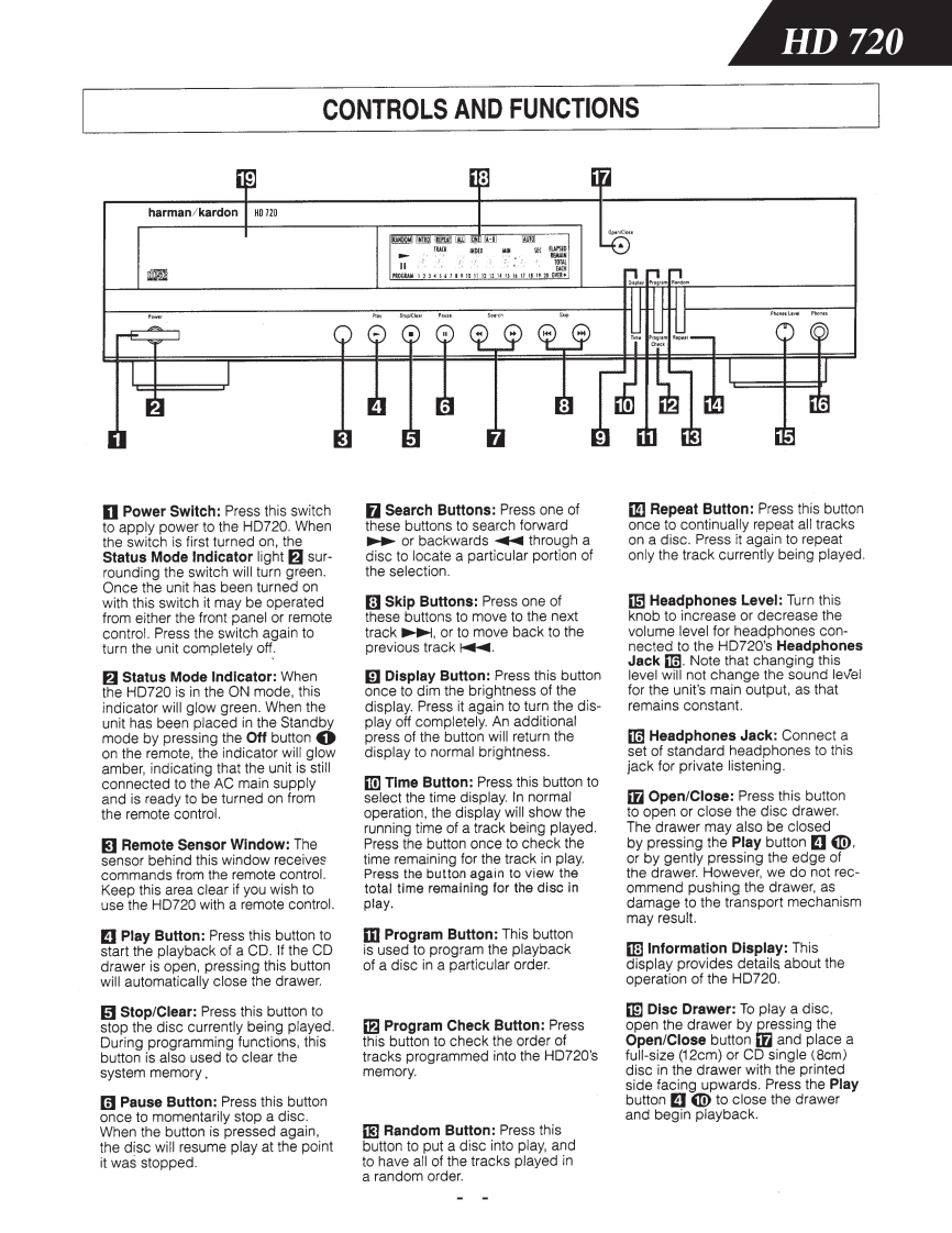 The harman kardonModel HD 720Manual ACOMPACT DISC PLAYERTechnical Manualharman/kardon2017623¥o四O⊙⊙⊙⊙⊙⊙⊙O◎120v.............for U.S.A.230V................for EURCONTENTSSPECIFICATIONS…2REMOTE CONTROL SCHEMATIC DIAGRAM.......35SAFETY PRECAUTIONS…3ELECTRICAL PARTS LIST..........36CONTROLS AND FUNCTIONS...5FUNCTIONAL BLOCK DIAGRAM40DISASSEMBLY PROCEDURES.....9WIRING DIAGRAM…41POWER CORD REPLACEMENT............9SCHEMATIC DIAGRAM…42TROUBLE SHOOTING…10P.C.BOARDS…46IC TERMINAL FUNCTIONS16EXPLODED VIEW…47CIRCUIT DESCRIPTION.....................20CD MECHANISM EXPLODED VIEW…·48IC BLOCK DIAGRAMS…31PACKING DRAWING…49harman/kardonParts and Service Office250 Crossways Park Dr.Woodbury,N.Y.117971112-HD720 0998 Printed In JAPANCEC6P20068030