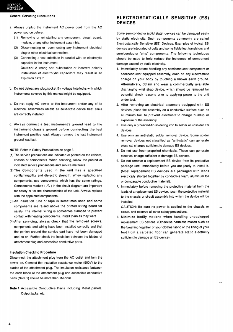 The Harman KardonModel HD7325/HD7225AManual 192ACOMPACT DISC PLAYERTechnical Manualharman/kardon HD7325m日明明阳The following marks found in the parts list of this manual identify the models asfollows:HD7325North America area model Black versionHD7225A/HD7325BInternational model Black versionHD7225A/HD7325International modelCONTENTSSPECIFICATION+…|C BLOCK DIAGRAMS*+…24SAFETY PRECAUTIONS..........................CD MECHANISM EXPLODED VIEW....27CONTROLS AND FUNCTIONS....5CD MECHANISM PARTS LISTDISASSEMBLY PROCEDURES...................>GENERAL UNIT44…28POWER CORD REPLACEMENT.....7GENERAL UNIT PARTS LIST.........................29ADJUSTMENT PROCEDURE.......8P.CnB0ARDS…30TROUBLE SHOOTING.........10ELECTRICAL PARTS LIST.............31IC TERMINAL FUNCTIONSWIRING DIAGRAM..............................................35CIRCUIT DESCRIPTION................19SCHEMATIC DIAGRAMS..............36harman/kardonParts and Service Office80 Crossways Park West,Woodbury.N.Y.117971112-0570A152 A9403 1500 Printed in Japan