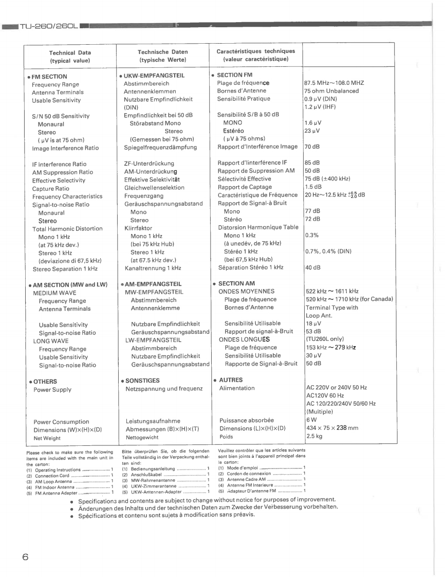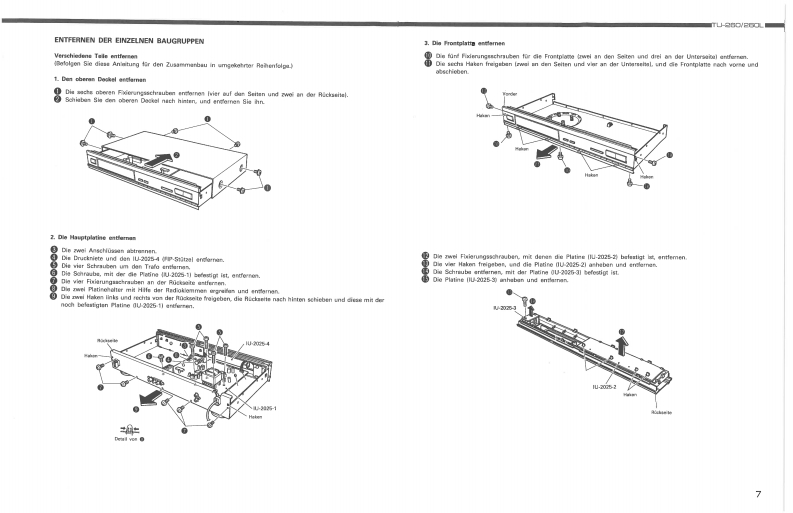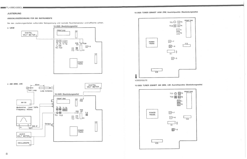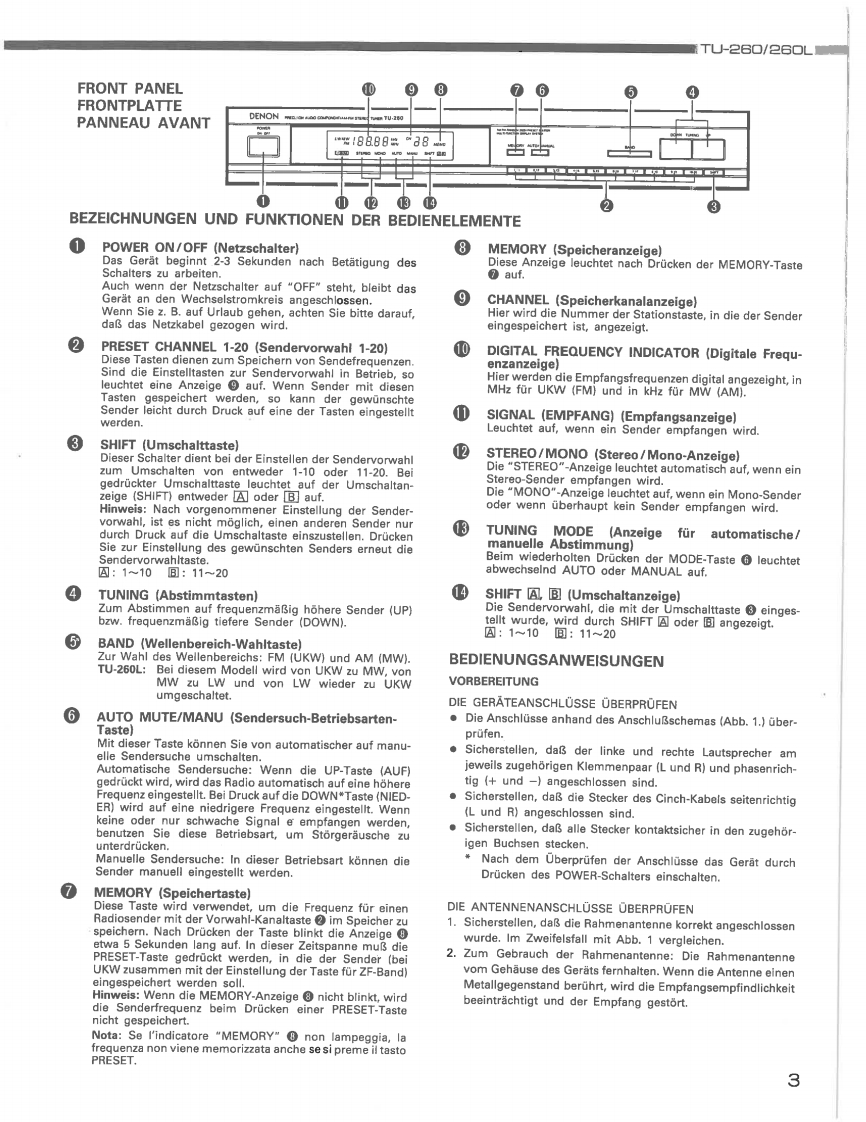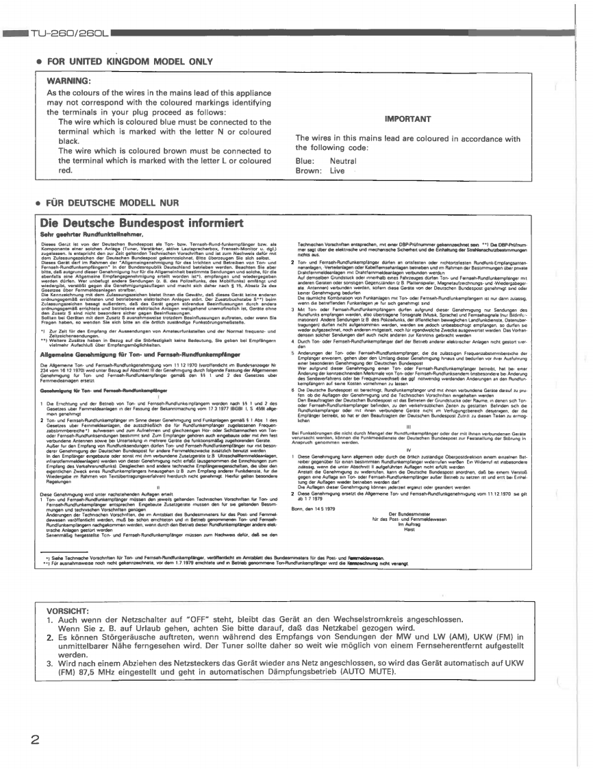 DENONHi-Fi AM-FM Stereo TunerWARTUNGSANLEITUNGTYP TU-26▣/26OLTU-2602-BAND (AM-UKW)STEREO TUNERTU-260L3-BAND (LW-MW-UKW)STEREO TUNERDENON~0258m“50二INHALTSVERZEICHNISBEDIENUNGSANLEITUNG.26ENTFERNEN DER EINZELNEN BAUGRUPPEN....................JUSTIERUNG78,9BLOCKSCHALTBILD......HALBLEITER.9ANMERKUNGEN ZUR TEILELISTE,10…11TEILELISTE FUR DIE PLATINENTUNER EINHEIT (Teileliste fur 2-Bandversion fur Modelle fur Europa und Australien.).......…11TUNER EINHEIT (Teileliste fur 2-Bandversion fur Modelle fur Kanadisches Modell.).................12TUNER EINHEIT (Teileliste fur 2-Bandversion fur Modelle fur Multi-spannung.)...........12TUNER EINHEIT(Teileliste fur 3-Bandversion fur Modelle fur Europa und GroBbritannien.)PLATINEN (BeschlichtunBseite)…13TUNER EINHEIT (far2 Band Typ.)...14TUNER EINHEIT (far 3 Band Typ...15EXPLOSIONSZEICHNUNG VON CHASSIS UND GEHAUSE16TEILELISTE DER EXPLOSIONSZEICHNUNG1718SCHALT PLAN (fur 2 Band Typ.)........19SCHALT PLAN (far3 Band Typ.).20NIPPON COLUMBIA CO.LTD