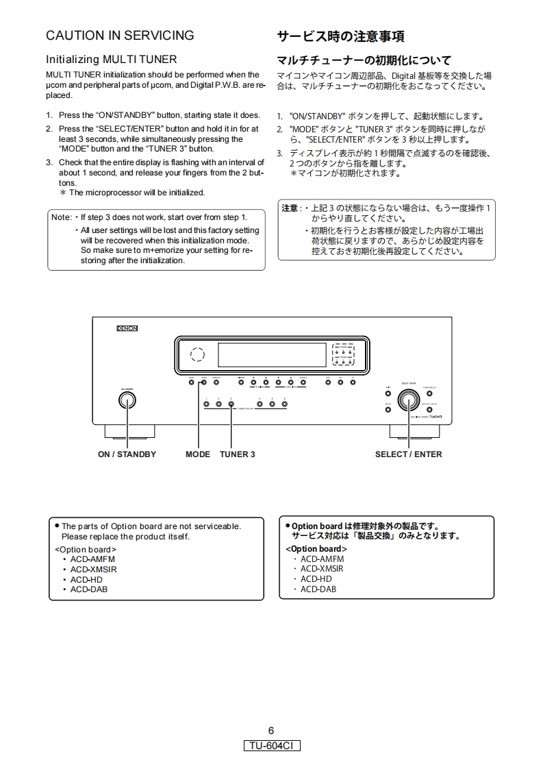 DENONVer.1SERVICE MANUALMODELJPE3E2EKE2AE1CE1KEUTTU-604CIAM-FM/XM MULTIPLE TUNER注意圹一上又在方乙春前(、乙0片一上又又二1了儿在必寸方蔬〈龙过。本機志、火災、感電、付州存仁对寸石安全性在確保寸石左忆、志龙ま存配慮卷訪乙存一乙方)、未左法的忙体「電氨用品安全法」忙屯上老、所定)許可在得(製造过九乙方求寸。徙(圹一上又在茄乙春際:、乙九5仞安全性雜持志九石太ラ、乙)片一上又又二1了儿記载志九(小石注意事項在必寸守)〈龙这。For purposes of improvement,specifications and·本機)仕横性能改良)大饮、予告存〈变更寸石乙匕design are subject to change without notice.5莎)李寸。·補修用性能部品)保有期間:、製造打切後8年℃寸。Please use this service manual with referring to the修理)際太、必才取极锐明害卷参照)上、作業卷行一operating instructions without fail.(〈忙达U。Some illustrations using in this service manual are·本文中使用L(石亻与又卜体、脱明)都合上現物slightly different from the actual set.之多少異在局場合杨)ま寸。DENONDenon Brand Company,D&M Holdings Inc.X0369 V.01 DE/CDM 0805