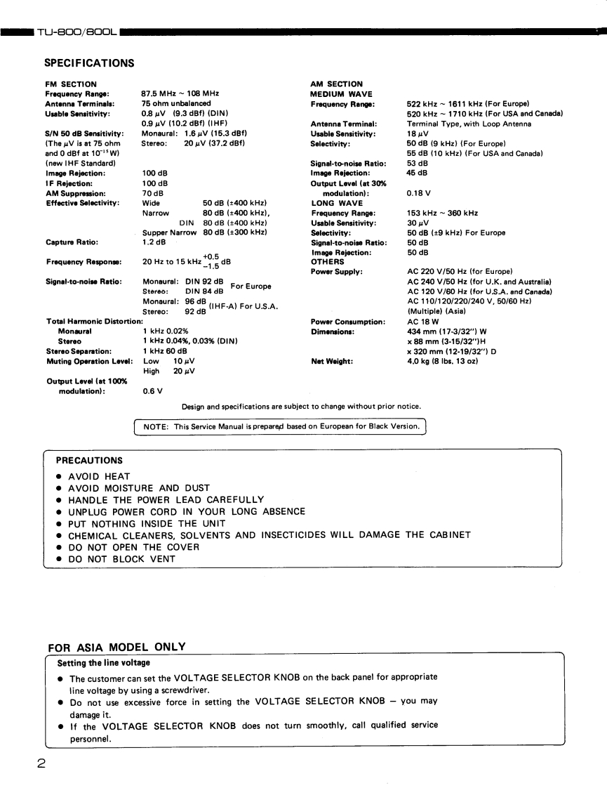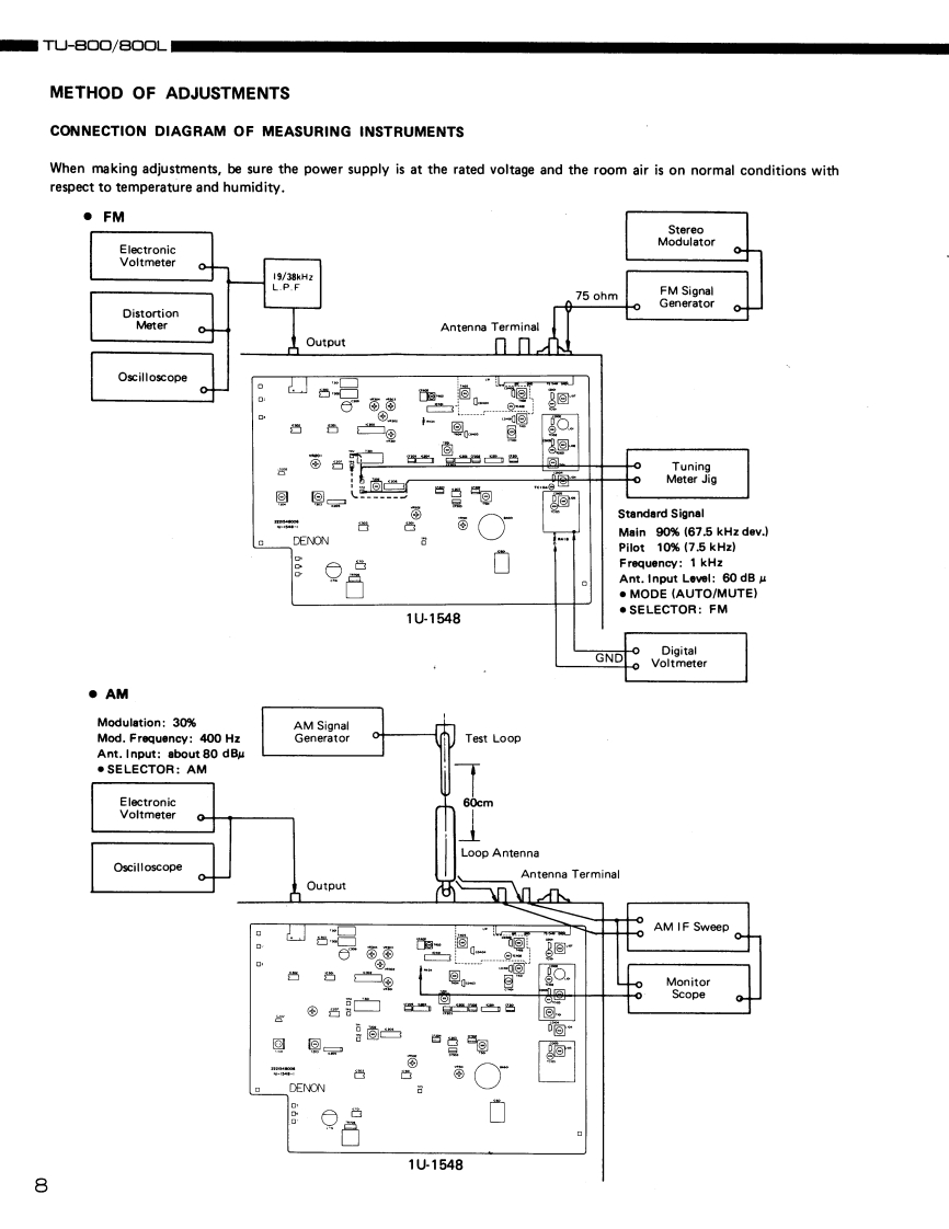 DENONHiFi Stereo AM-FM TunerSERVICE MANUALMODEL TU-BOO/B▣▣LTU-8002-BAND(AM-FM)STEREO TUNERTU-800L3-BAND(LW-MW-FM)STEREO TUNERCONTENTSSPECIFICATIONS..····.·····.FUNCTIONS OF PANEL CONTROLS3C0 NNECTIONS.·,,·············4~5BLOCK DIAGRAM··6REMOVAL OF EACH SECTION,,,,,··,,·..···.···:···,,···METHOD OF ADJUSTMENTS..··.···,·,8~9SEMICONDUCTORS1014SCHEMATIC DIAGRAM (for 2 BAND)15SCHEMATIC DIAGRAM (for 3 BAND)16WIRING DIAGRAM....·······.·,·,,··17PRINTED WIRING BOARD1U-1548 TUNER UNIT ...18,19SCHEMATIC DIAGRAM(DISPLAY UNIT)..,......·,··,··.·20PRINTED WIRING BOARDS AND PARTS LIST1U-1549 DISPLAY UNIT .21EXPLODED VIEW OF CHASSIS AND CABINET&PARTS LIST.·.·········,,,···.22~23PRINTED WIRING BOARD PARTS LIST,,,,·.·.···,.·,·,,,,·,·.·24~26CAUTIONS.......·29NIPPON COLUMBIA CO.,LTD.